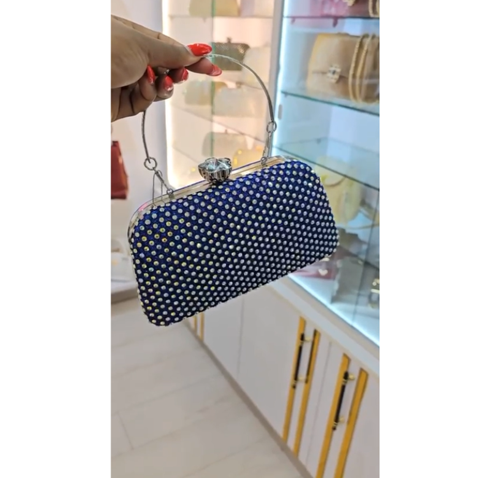 This captivating blue clutch is completely adorned with brilliant white crystals, creating a mesmerizing sparkle, and features a sleek metal frame with a central crystal clasp. It's the ultimate accessory for adding a vibrant burst of color and high-impact shimmer to any evening attire.