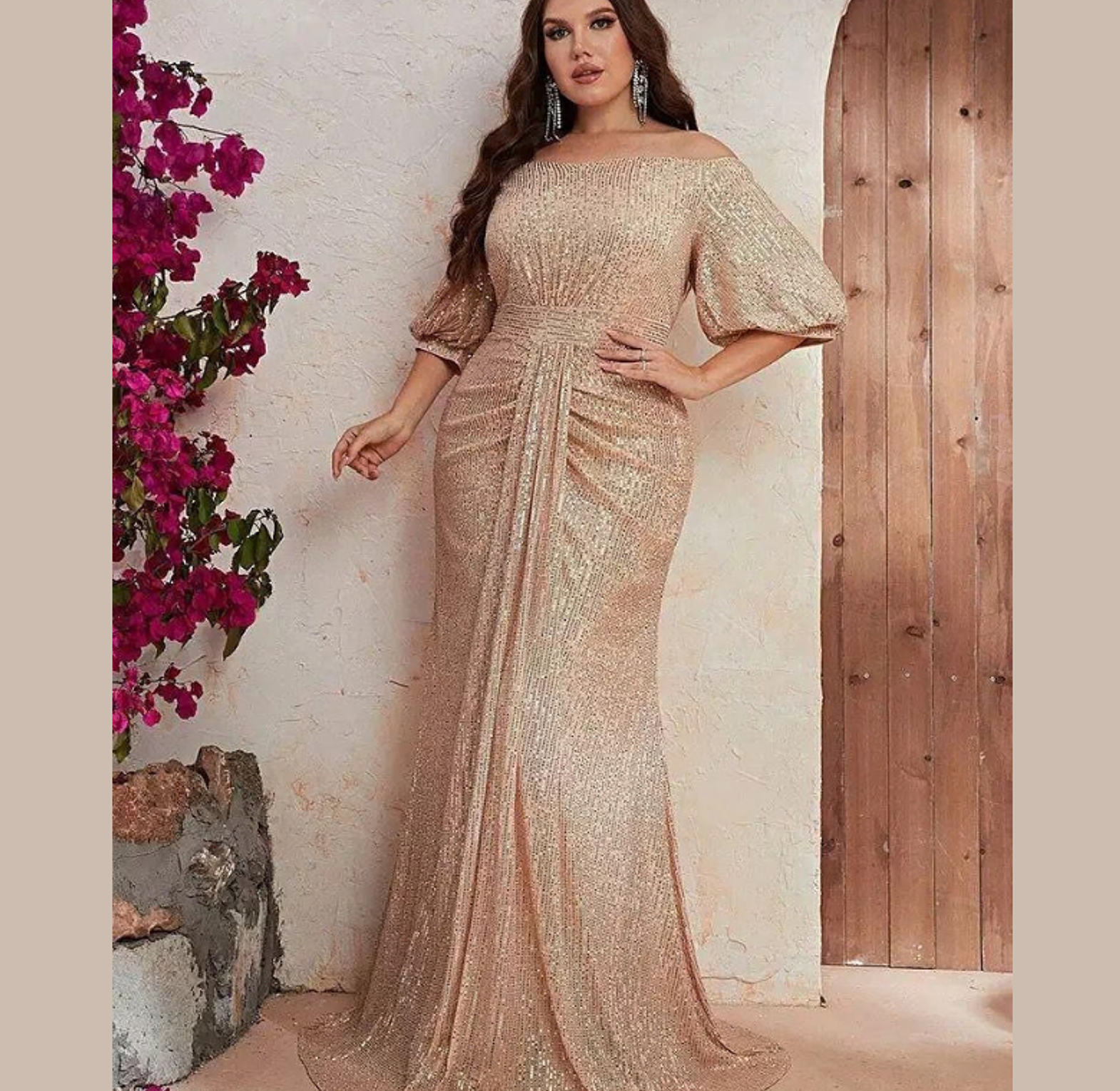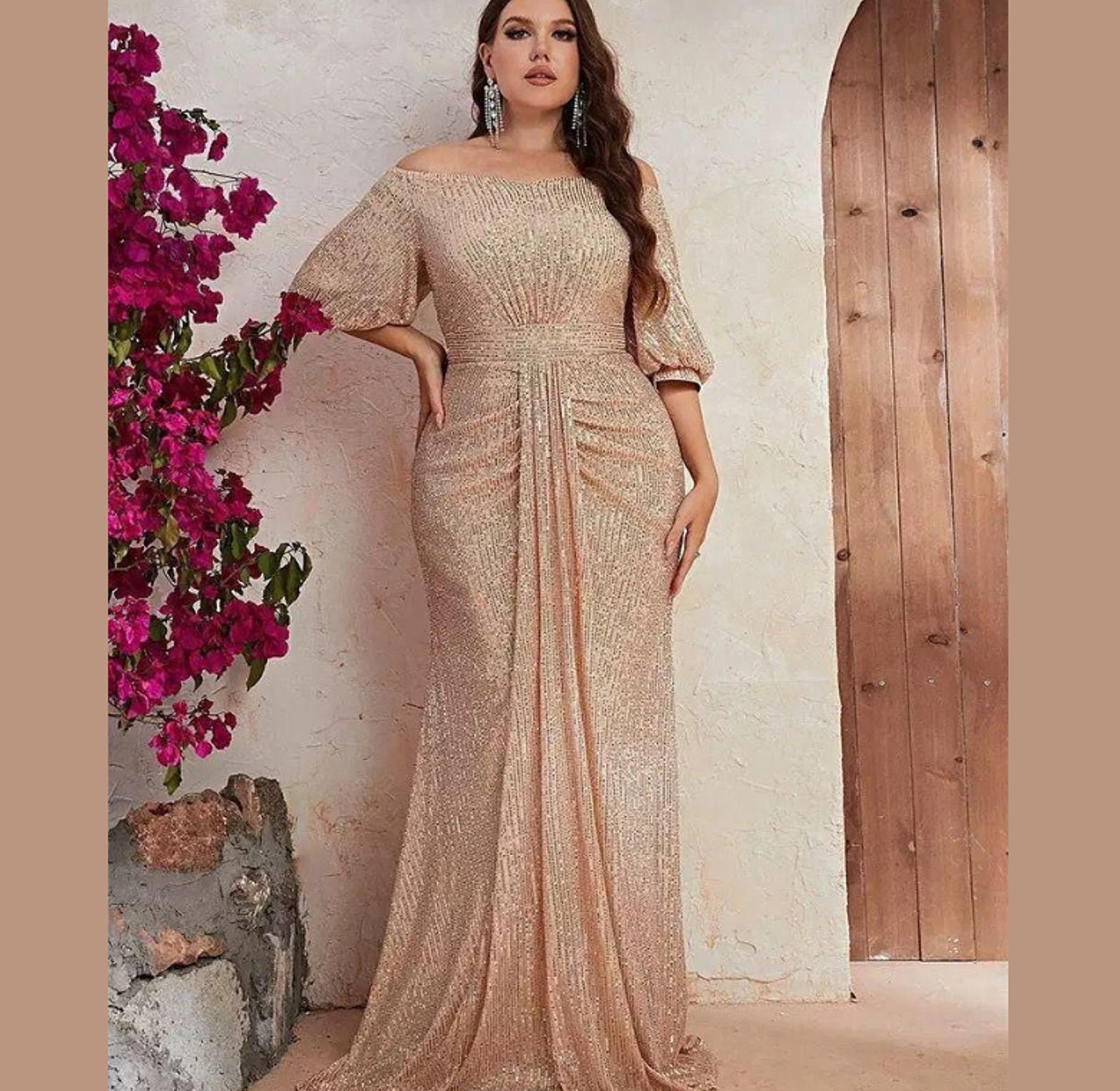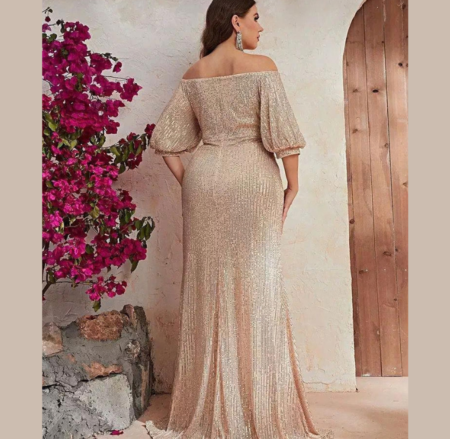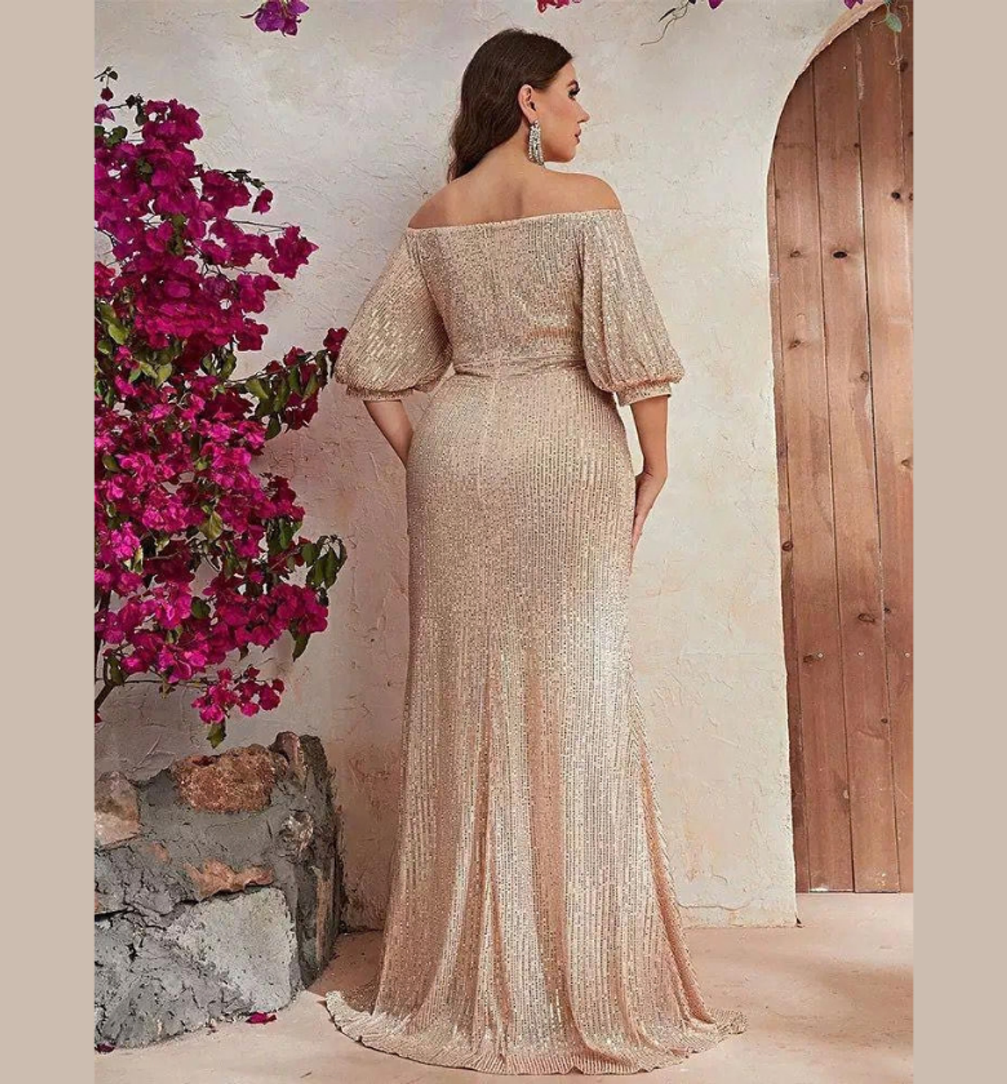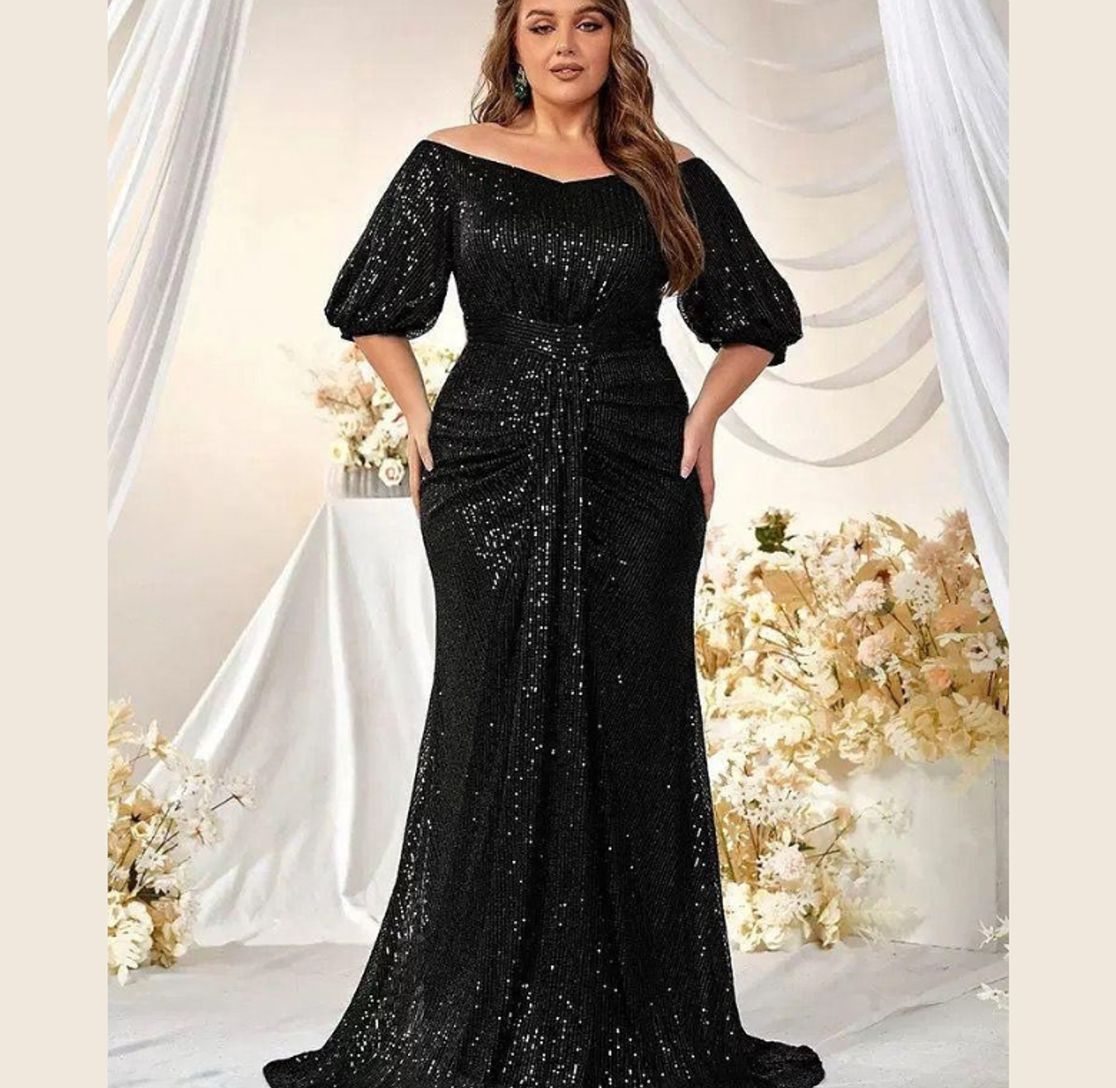 Step into the spotlight with the Seraphina Gown, a stylish dress designed for the woman who loves to shine. This elegant dress features a breathtaking off-the-shoulder neckline that beautifully frames the collarbone, while the puff sleeves add a touch of vintage-inspired romance. Crafted with intricate sequin detailing, this women’s dress catches the light from every angle, ensuring you remain the center of attention all night long. The gathered waist and floor-length skirt create a statuesque look that celebrates your natural curves with a high-fashion edge.