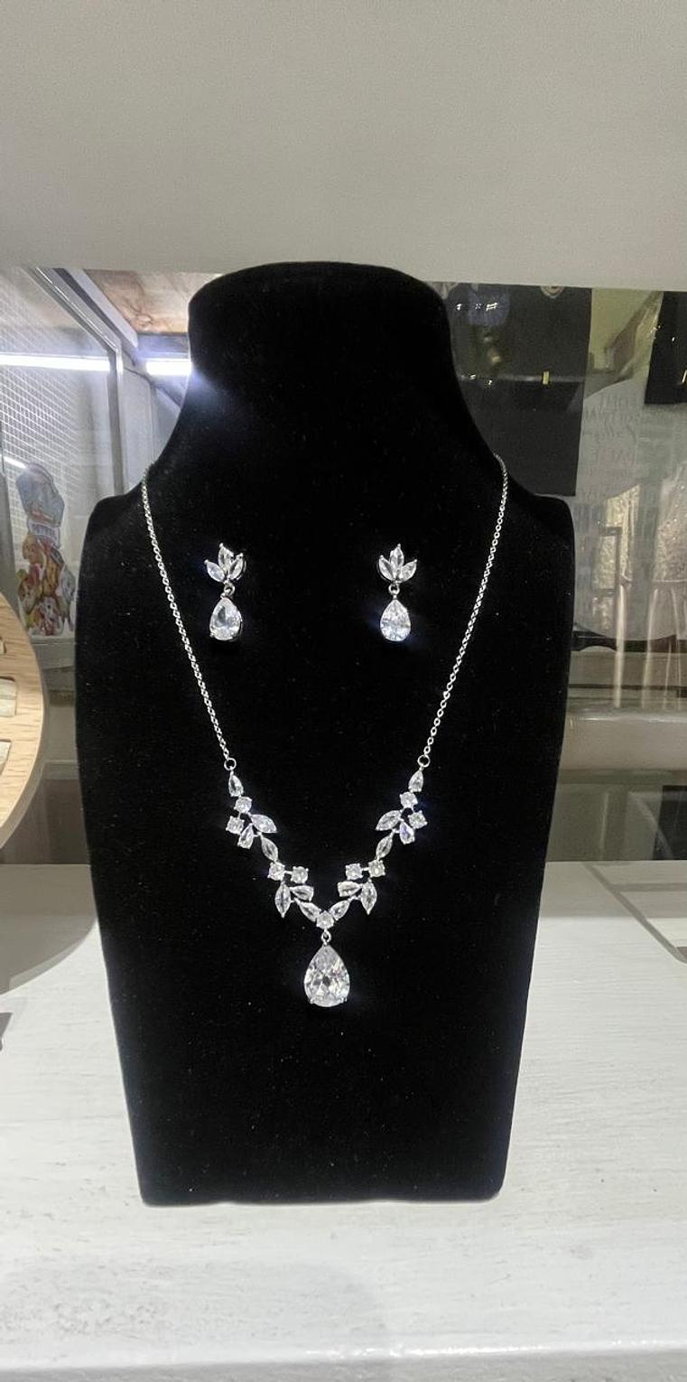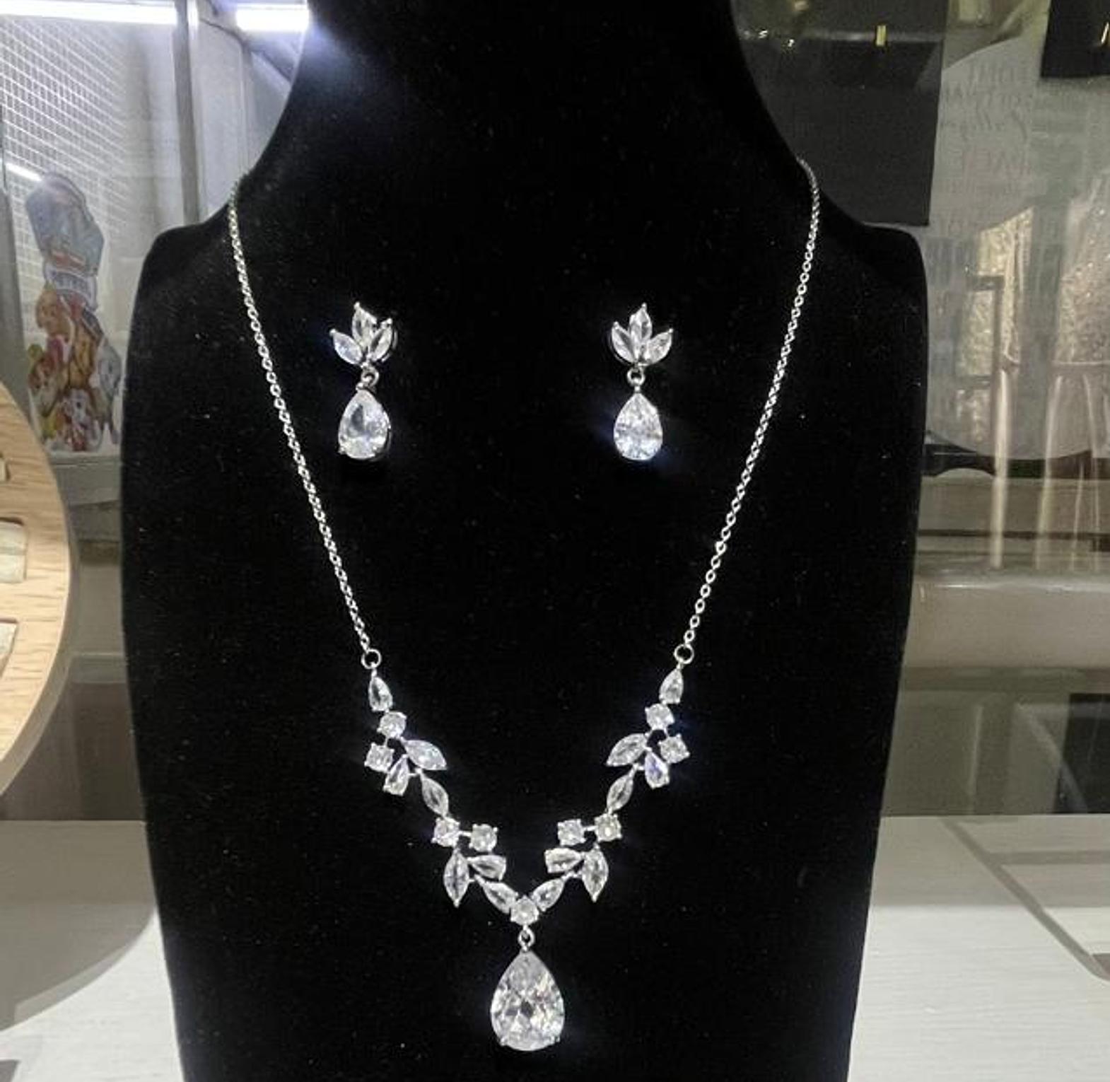 This magnificent jewelry set features a delicate, vine-like cascade of marquise-cut stones leading to a brilliant pear-drop pendant. The coordinating earrings perfectly mirror the graceful, nature-inspired sparkle of the necklace.