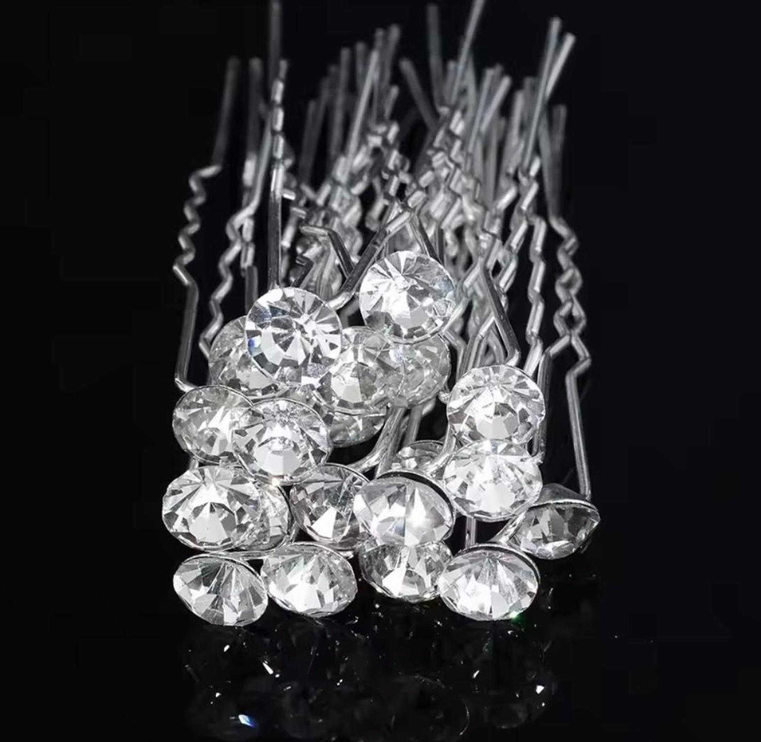 These brilliant hair pins each feature a large, multifaceted crystal that captures and reflects light with diamond-like intensity. They are the ultimate accessory for injecting concentrated sparkle and luxurious shimmer into any formal updo. 3 pins for 100