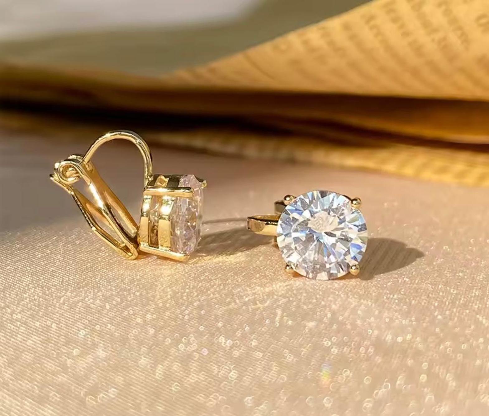 These versatile clip-on earrings feature a brilliant, round-cut solitaire stone set in a classic four-prong setting. Designed for comfortable wear without piercing, they deliver maximum sparkle and timeless elegance.