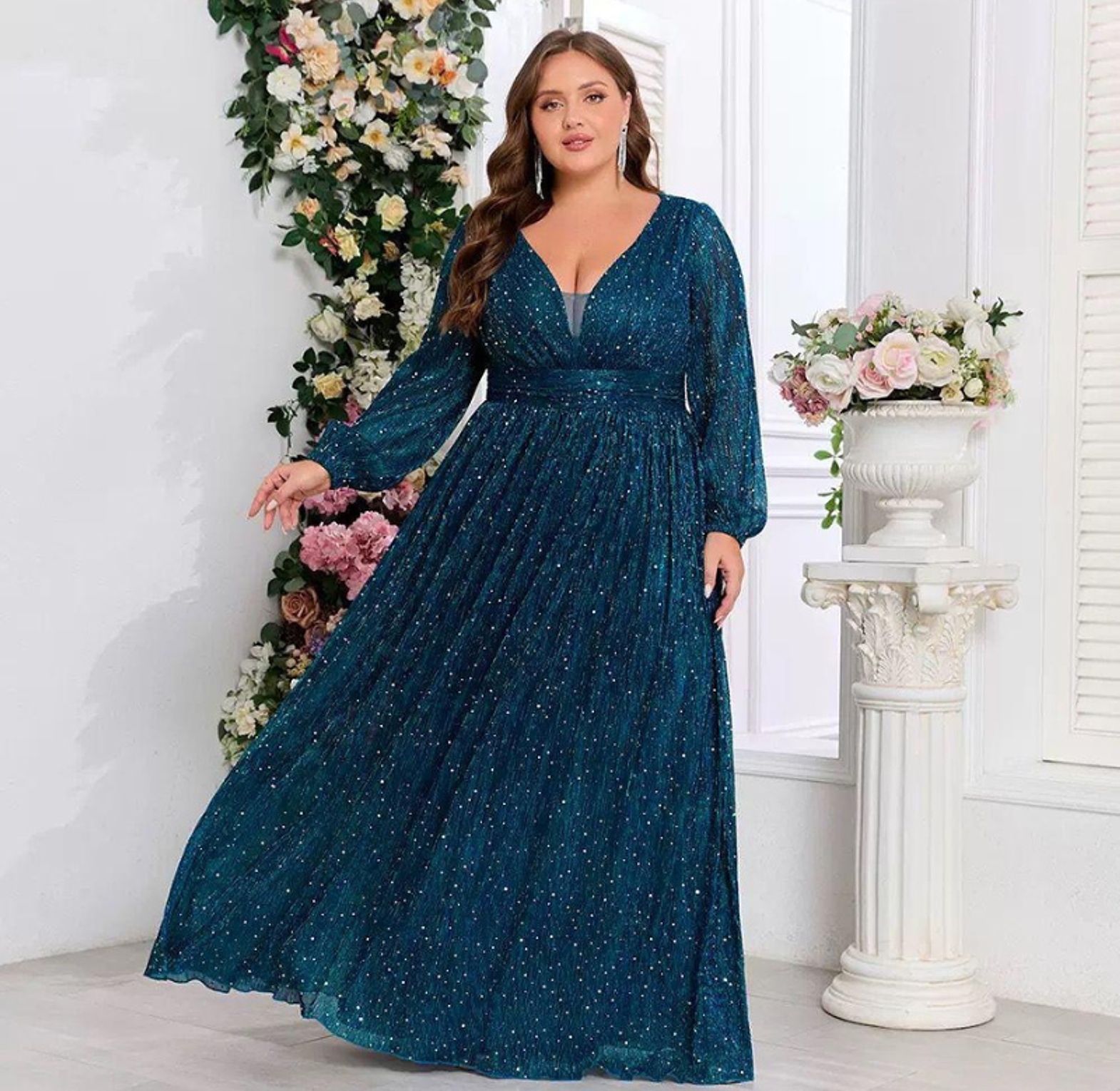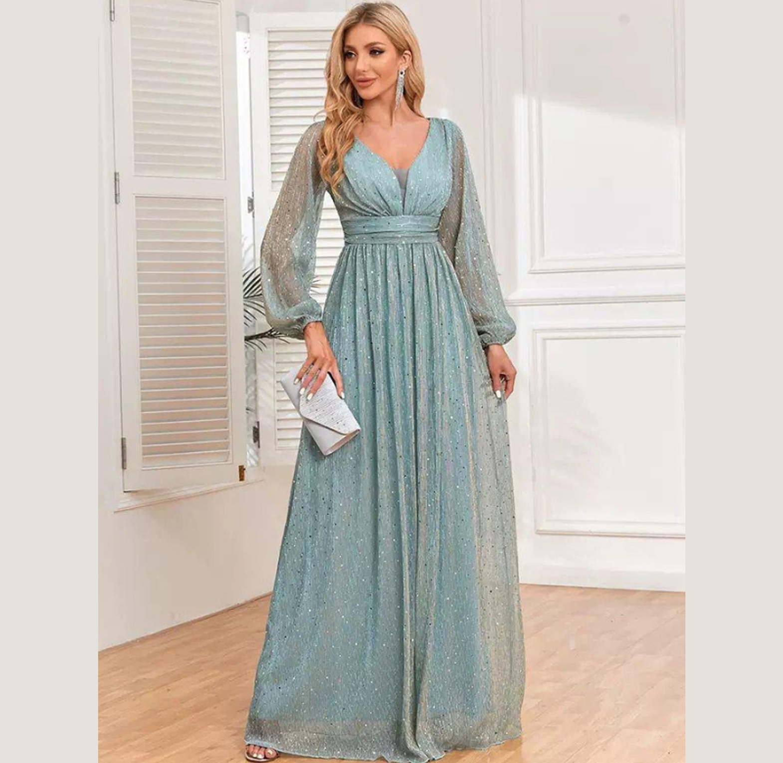 This ethereal maxi dress features a stunning A-line silhouette with sheer, voluminous balloon sleeves and a delicate overall glitter sparkle. The elegant, draped V-neck bodice and flowing skirt create a romantic, figure-flattering look perfect for evening wear.