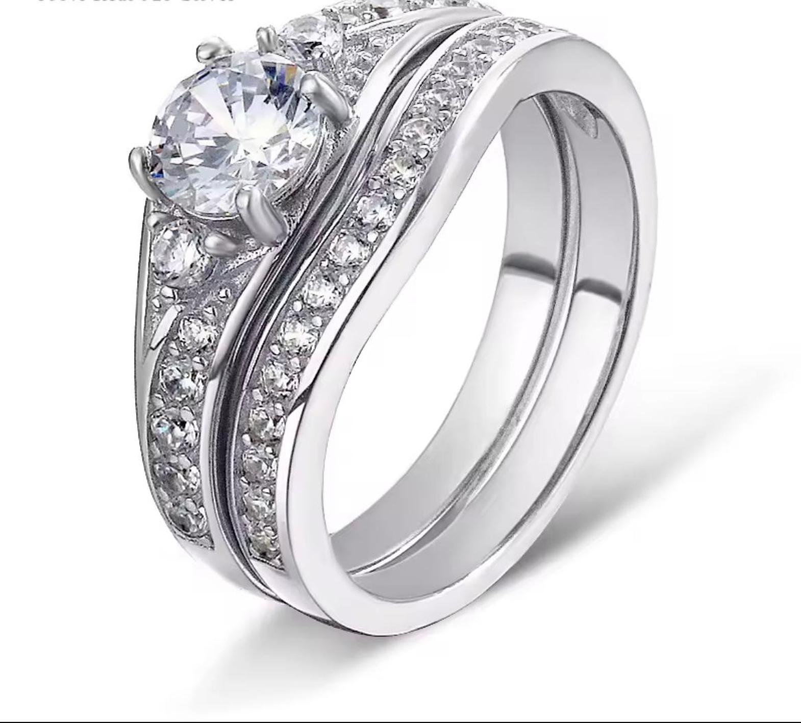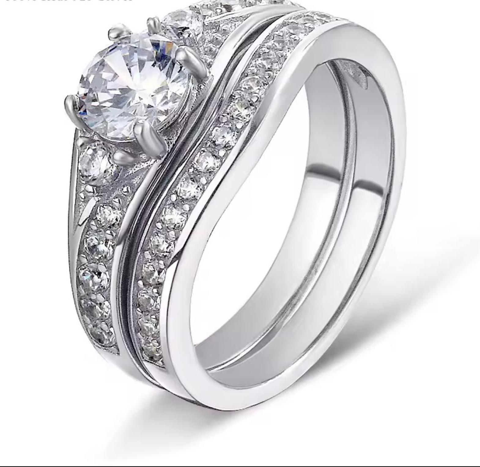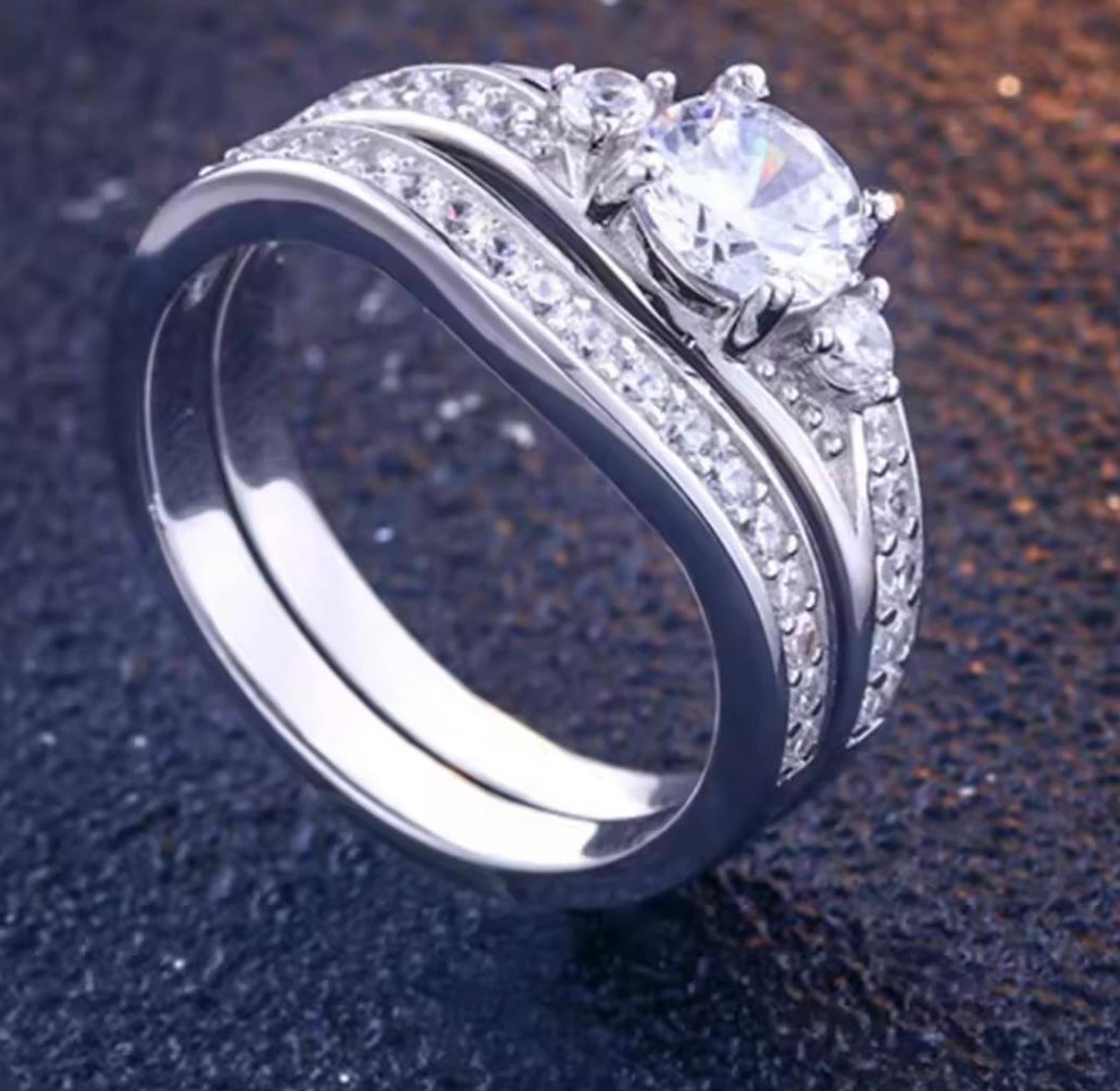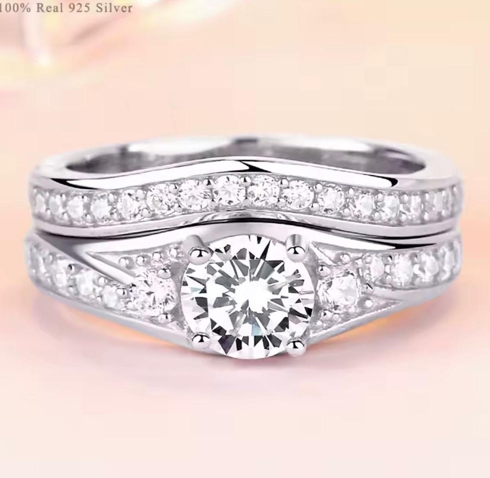 Radiate elegance with this stunning 2-in-1 pure silver bridal set, featuring a brilliant round-cut center stone and graceful, wave-inspired pavé bands. This high-shine duo offers a fluid, romantic design that captures the essence of modern luxury.