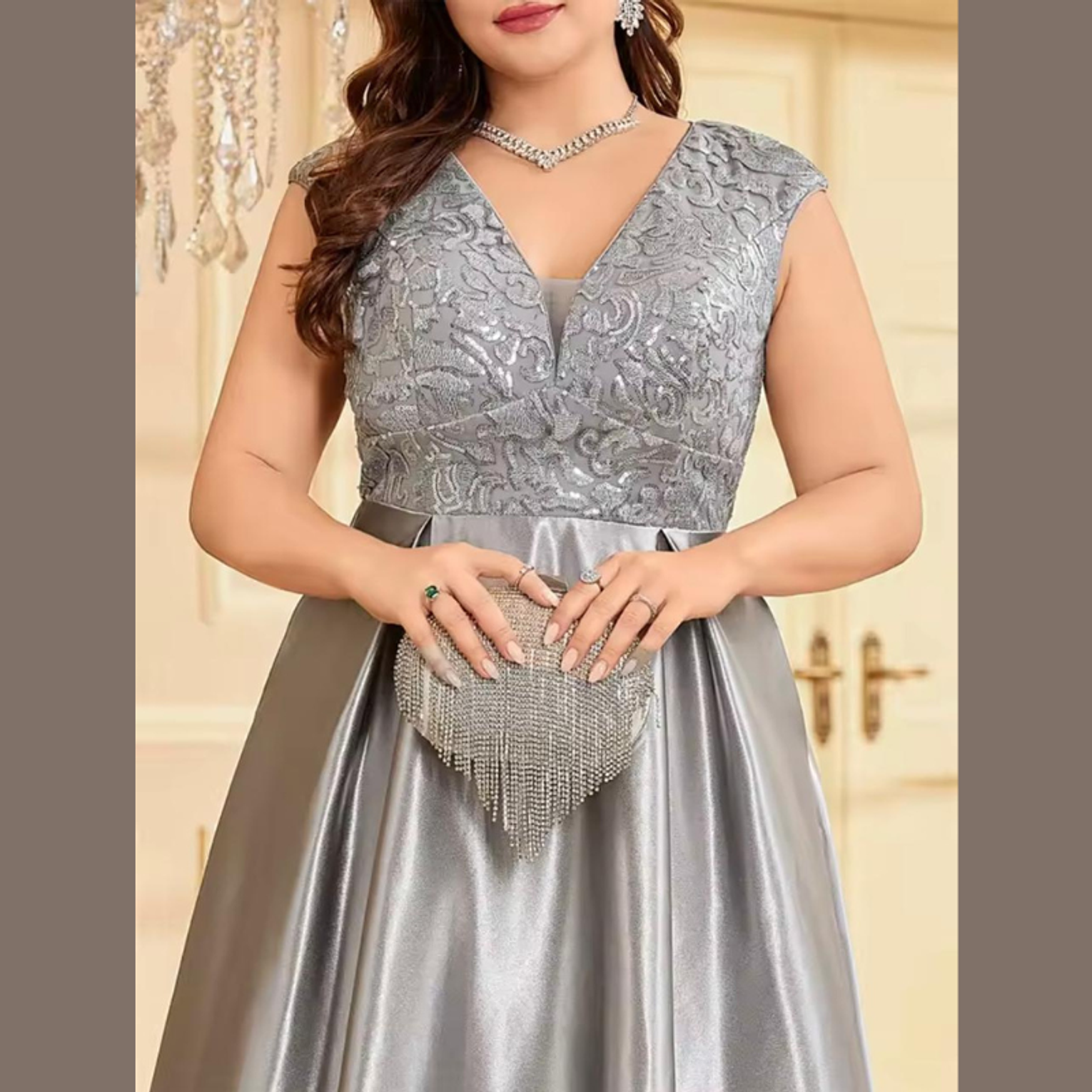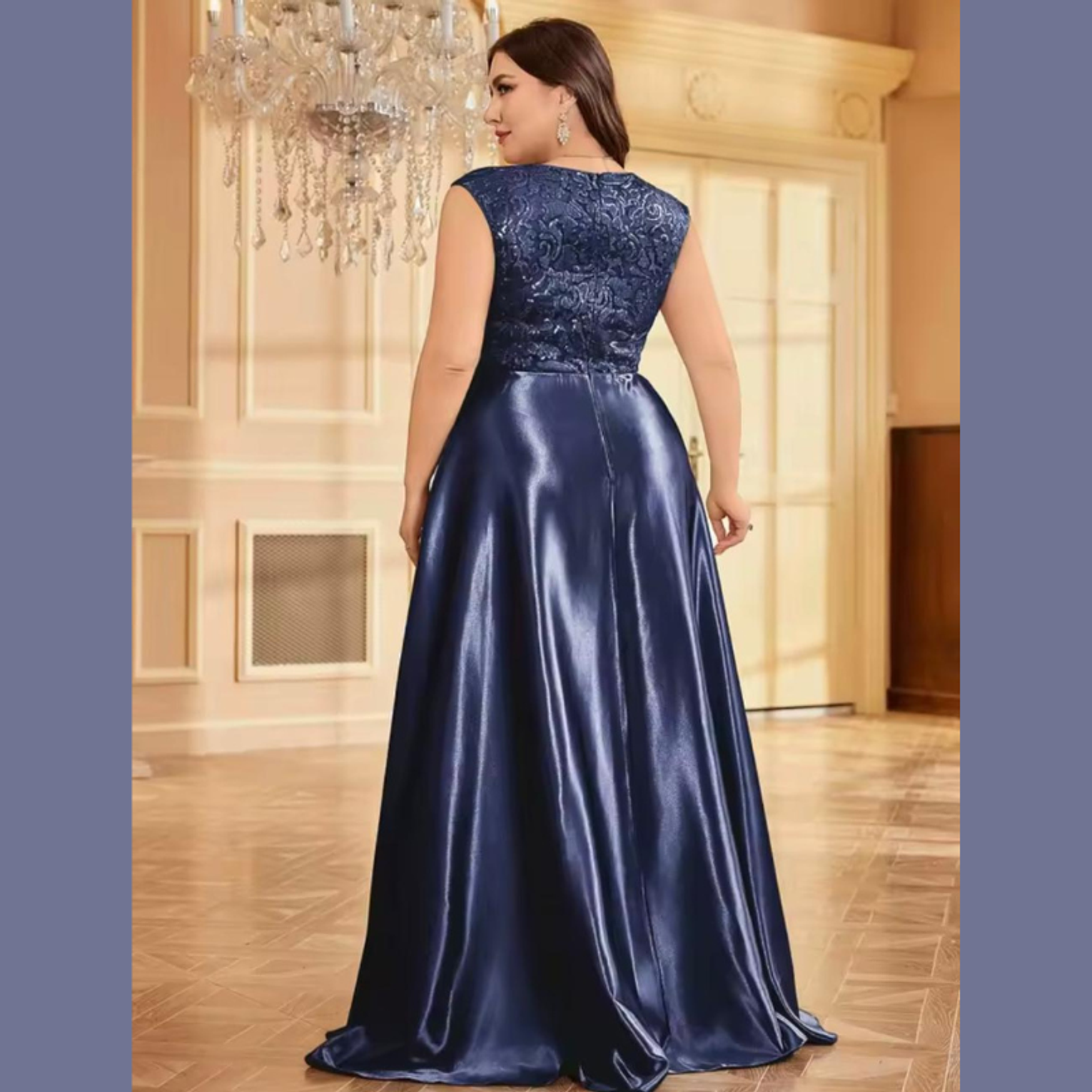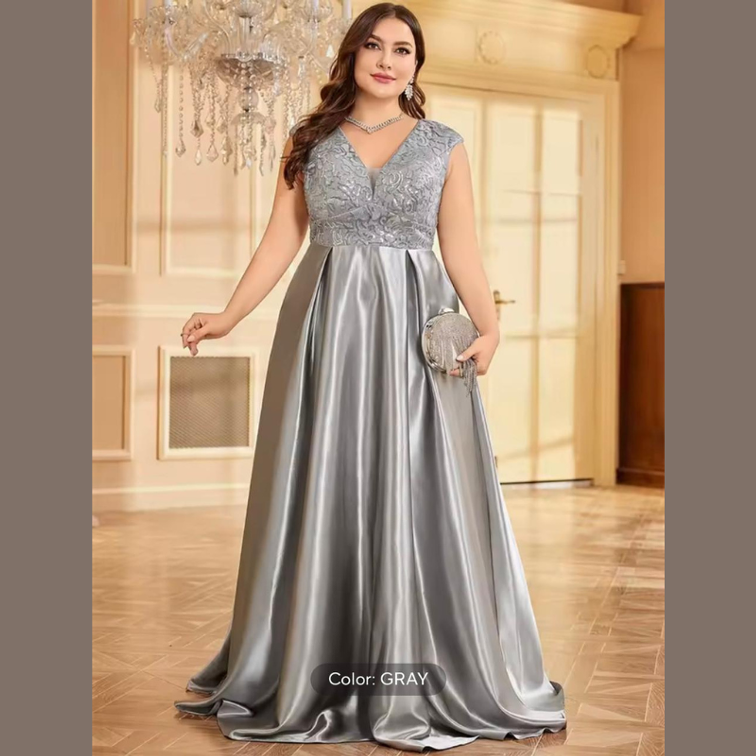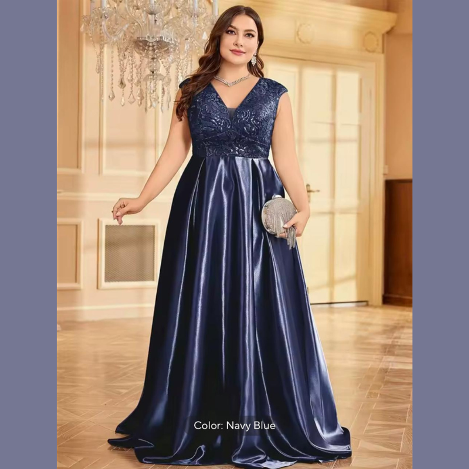 This magnificent gown features a luxurious, high-sheen satin A-line skirt perfectly contrasted with a finely textured lace-effect bodice. The classic V-neck silhouette offers a timeless, sophisticated glamour for any formal event.