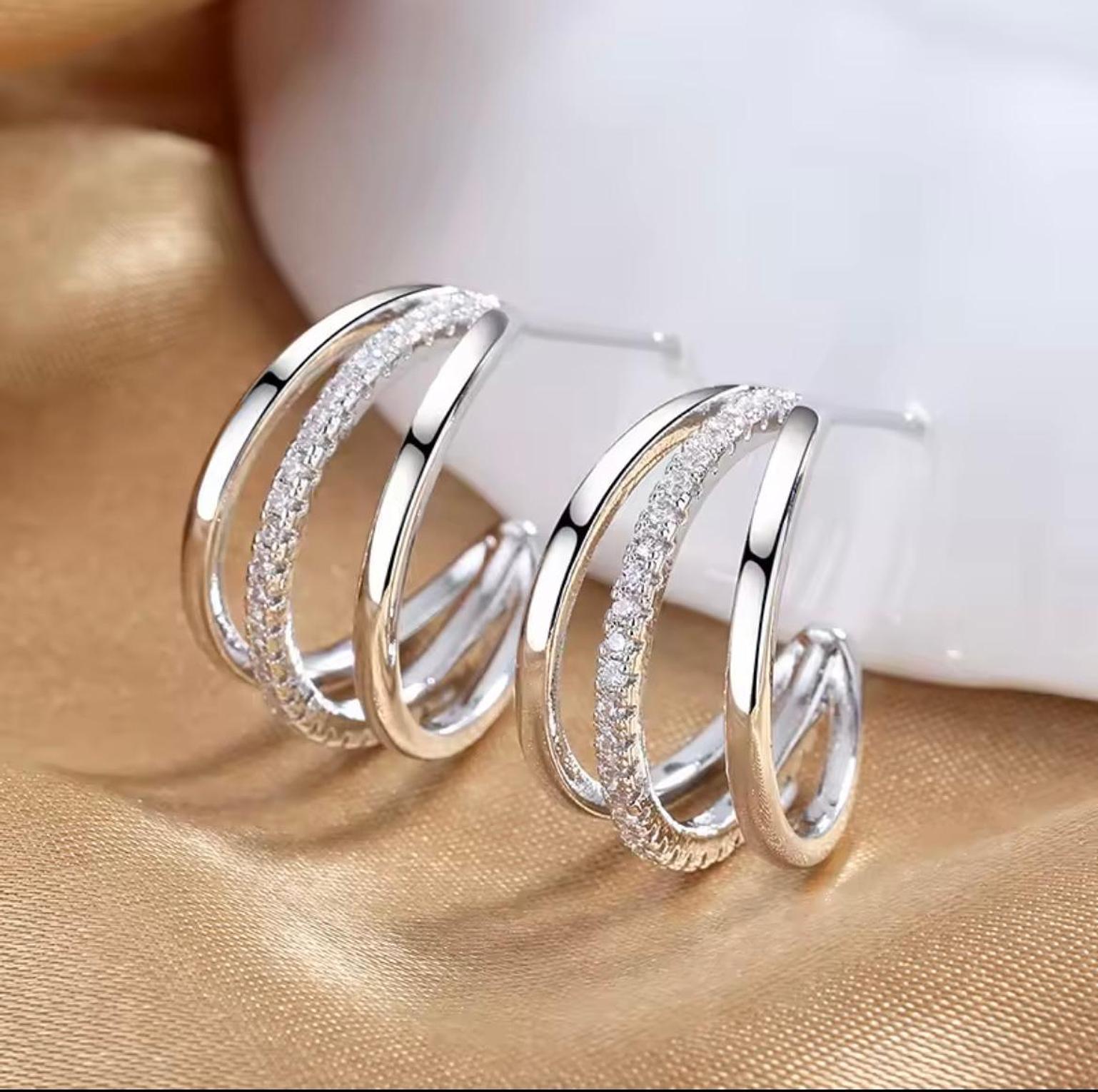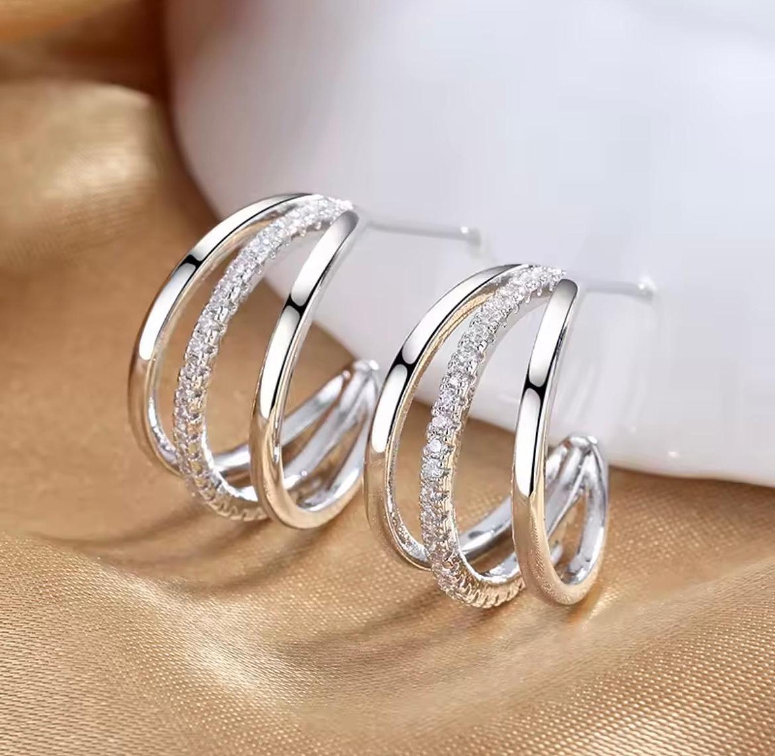 These striking hoops feature a sophisticated triple-band design, pairing sleek, polished silver tones with a dazzling pave-set center. They offer a refined, layered look that delivers maximum sparkle and modern dimension.