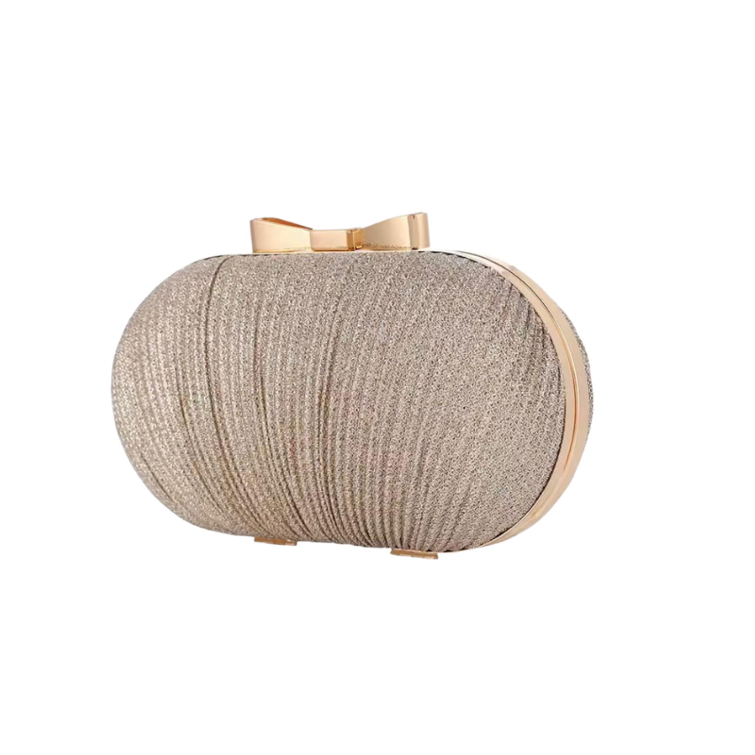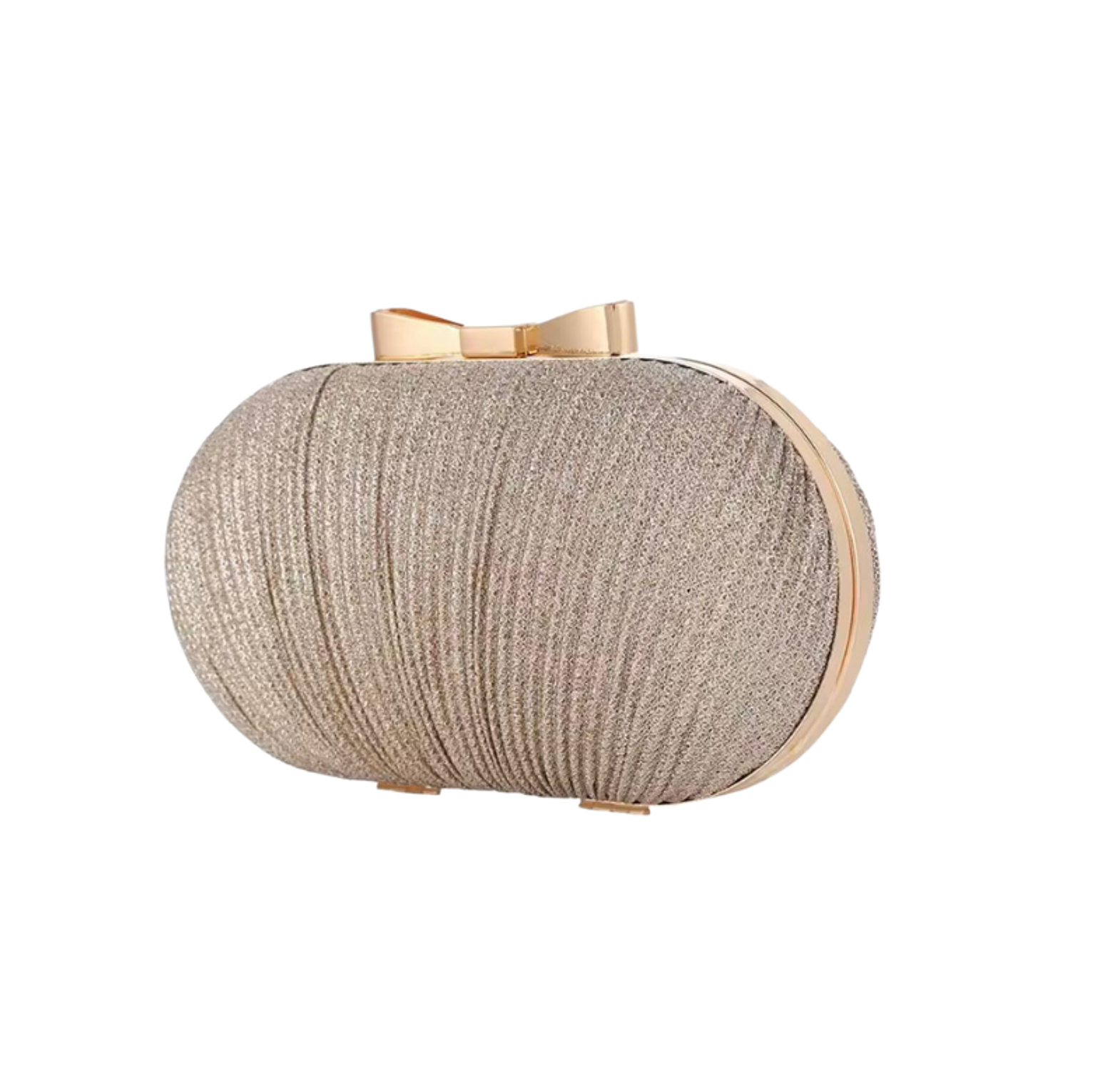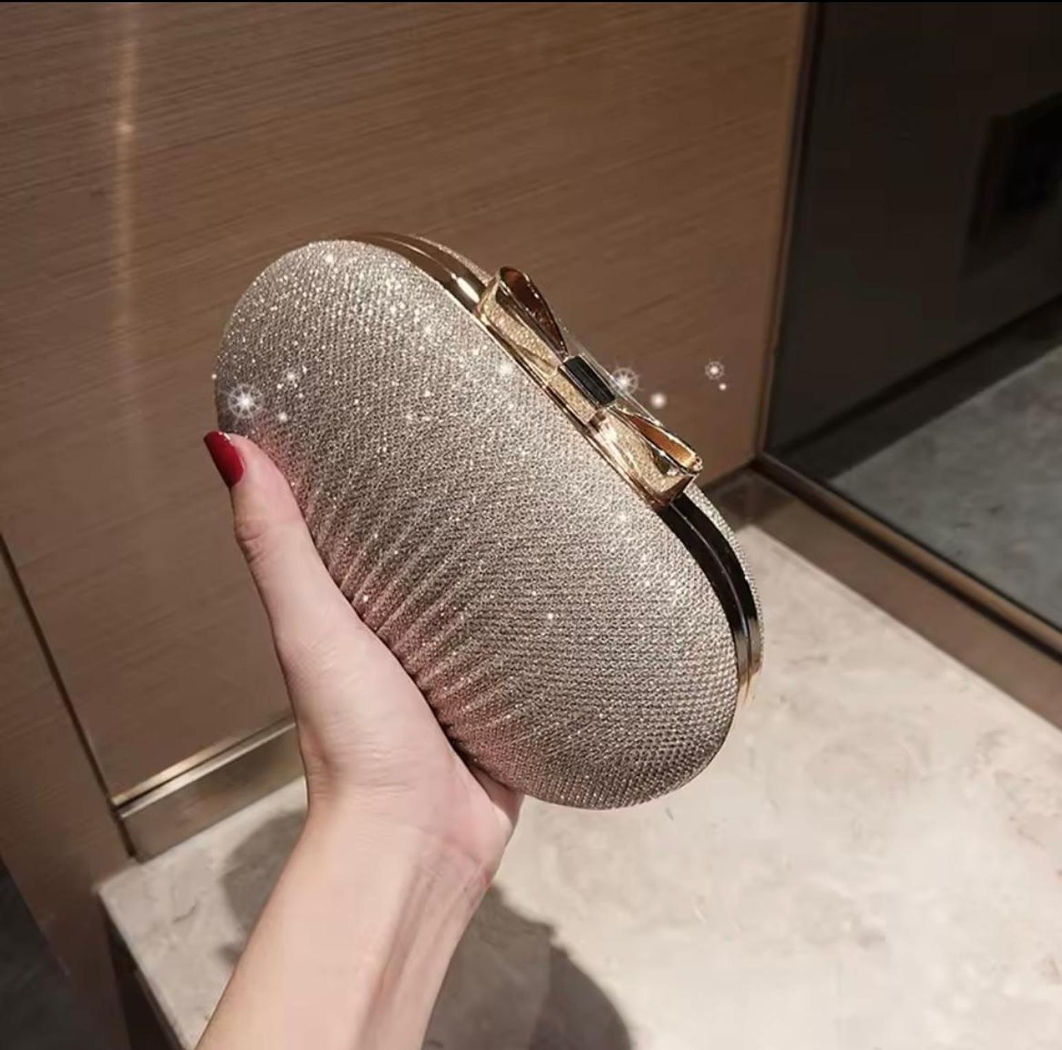 This chic, oval clutch is completely covered in radiant gold glitter and features a smooth, gold-toned frame topped with a distinctive bow clasp. It's the perfect accessory for adding dazzling metallic brilliance and a feminine touch to any formal ensemble