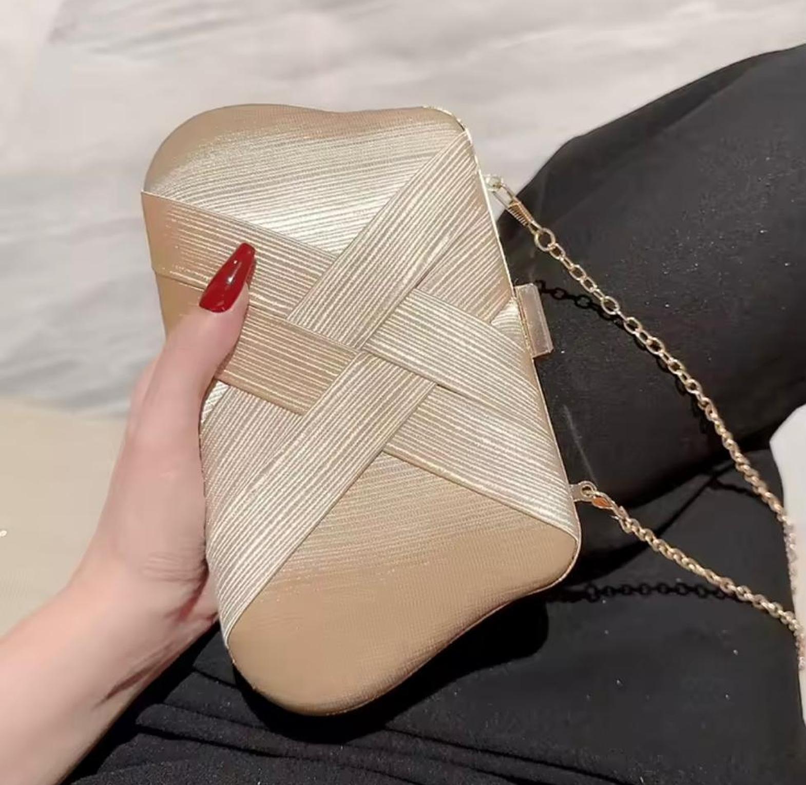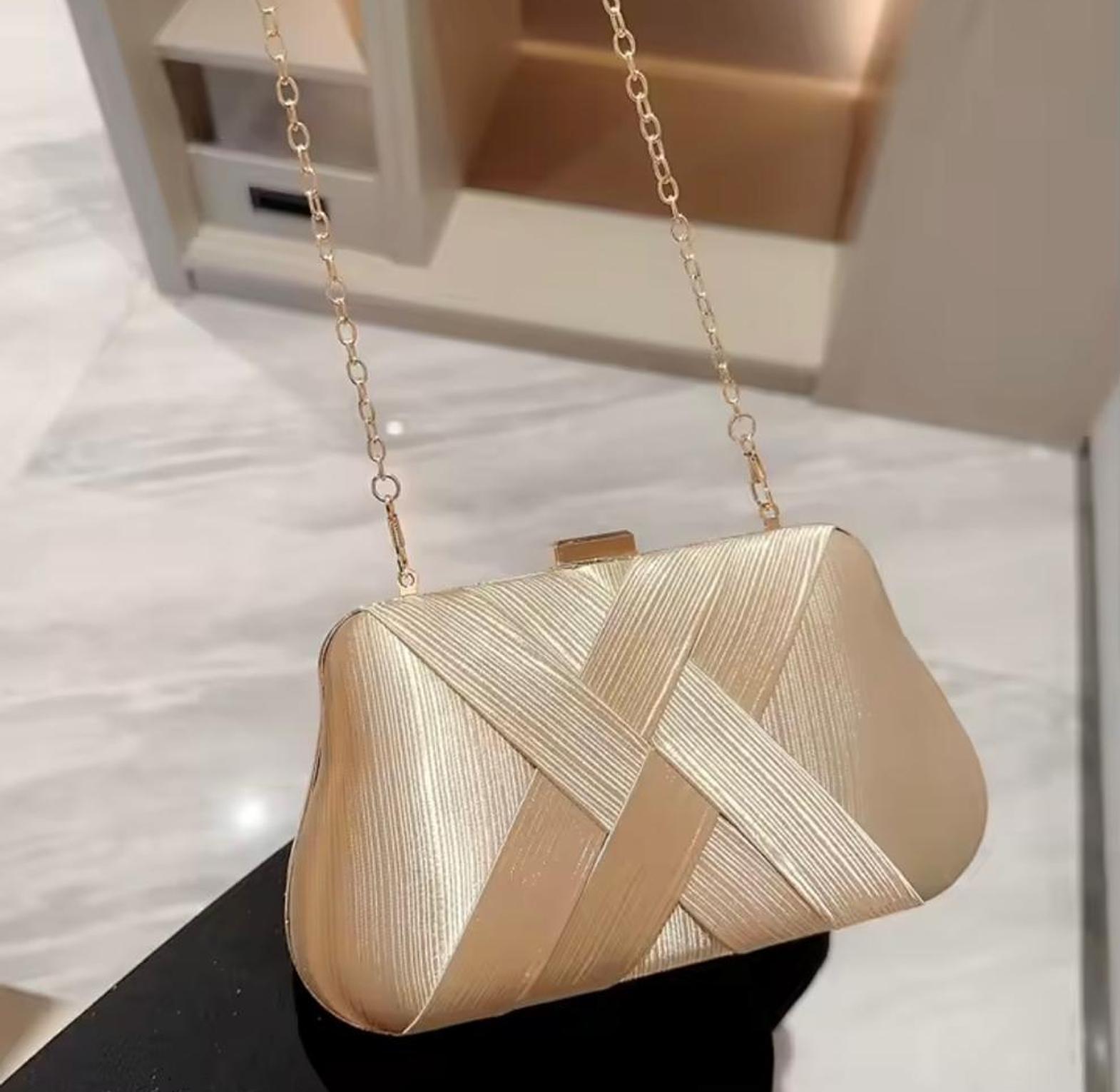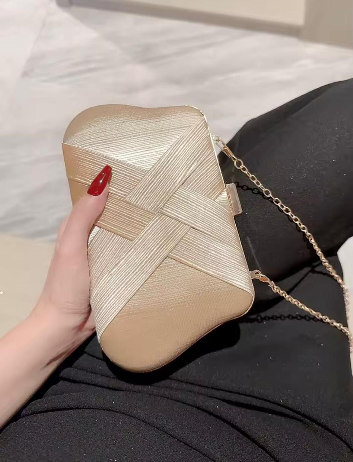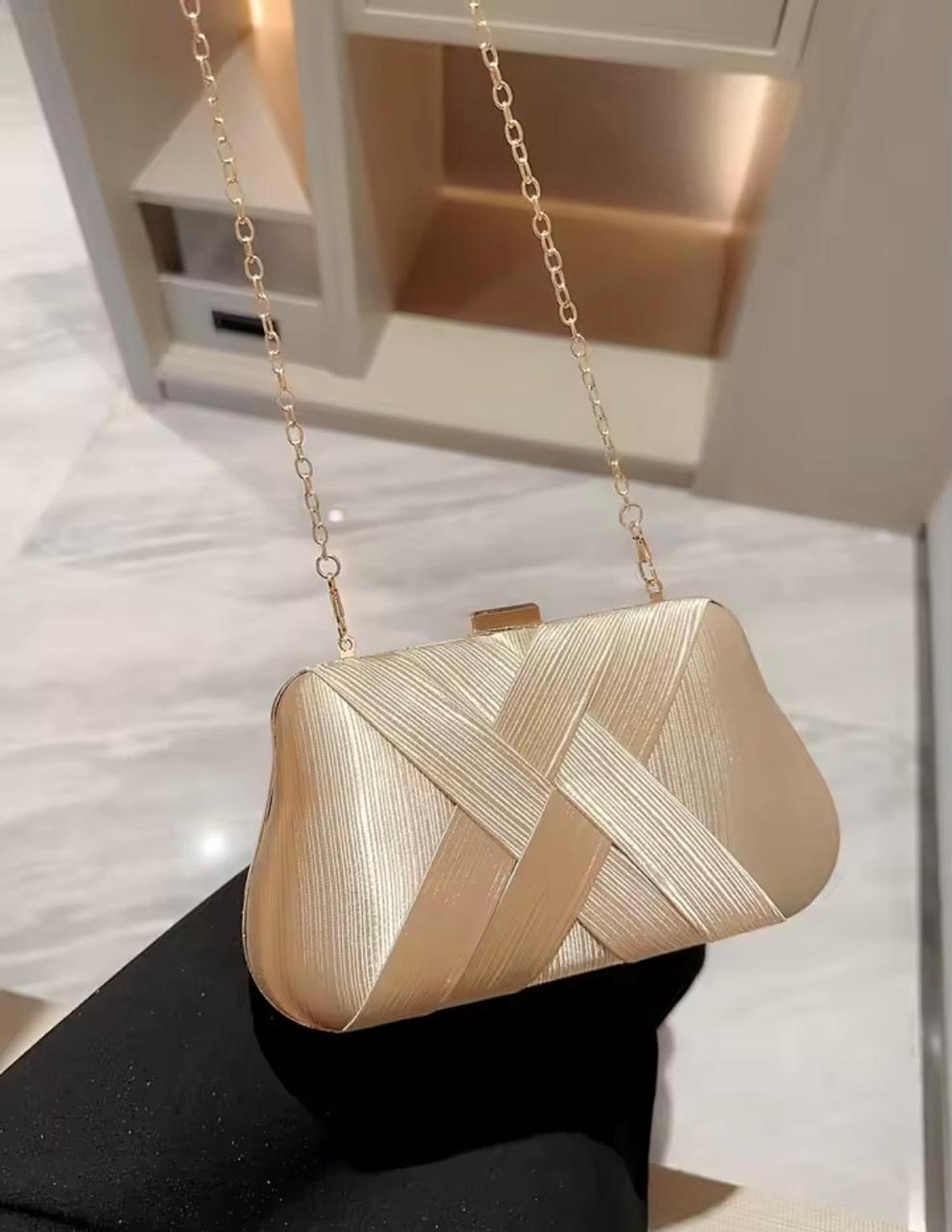 This stunning gold clutch features a unique, textured criss-cross fabric pattern and an elegant gold chain strap. It's the perfect statement accessory for adding metallic texture and sophisticated warmth to any formal evening look.