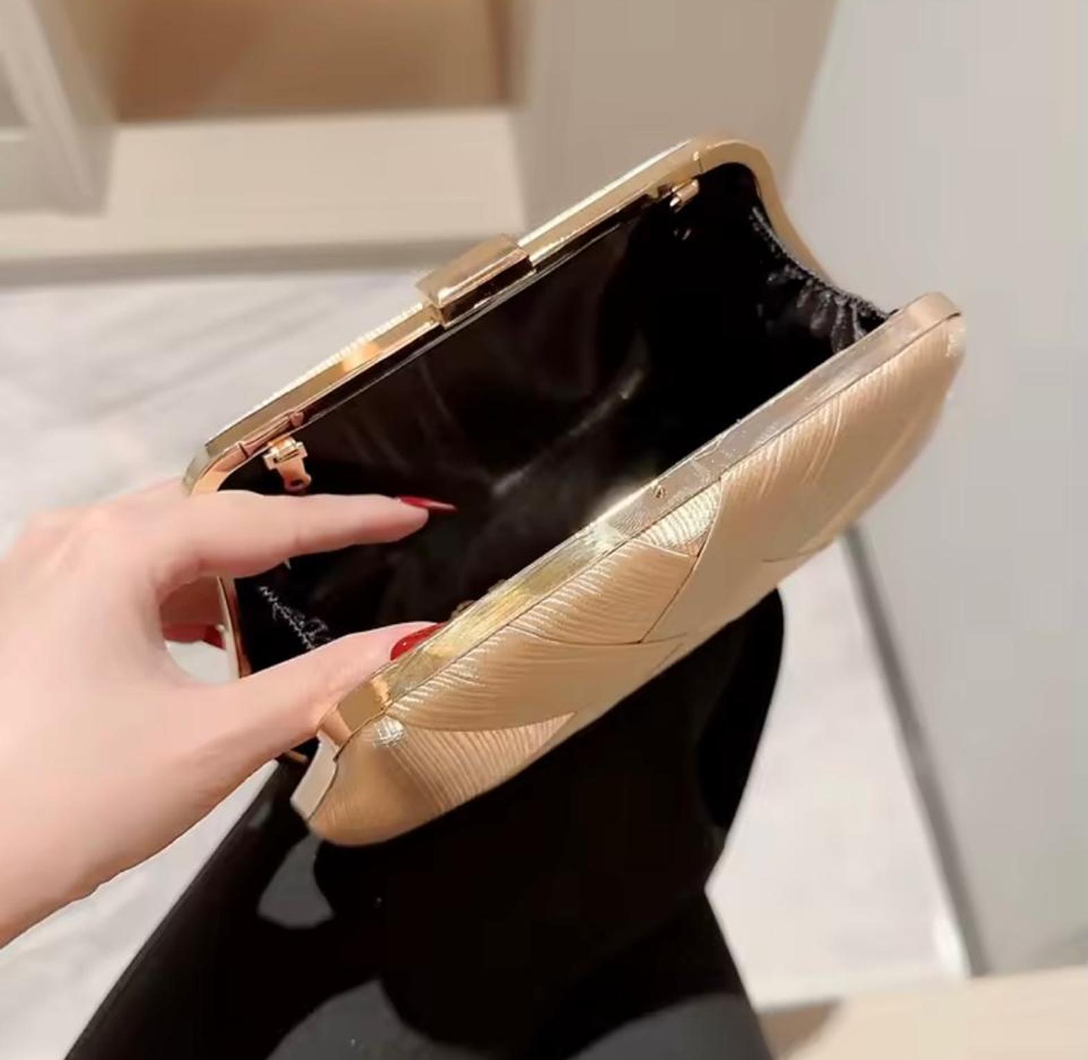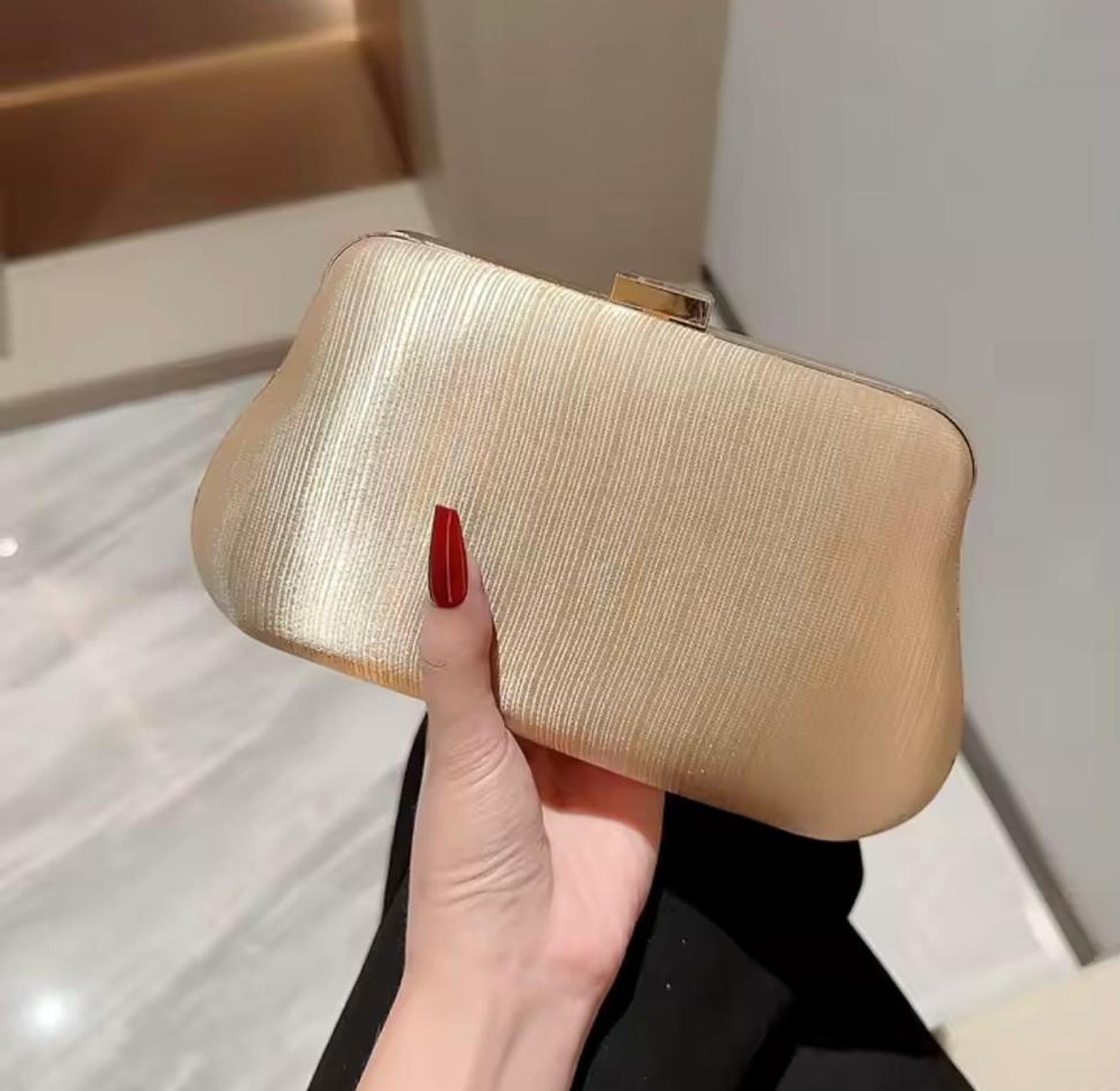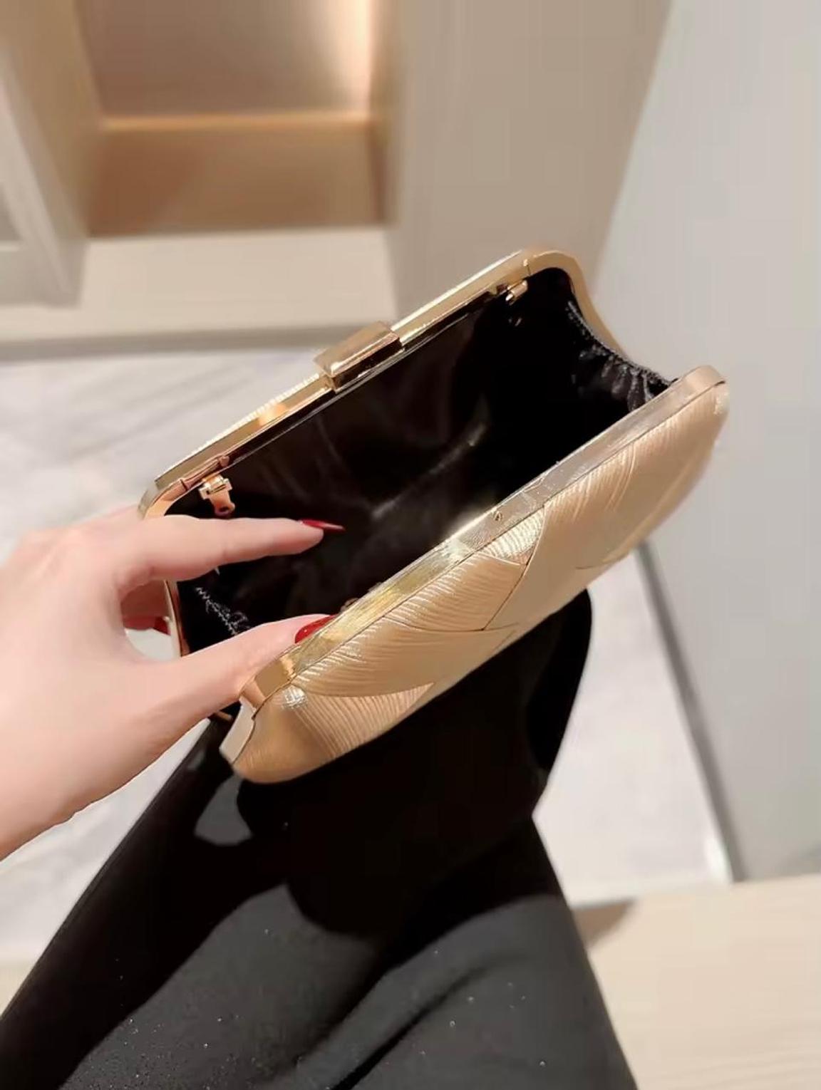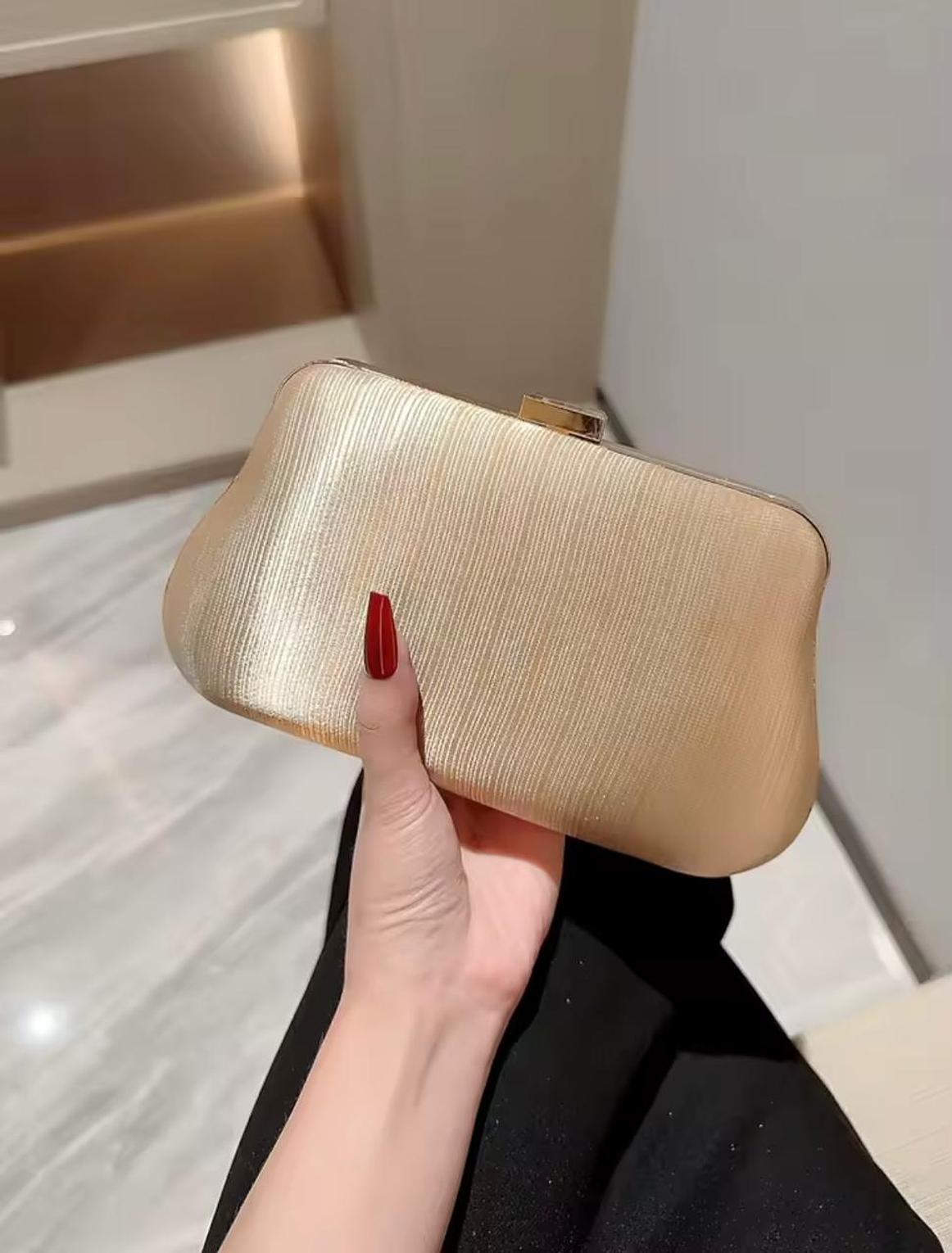This stunning gold clutch features a unique, textured criss-cross fabric pattern and an elegant gold chain strap. It's the perfect statement accessory for adding metallic texture and sophisticated warmth to any formal evening look.