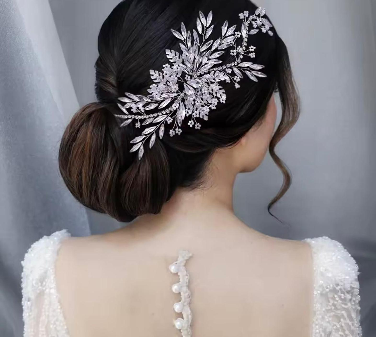 This elegant, asymmetrical flower based hair vine features a beautiful mix of brilliant crystal leaves and petite floral clusters. Finished in a luminous white colour setting, it is designed to sweep gracefully along the side of the head or an updo.
