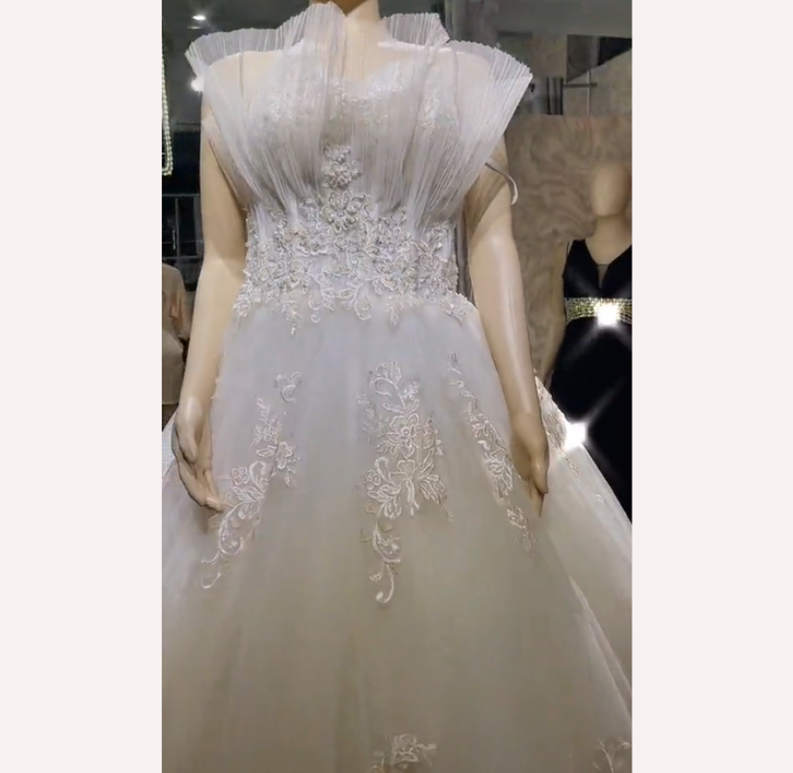 This dramatic ballgown makes an artistic statement with its unique, voluminous pleated ruffle neckline and elegantly fitted waist. Delicate floral lace appliqués cascade down the full skirt, adding texture and sophisticated romance to the design.