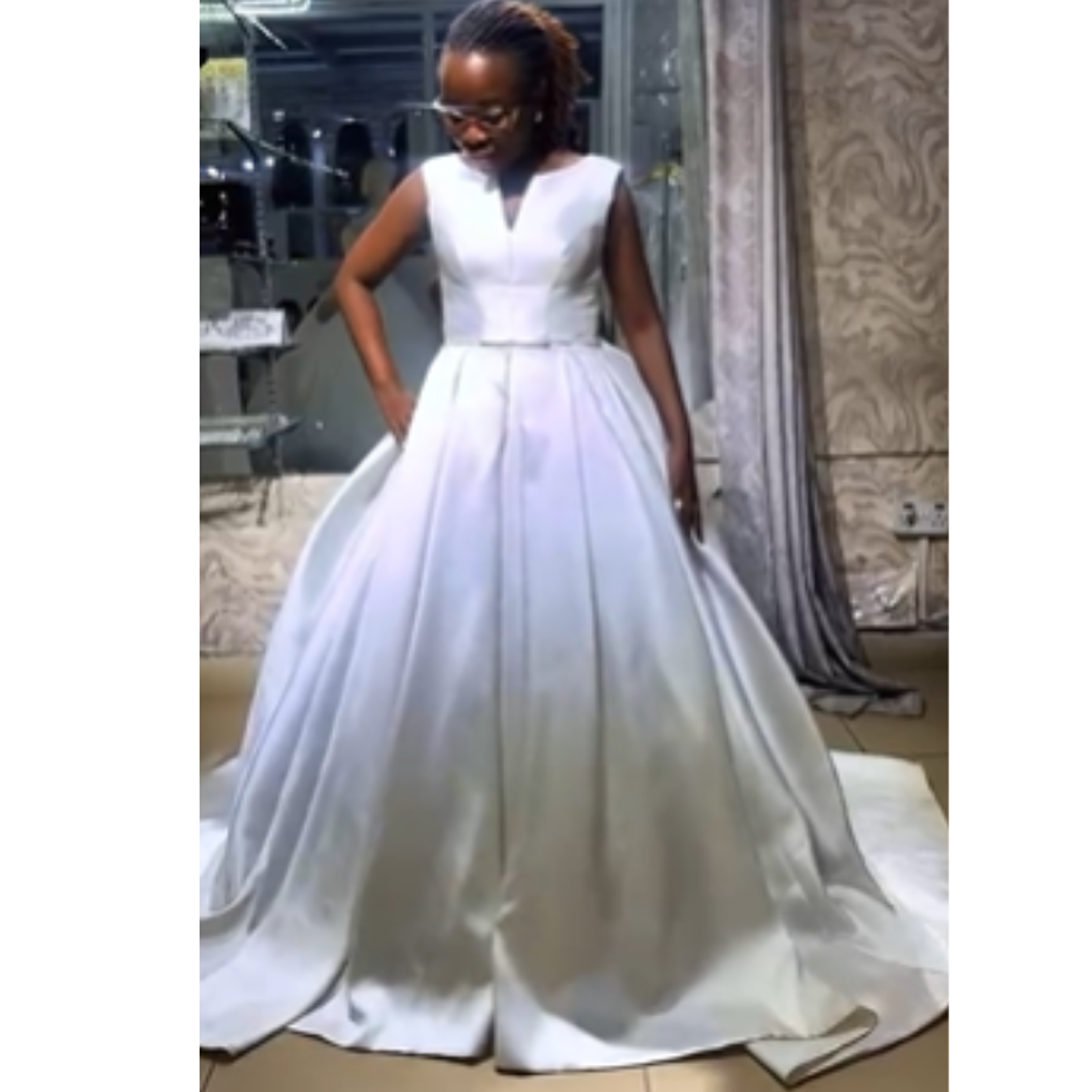This breathtaking gown features a luxurious Mikado satin finish and a flattering V-neckline for timeless sophistication. The full, voluminous skirt and subtle waist detail create an unforgettable, regal silhouette perfect for your momentous day