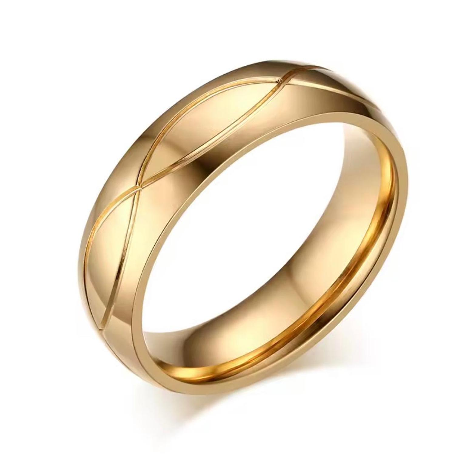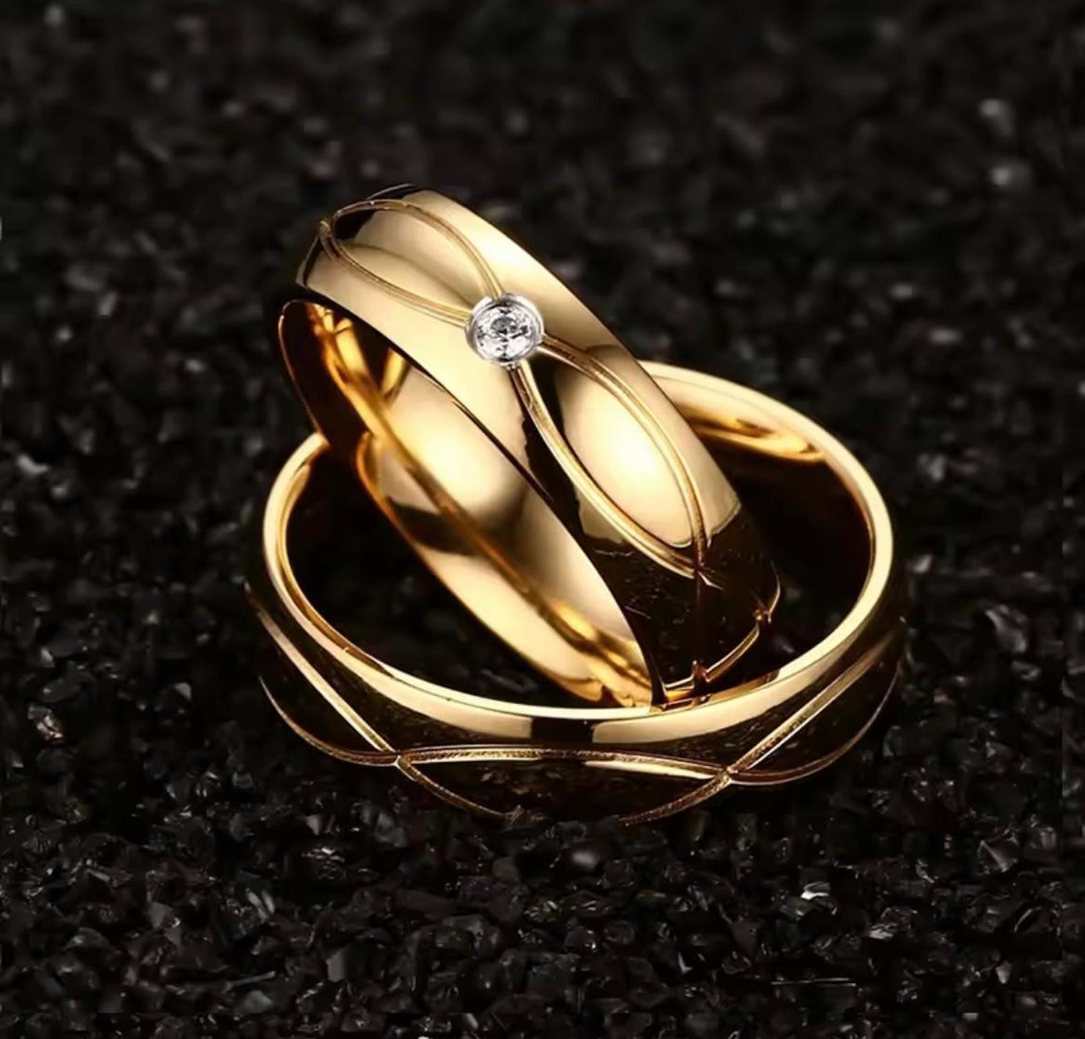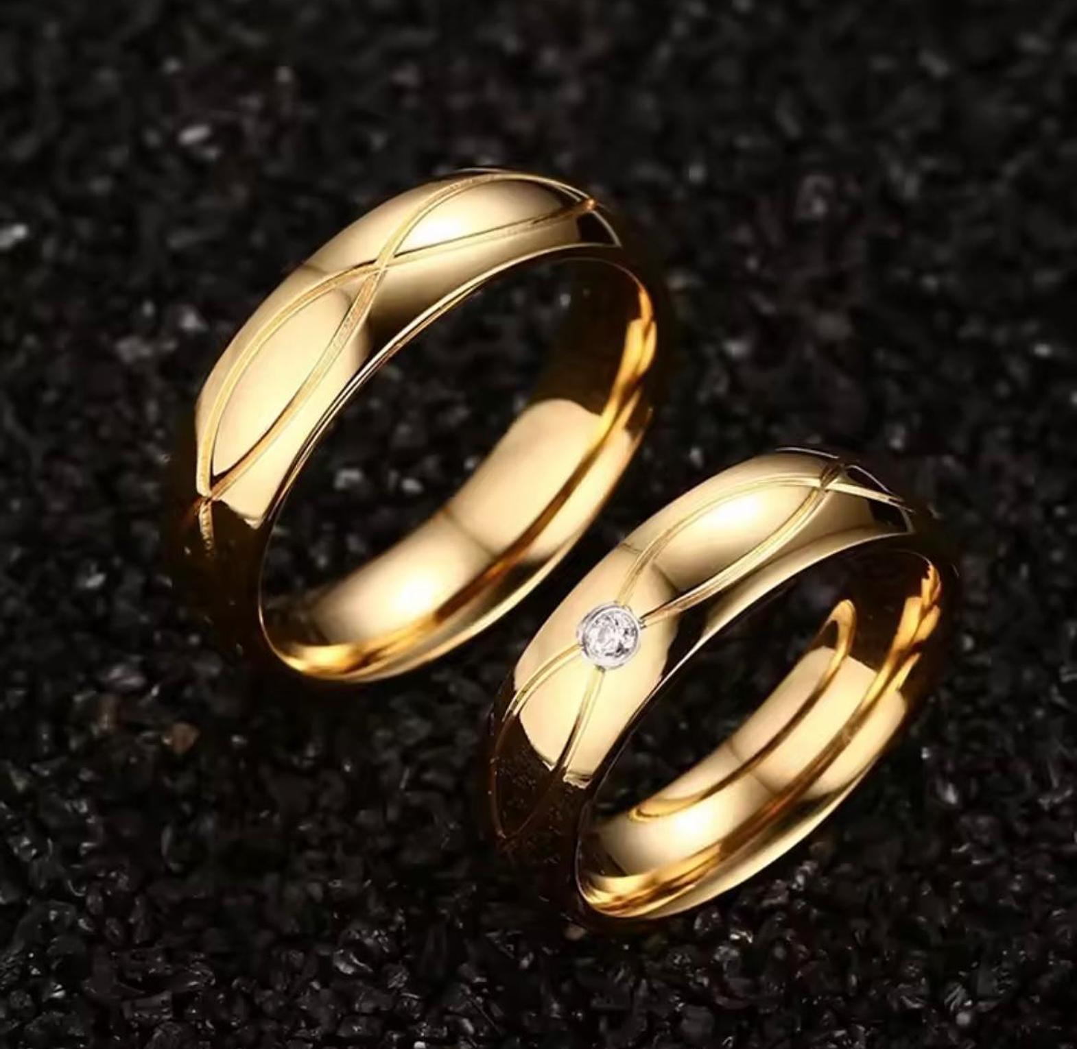 Crafted from durable stainless steel with a rich IP gold plating, this $5\text{mm}$ band is designed to be purchased individually. The male style features subtle groove patterns, while the female style is elegantly set with a single, dazzling AAA cubic zirconia stone. Men sizes 6-12, Ladies sizes 5-13