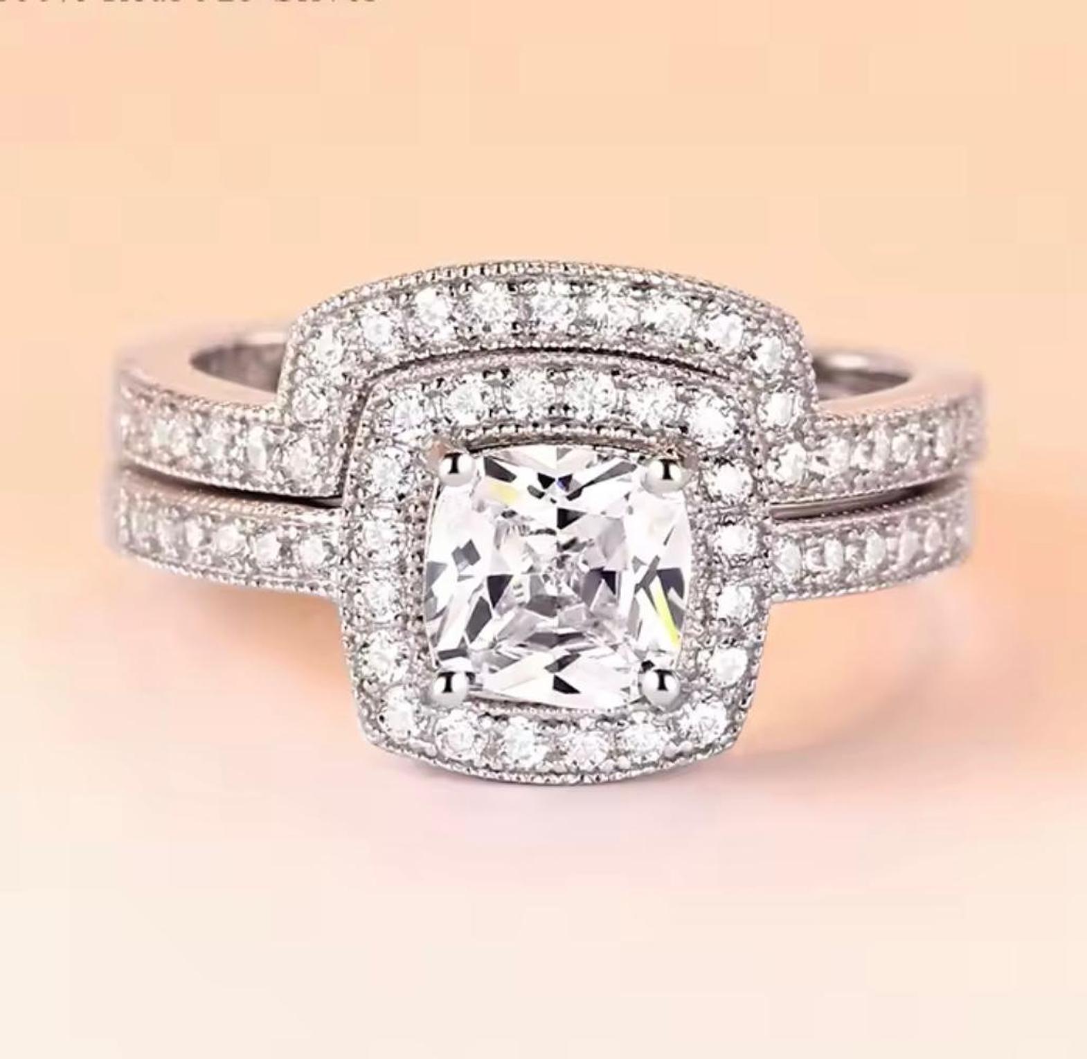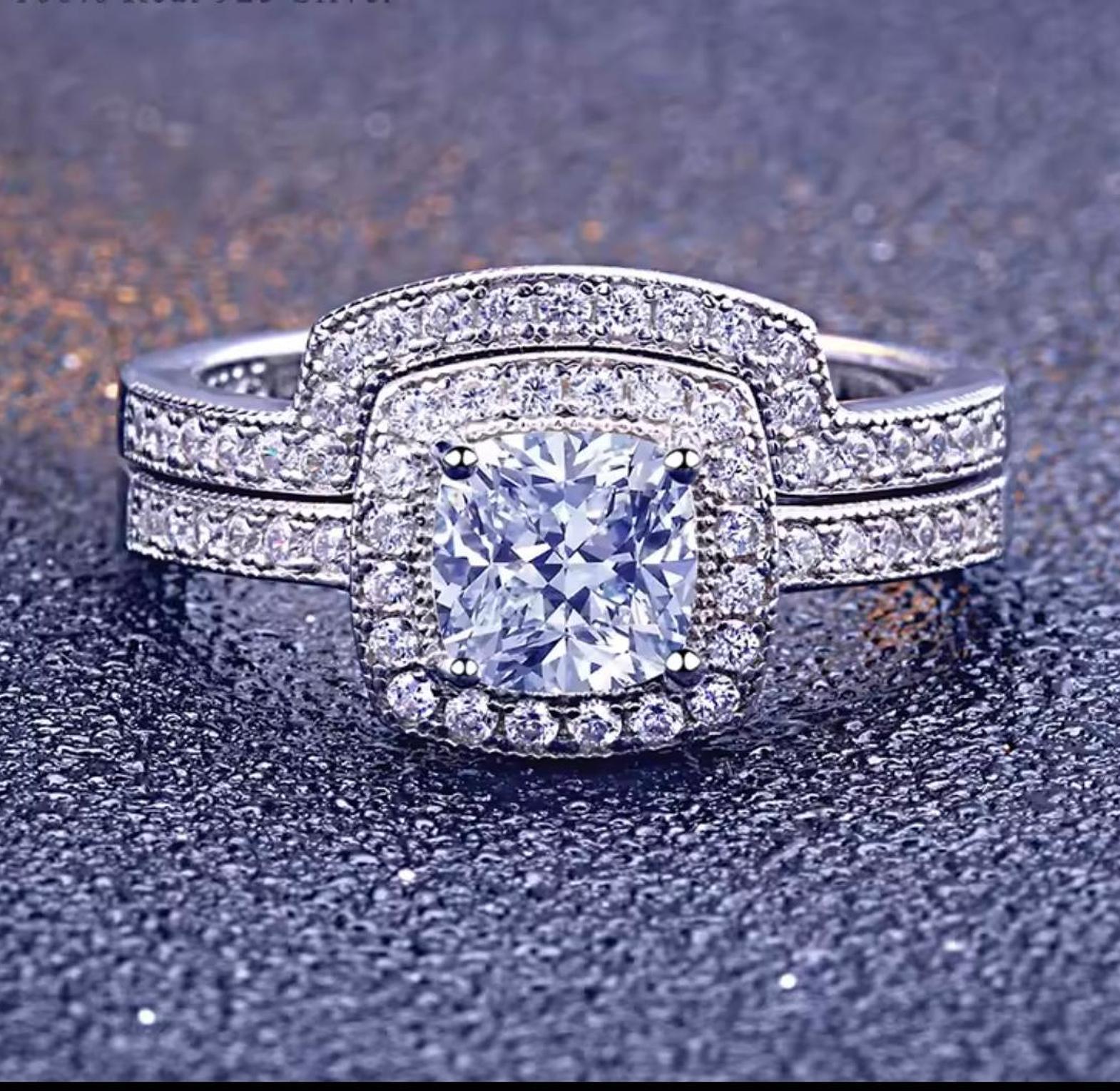 This magnificent two-piece bridal set features a bold, square-shaped center cubic zirconia gems surrounded by a double halo of brilliance. Crafted from 100% Real S925 Silver, this set is designed to be hypoallergenic and promises stunning, light-catching sparkle. Size 5-10