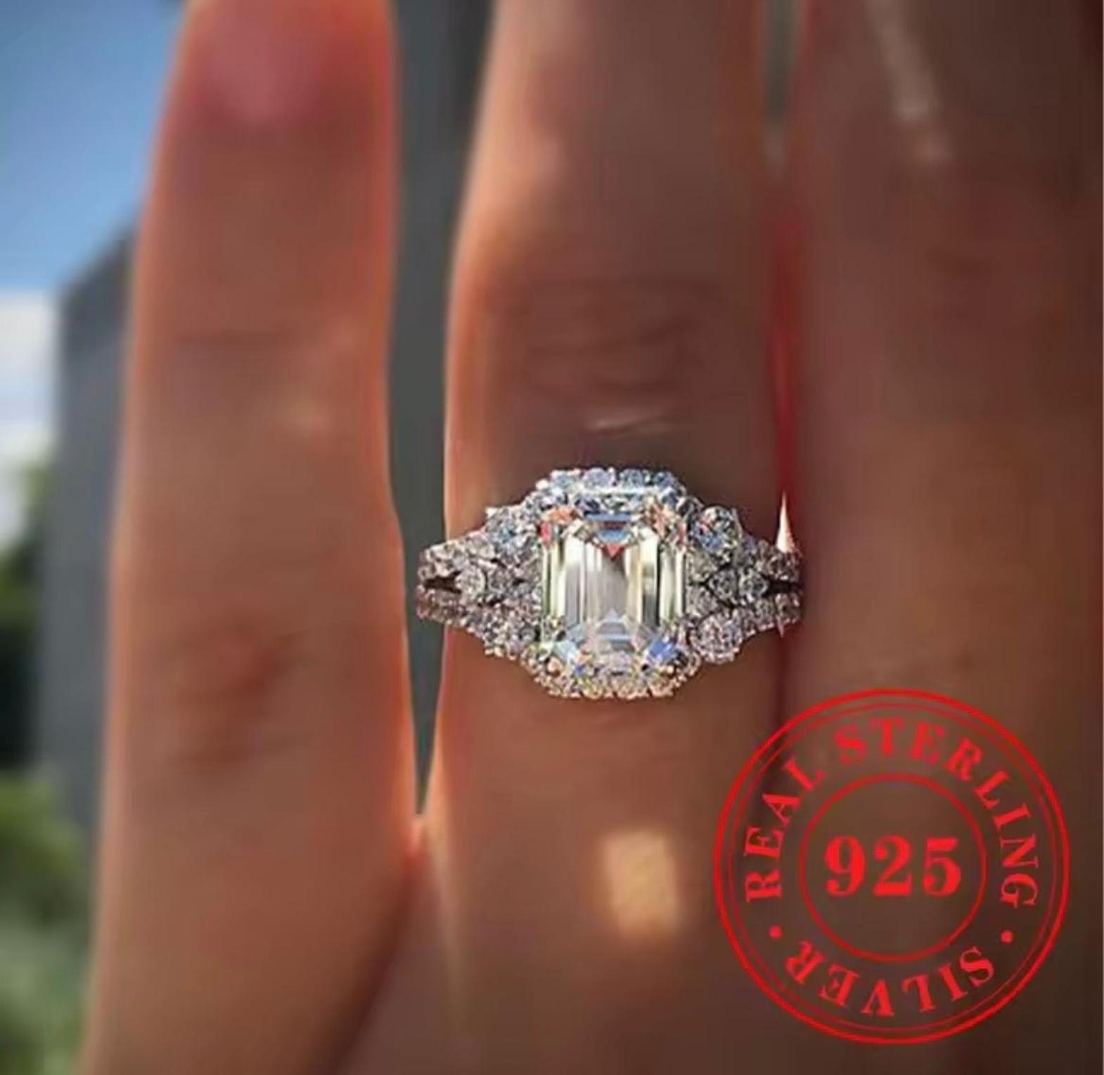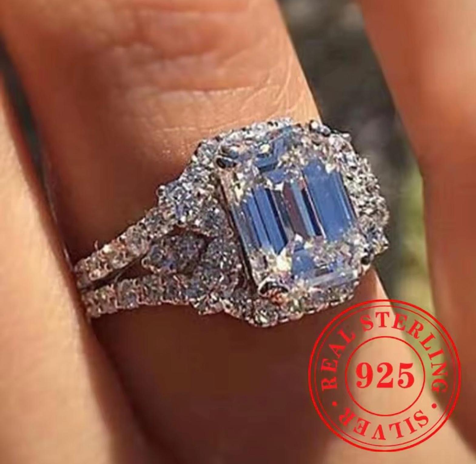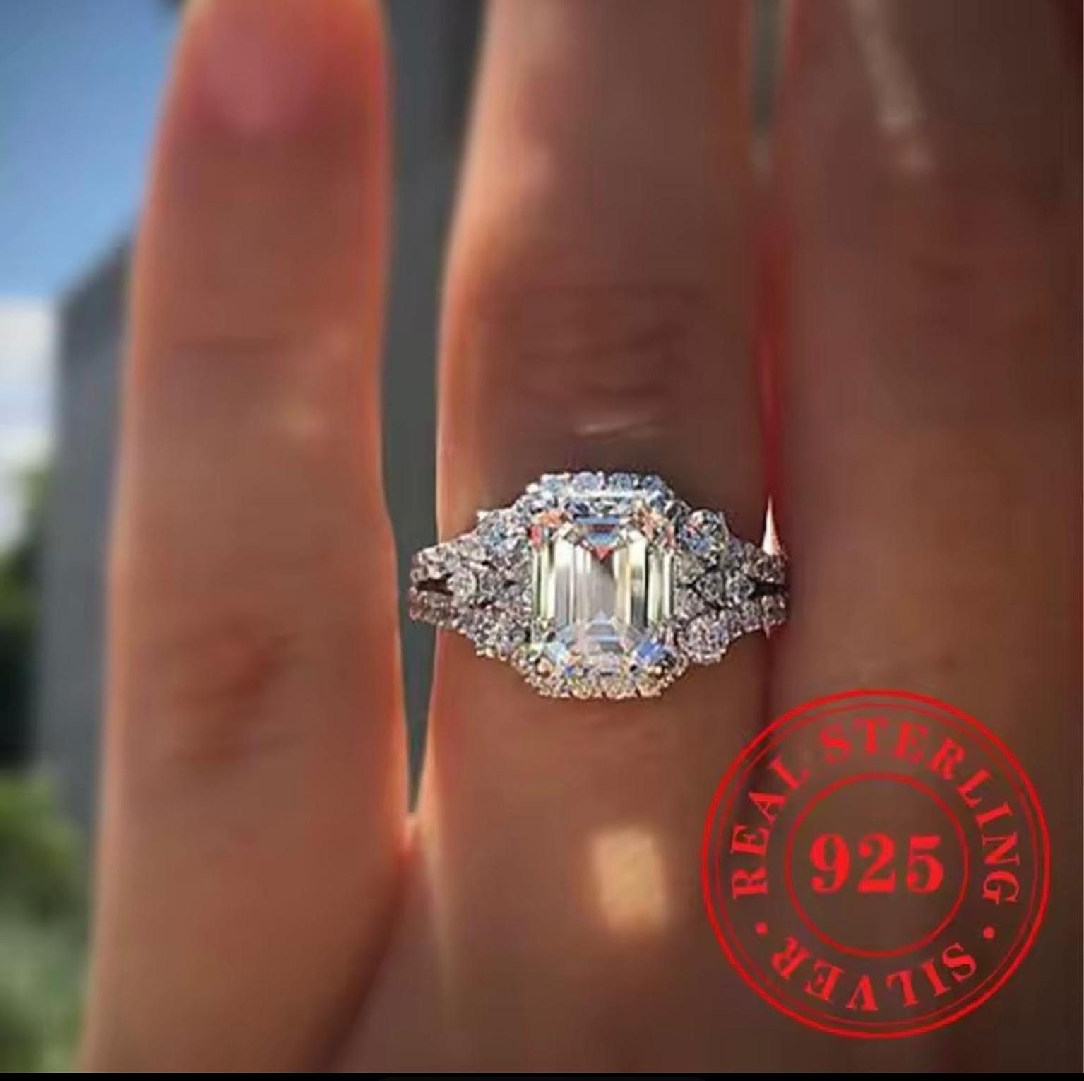 This breathtaking set features a prominent Emerald-Cut center crystal surrounded by a glittering halo and side crystals. It is crafted from authentic Real Sterling Silver S925, providing a bright, durable white metal foundation for maximum light performance.