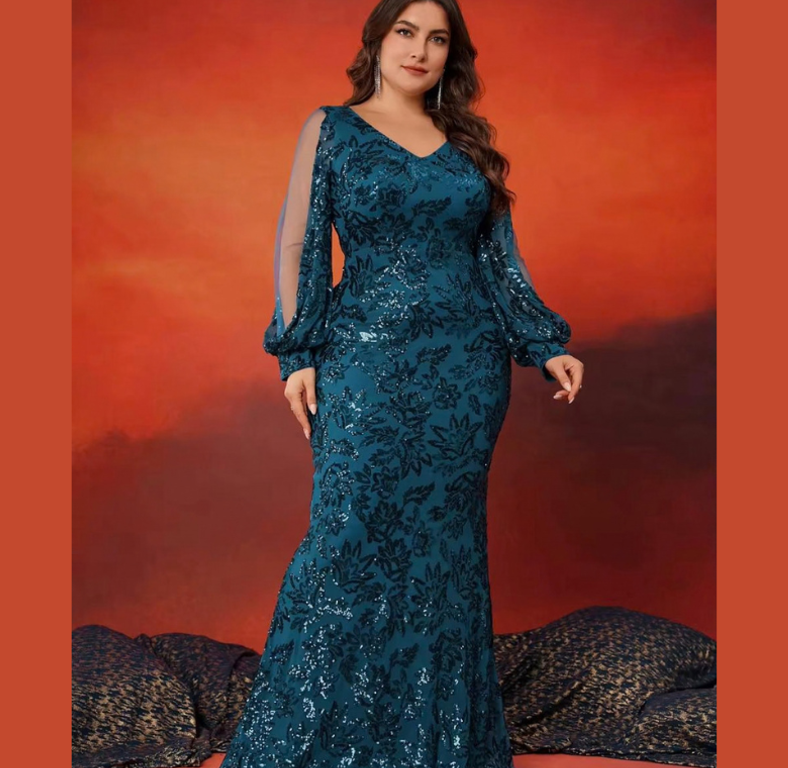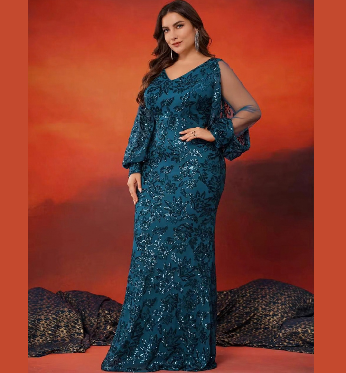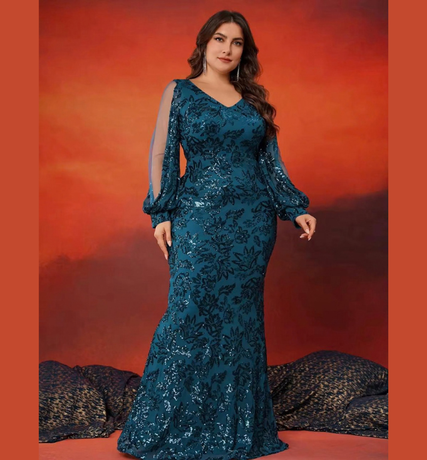 Command the room in the Elara Gown, a stylish dress that masterfully combines texture and light. This elegant dress is defined by its stunning all-over floral sequin embroidery, which creates a multidimensional shimmer against the deep teal backdrop. As a premium women’s dress, it features a sophisticated V-neckline and sheer, voluminous bishop sleeves that add an air of ethereal romance to the structured mermaid silhouette. Every inch of this fashion dress is designed to celebrate your figure, tapering elegantly through the bodice before flaring into a graceful floor-length hem.