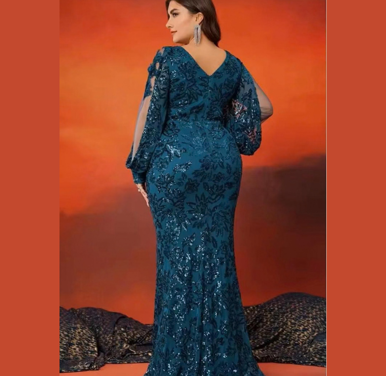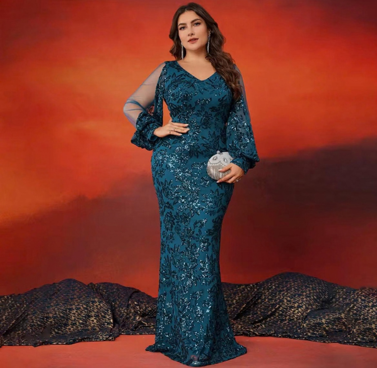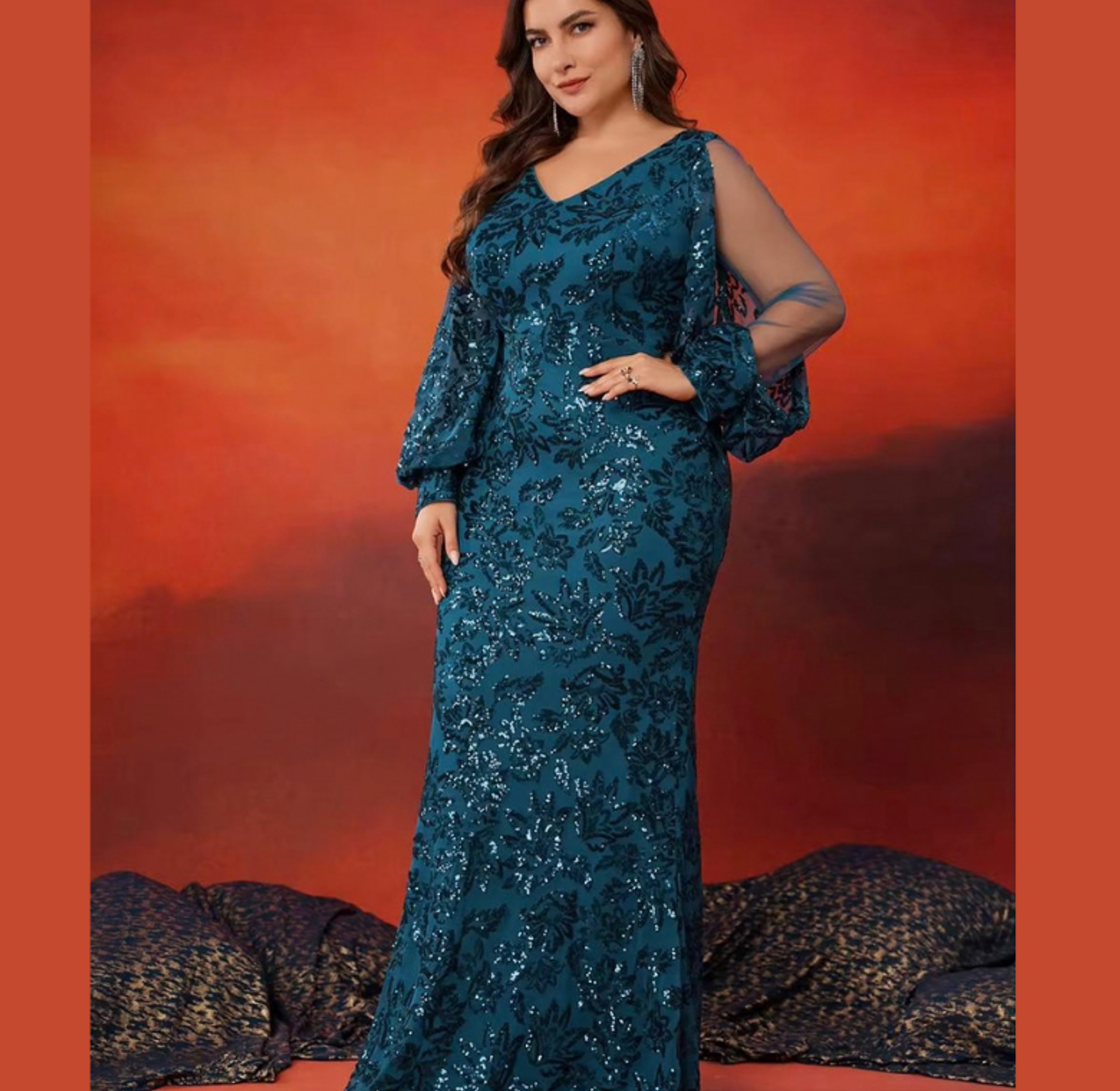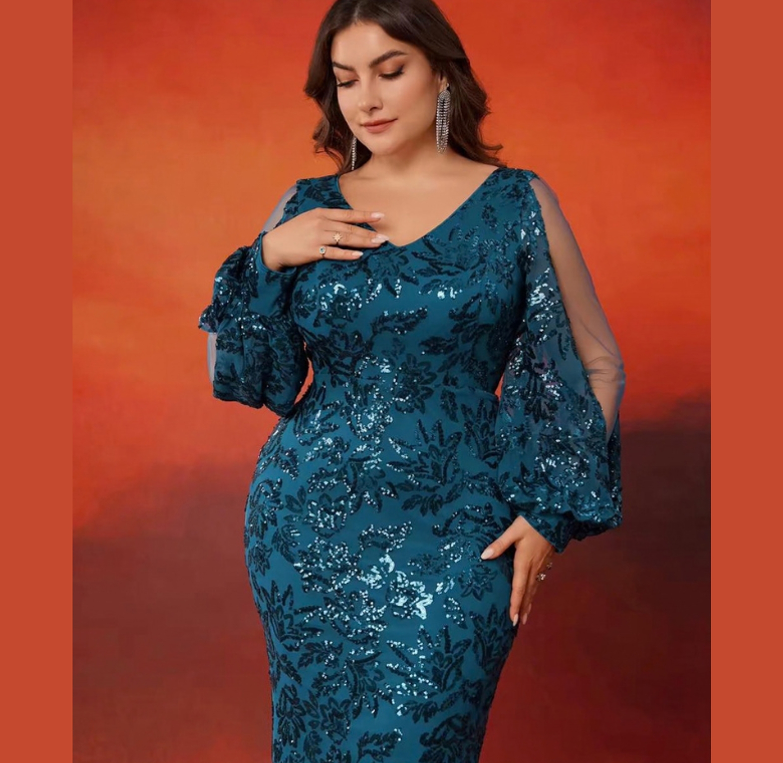 Command the room in the Elara Gown, a stylish dress that masterfully combines texture and light. This elegant dress is defined by its stunning all-over floral sequin embroidery, which creates a multidimensional shimmer against the deep teal backdrop. As a premium women’s dress, it features a sophisticated V-neckline and sheer, voluminous bishop sleeves that add an air of ethereal romance to the structured mermaid silhouette. Every inch of this fashion dress is designed to celebrate your figure, tapering elegantly through the bodice before flaring into a graceful floor-length hem.