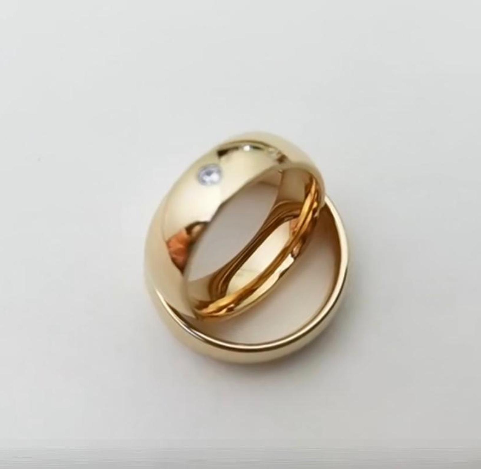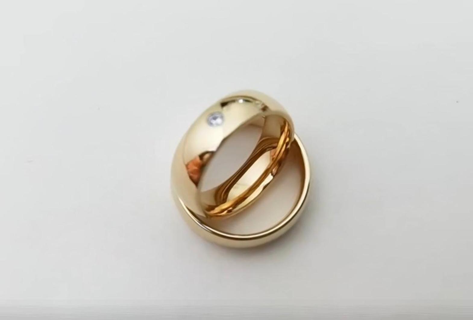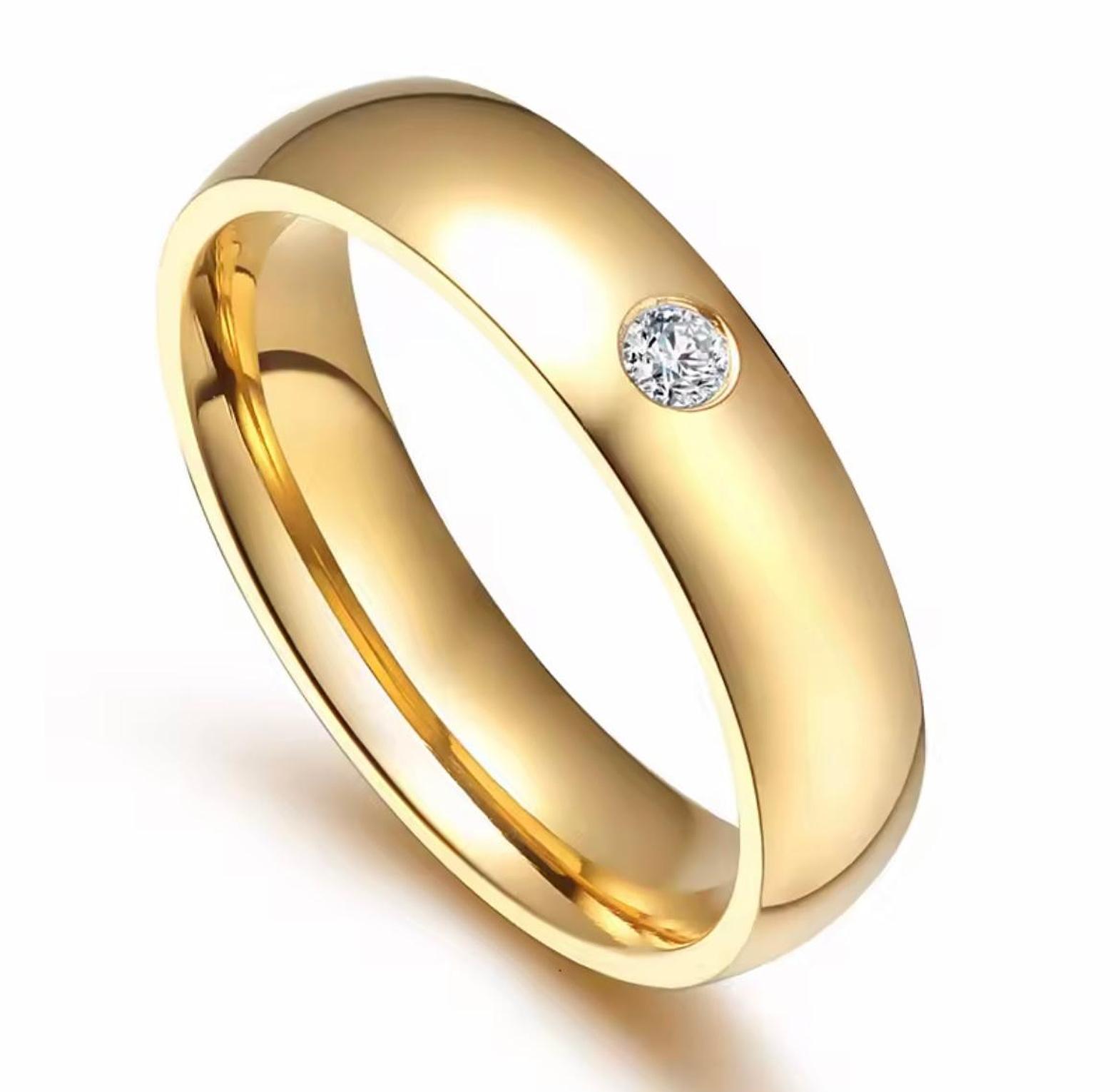 This 4 mm band, crafted from resilient stainless steel, is available in both radiant gold color and sleek silver plated finishes, offering versatile style for both genders. The female version features a delicate cubic zirconia stone, while the male band maintains a simple, high-polished elegance.