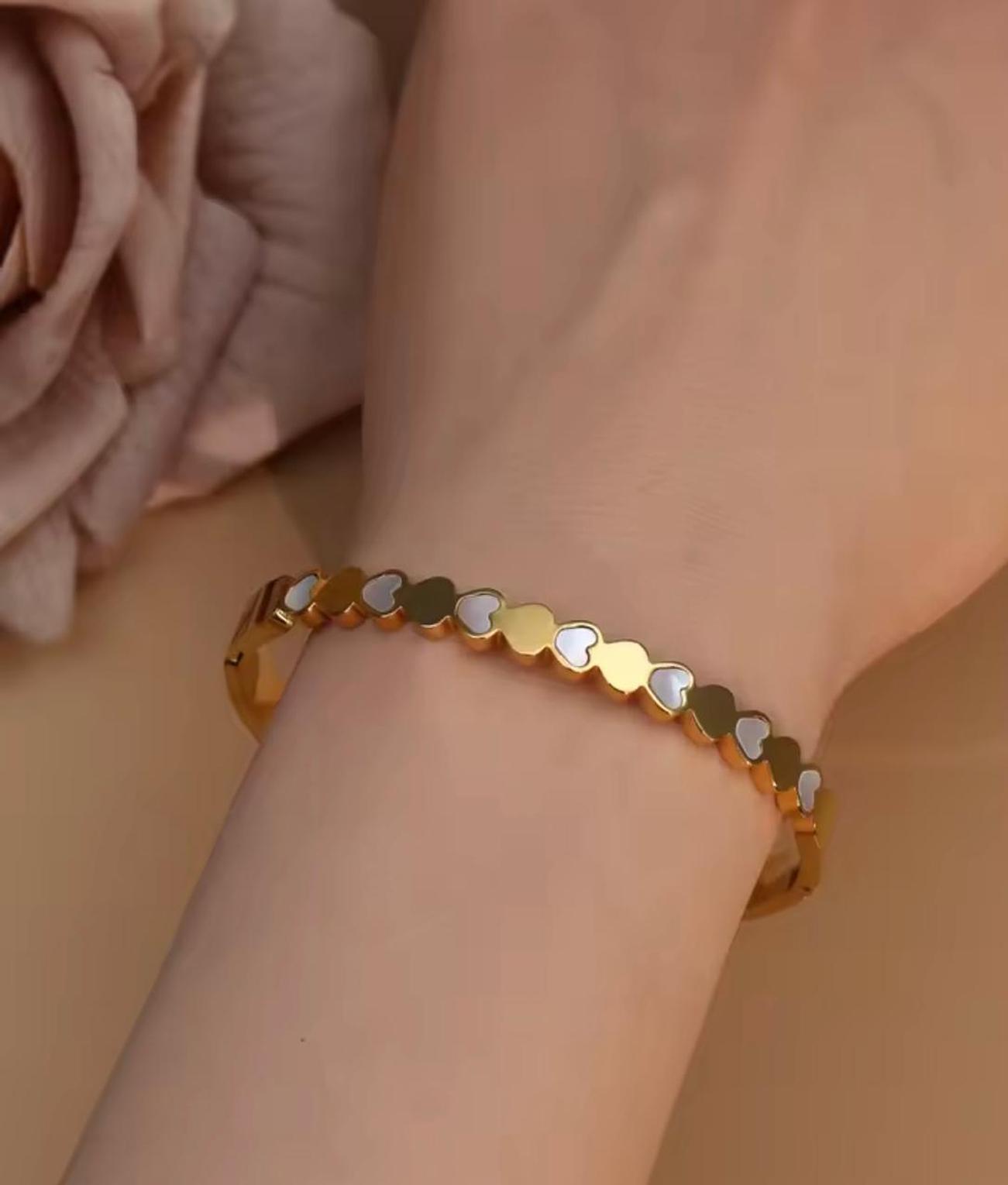 This romantic bracelet is designed with a charming love pattern featuring linked heart shapes and a luxurious gold plated finish. Crafted from durable material, the piece is designed to be non-tarnish and maintain its rich luster over time.