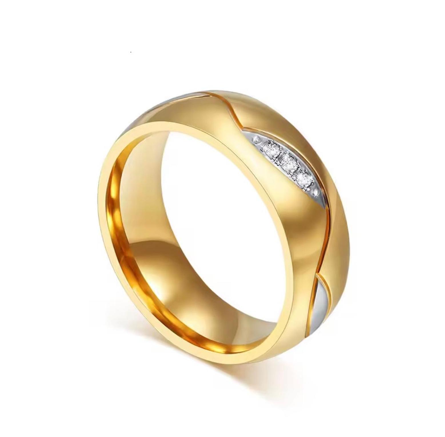 These striking 4 mm bands are crafted from stainless steel with a rich gold color and a sophisticated wave design. The female ring features an elegant inset of cubic zirconia stones, while the male band is distinguished by a clean, geometric pattern.