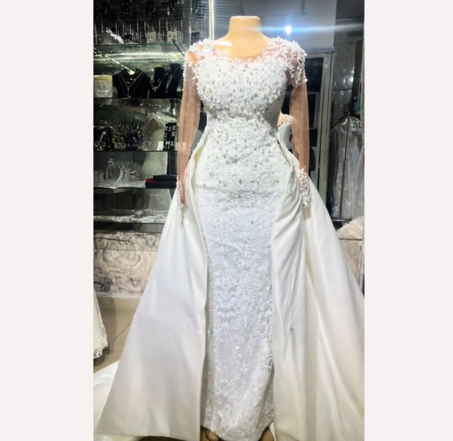 This versatile bridal ensemble transitions seamlessly from a dramatic ballgown look to a sleek, figure-hugging mermaid silhouette with its detachable overskirt. The fitted bodice and sheer long sleeves are adorned with exquisite beaded lace, offering two distinct looks for your celebration.
