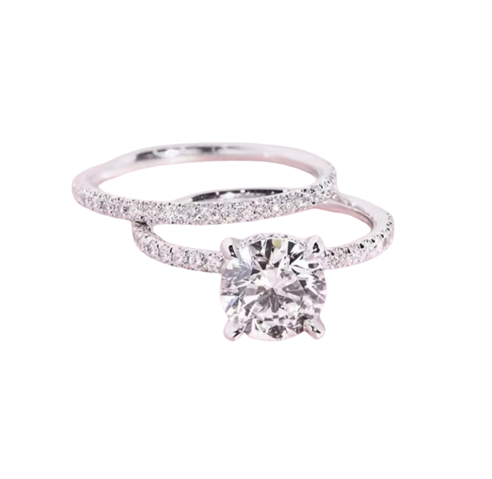 This exquisite two-piece ring set is crafted from genuine S925 Real Sterling Silver, offering superior shine and quality. The main ring features a spectacular round-cut solitaire, with both the engagement ring and the matching band entirely crowned with brilliant cubic zirconia stones.