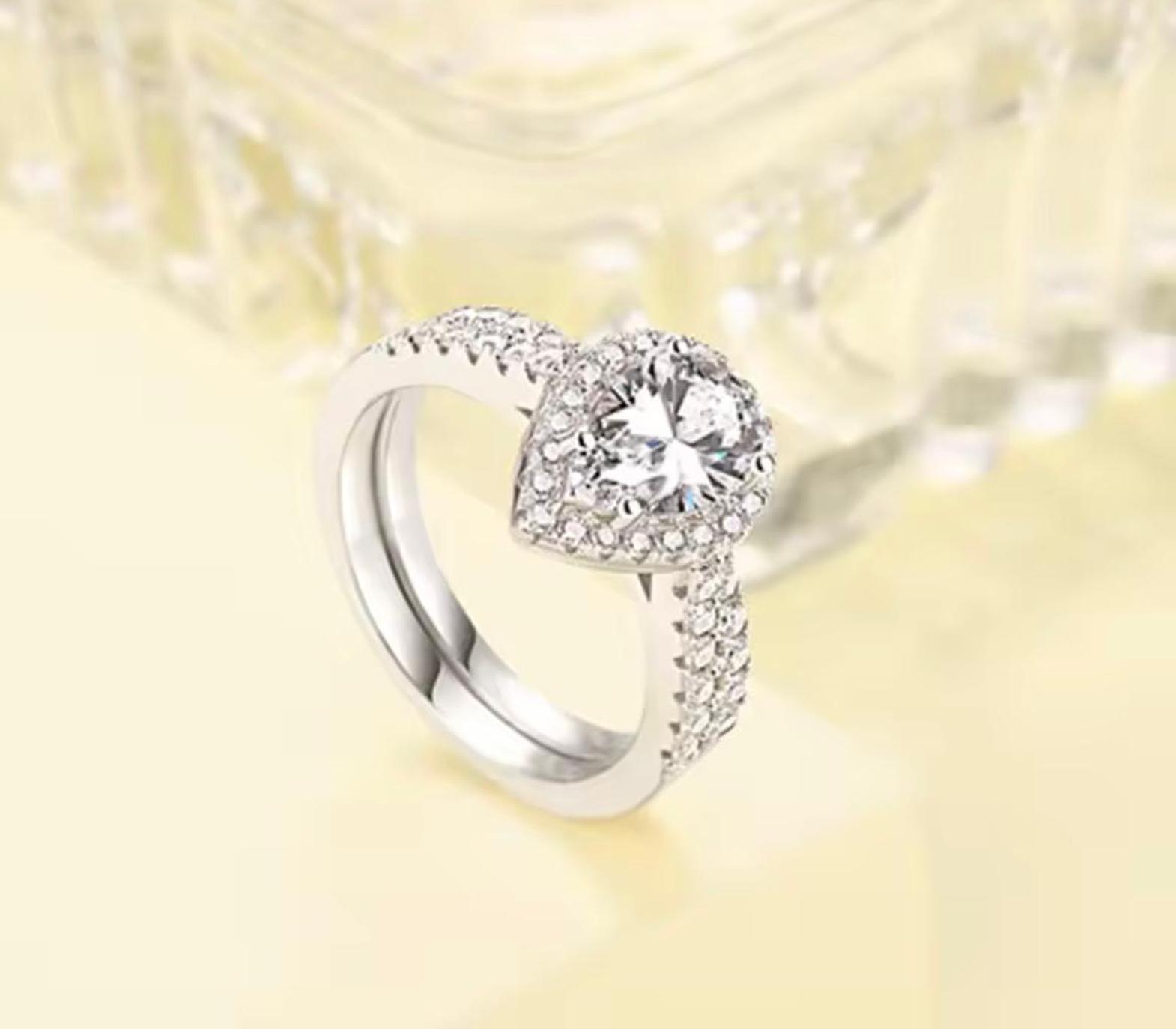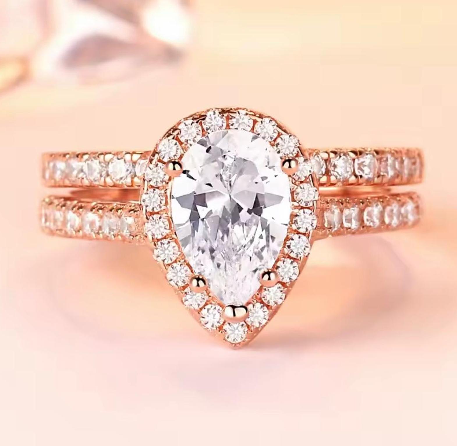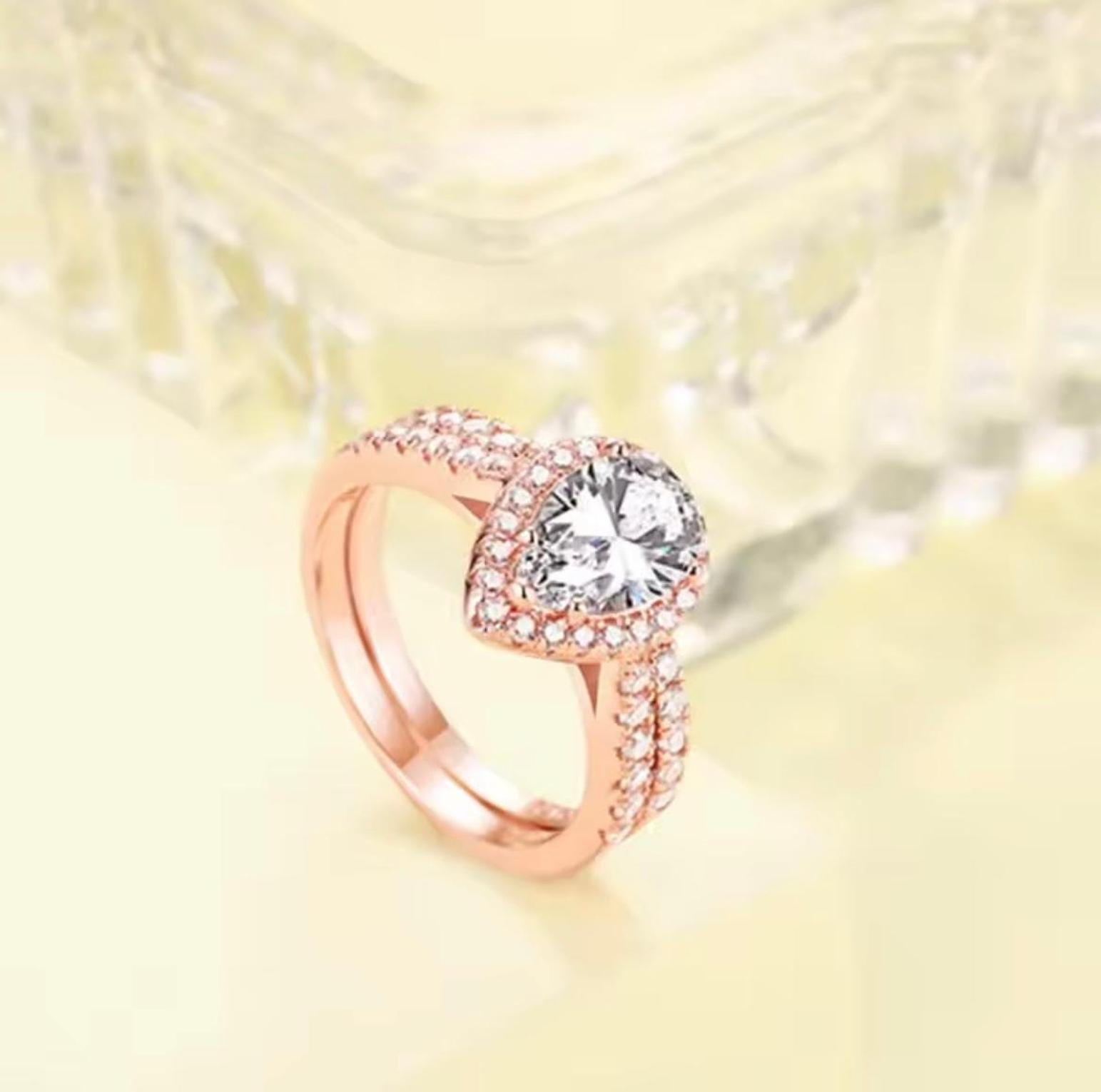This romantic two-piece bridal set features a brilliant S925 Pure Silver base, available in both a delicate rose gold plating and a classic silver color. The main ring showcases a dazzling pear-shaped cubic zirconia center stone encircled by a halo of micro-pave gems. Sizes 4-10