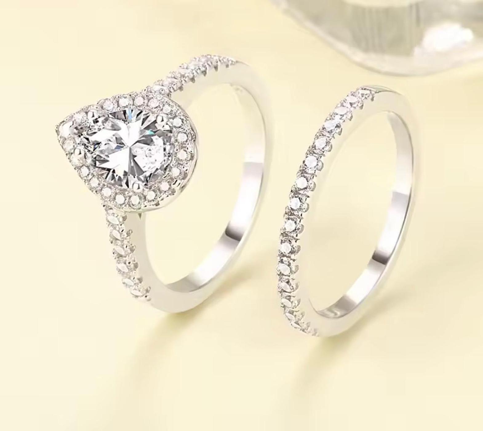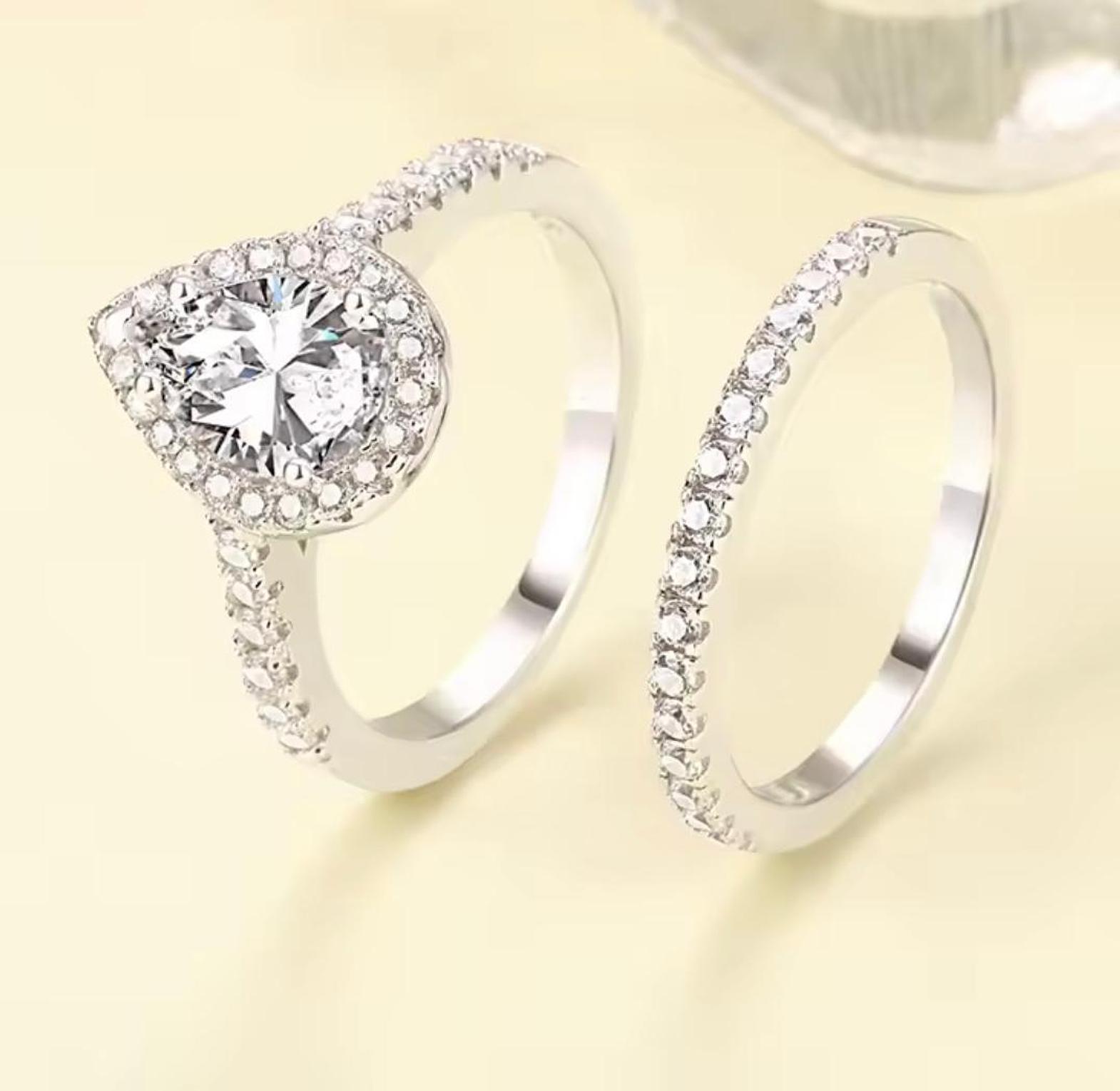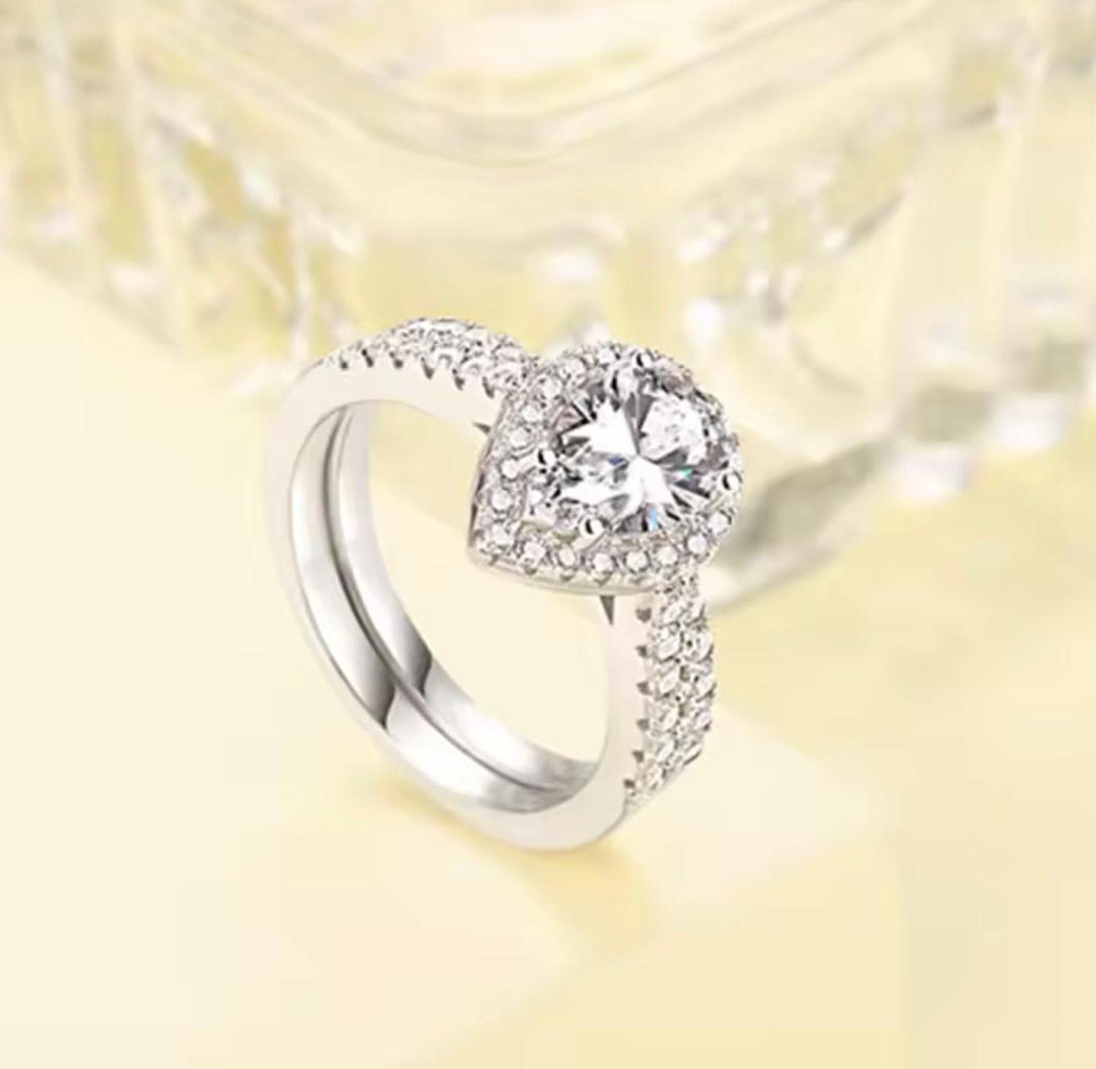 This romantic two-piece bridal set features a brilliant S925 Pure Silver base, available in both a delicate rose gold plating and a classic silver color. The main ring showcases a dazzling pear-shaped cubic zirconia center stone encircled by a halo of micro-pave gems. Sizes 4-10