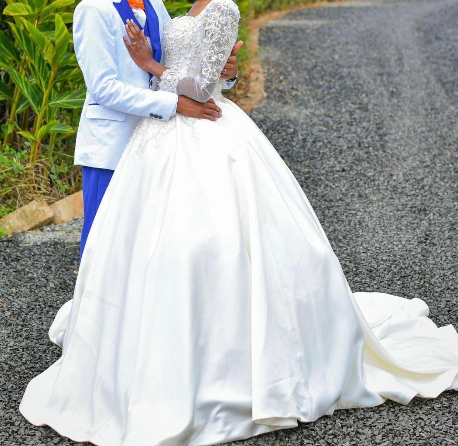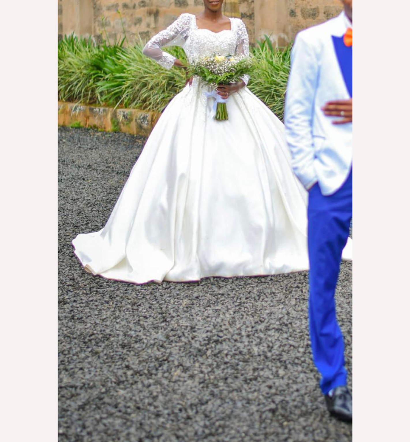 This breathtaking voluminous ballgown features a luxurious, structured satin skirt that flows into a regal train for maximum impact. The fitted bodice and sheer long sleeves are beautifully adorned with intricate hand-placed lace and beading for a touch of refined elegance.
