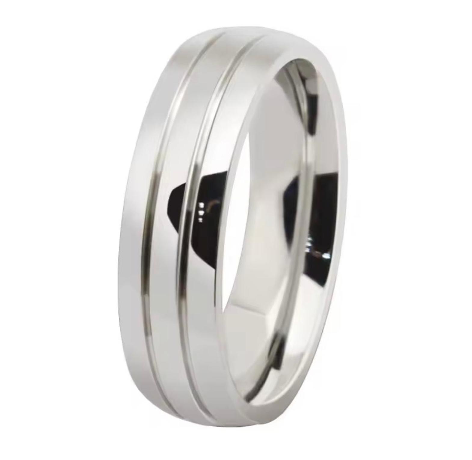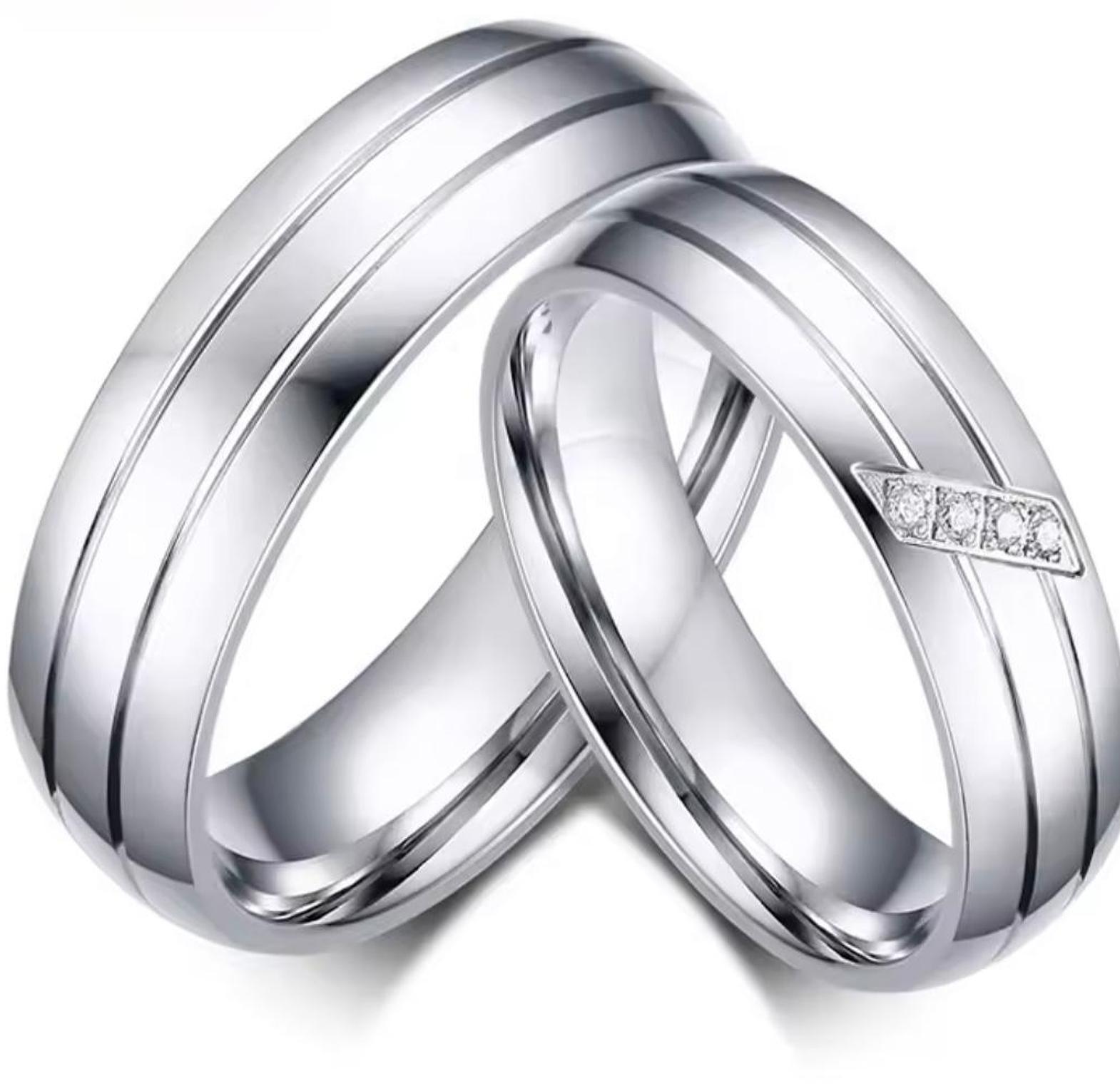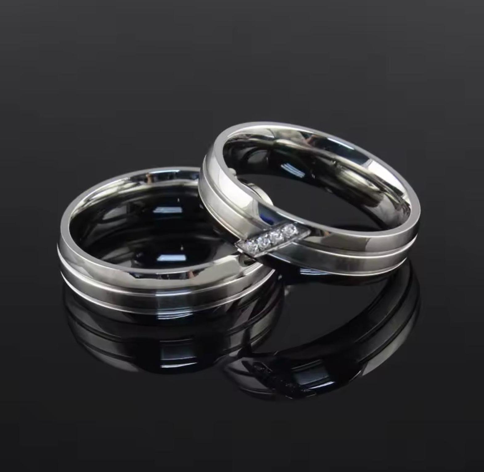 These matching stainless steel rings feature a distinctive satin-brushed finish with parallel, polished grooves that circle the band for modern dimension. The woman’s ring is uniquely enhanced by a diamond-shaped accent set with four brilliant cubic zirconia stones. Men sizes 5-13, Ladies sizes 5-13