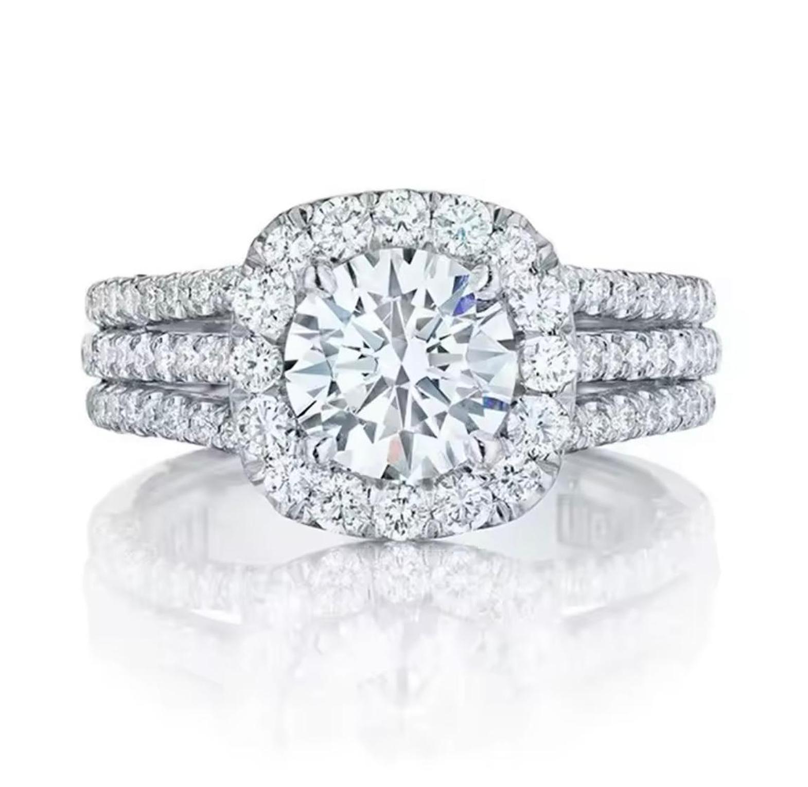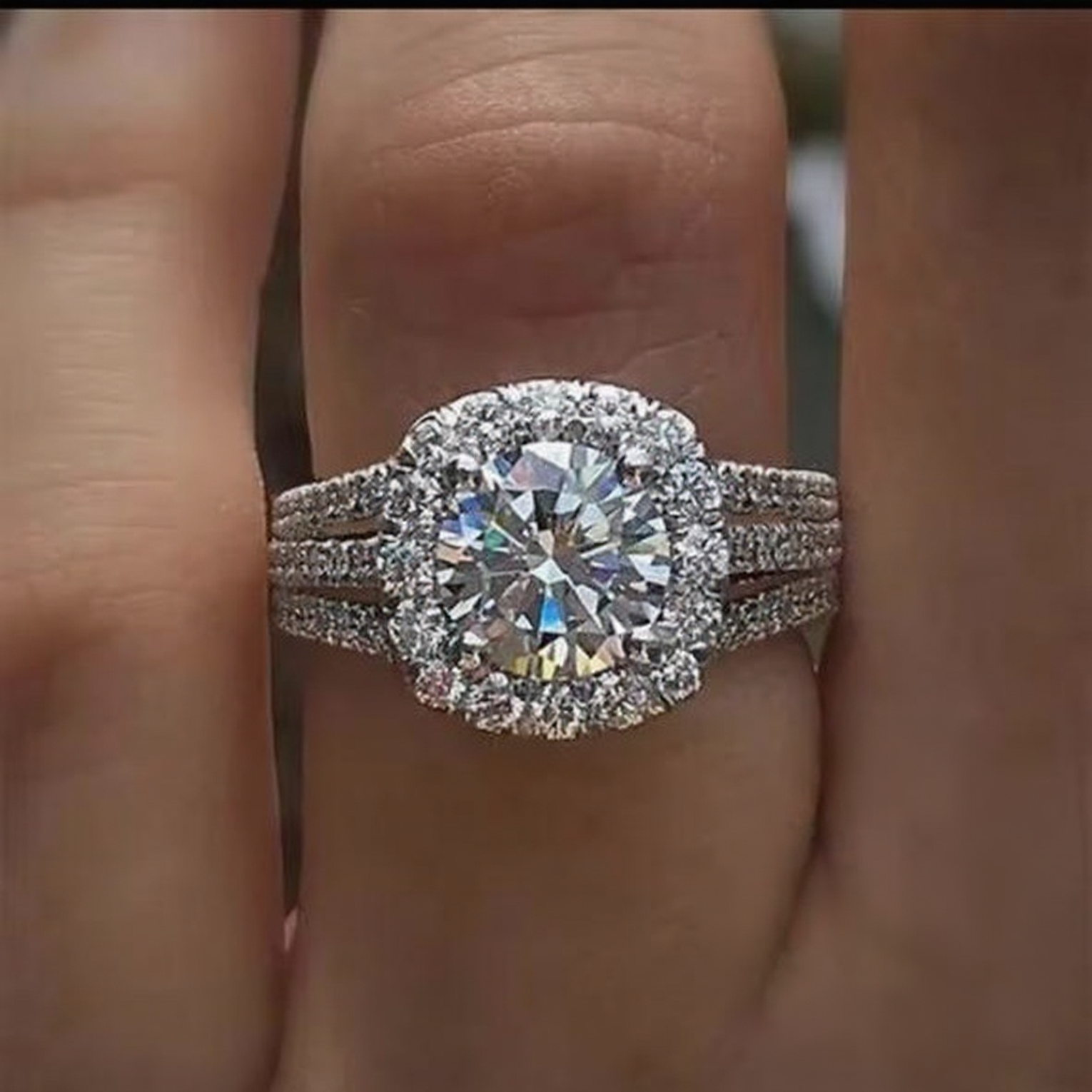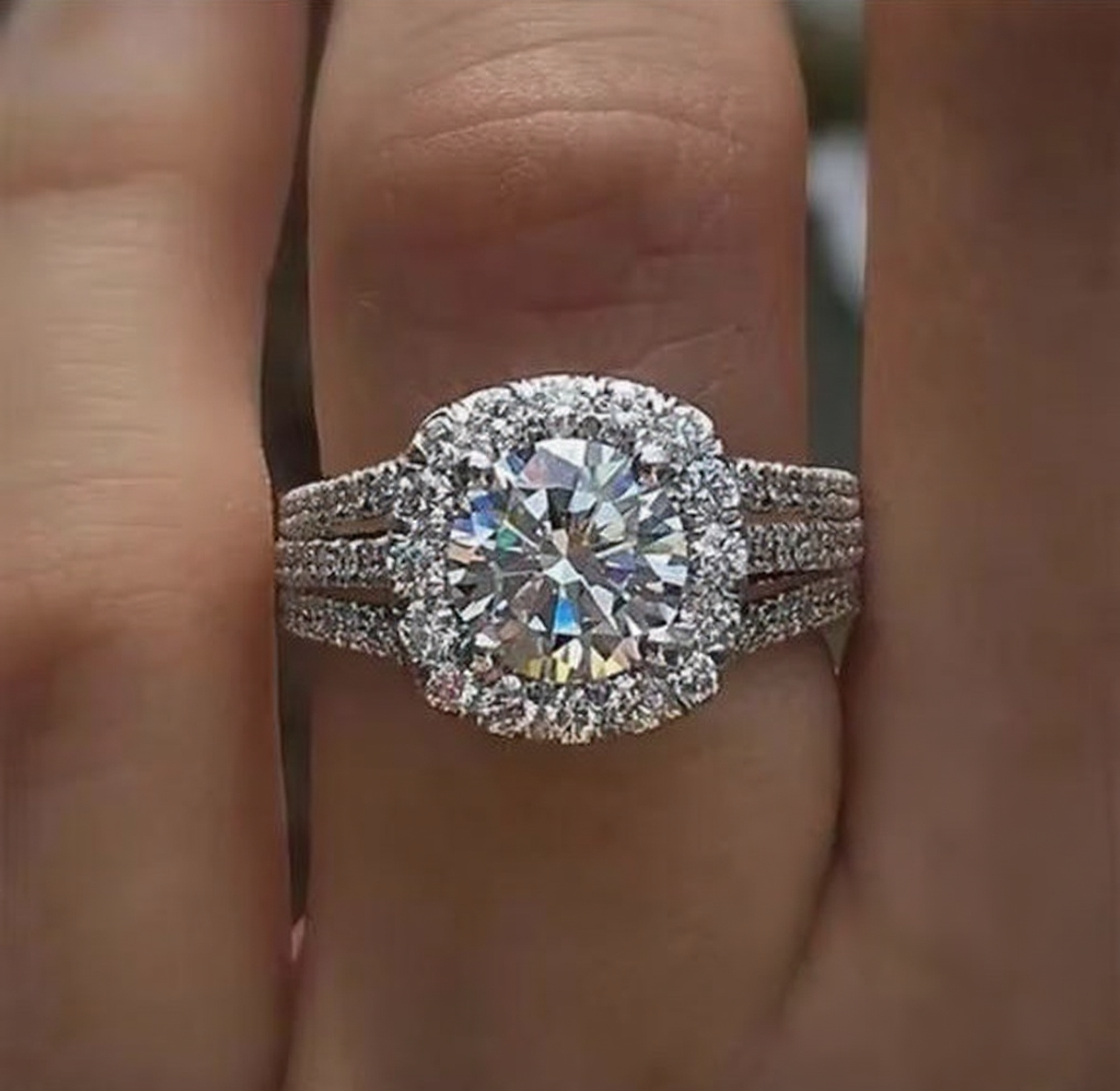 This breathtaking single ring is crafted from genuine pure silver and features a magnificent central stone surrounded by a double cushion-shaped halo. The design is completely endowed with cubic zirconia stones, offering a glimmering and intensely shining profile. Sizes 6-10