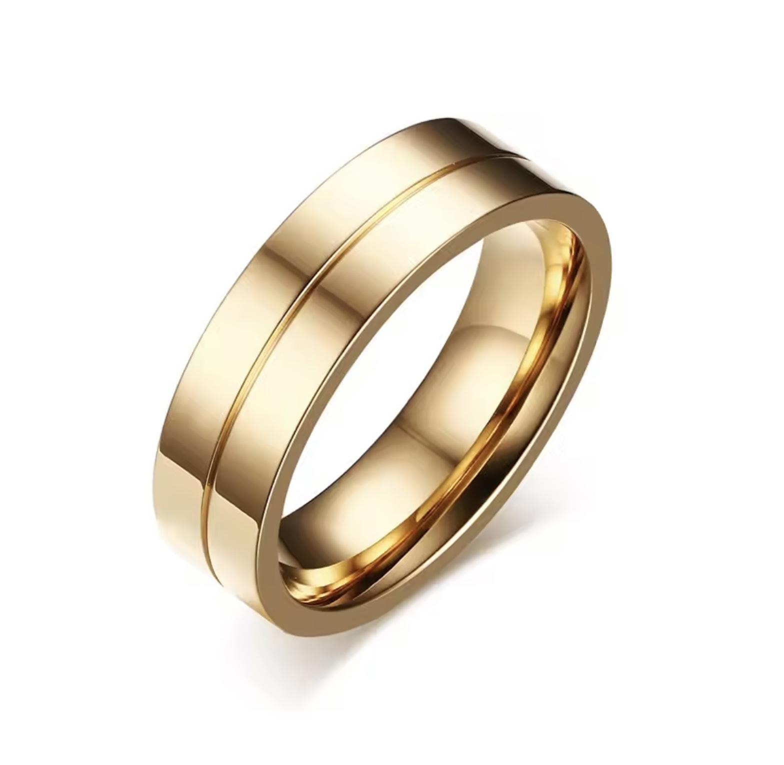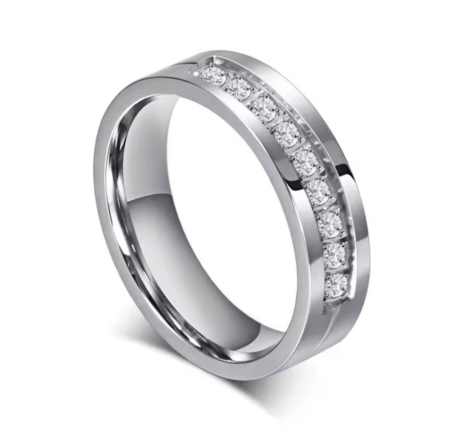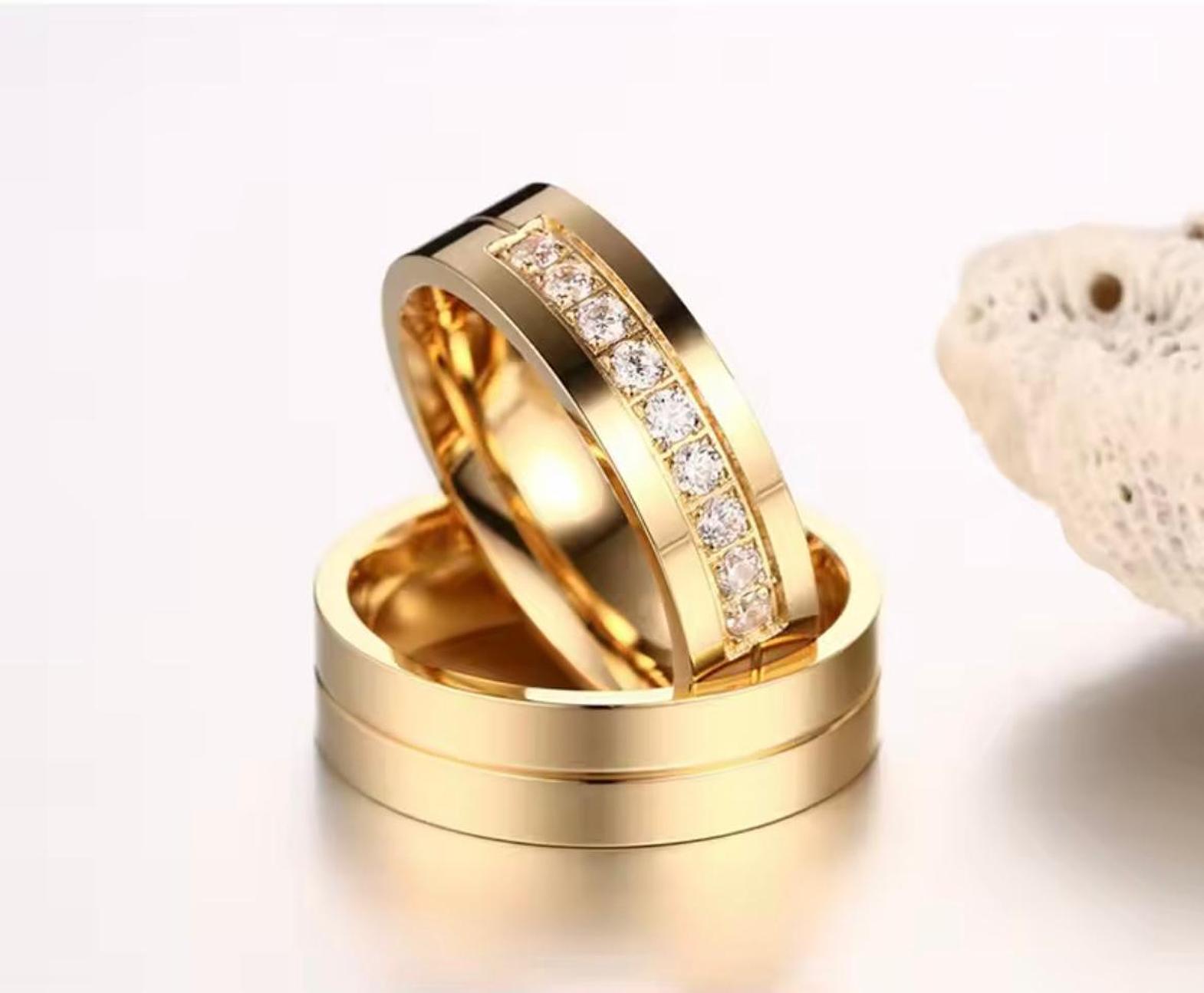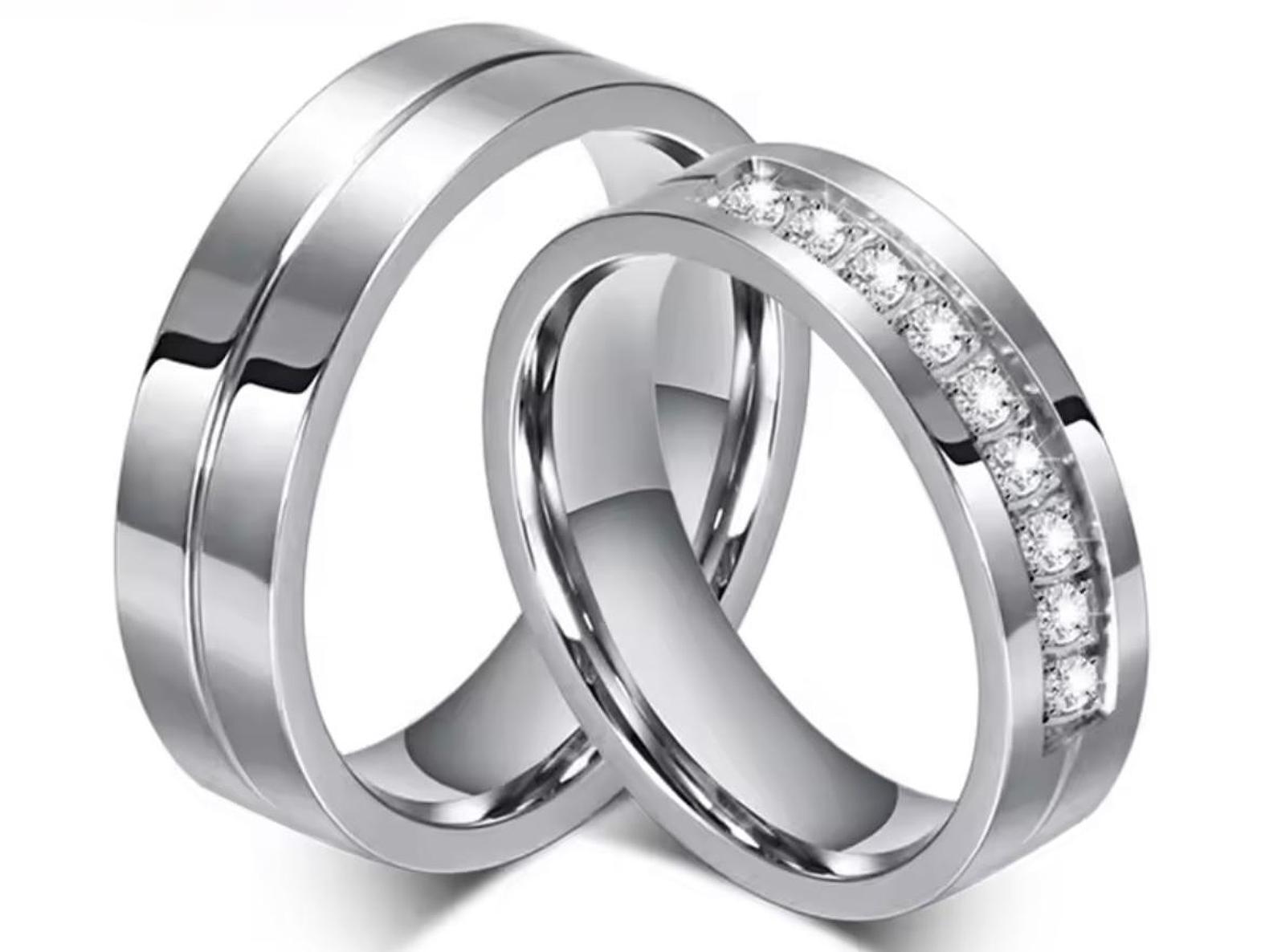 This matching set of wedding bands, available in both gold and silver tones, is crafted from resilient stainless steel for lasting quality. The woman's ring features a brilliant AAA cubic zirconia pave setting, while the man's band offers a sleek, uninterrupted high-polish finish. Men Sizes 7-12, Ladies Sizes 5-9