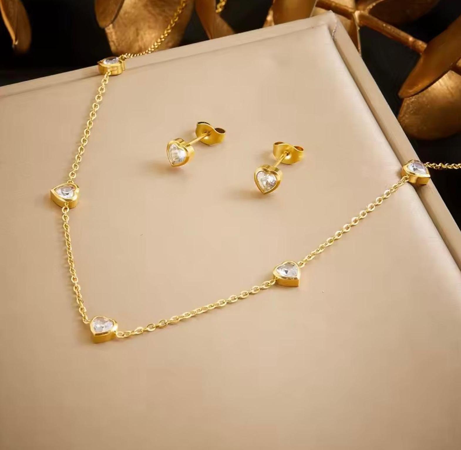 Embrace a look of delicate romance with this shimmering jewelry suite, featuring a constellation of crystal hearts that catch the light with every turn. A radiant choice for those who believe in the beauty of love and fine craftsmanship.
