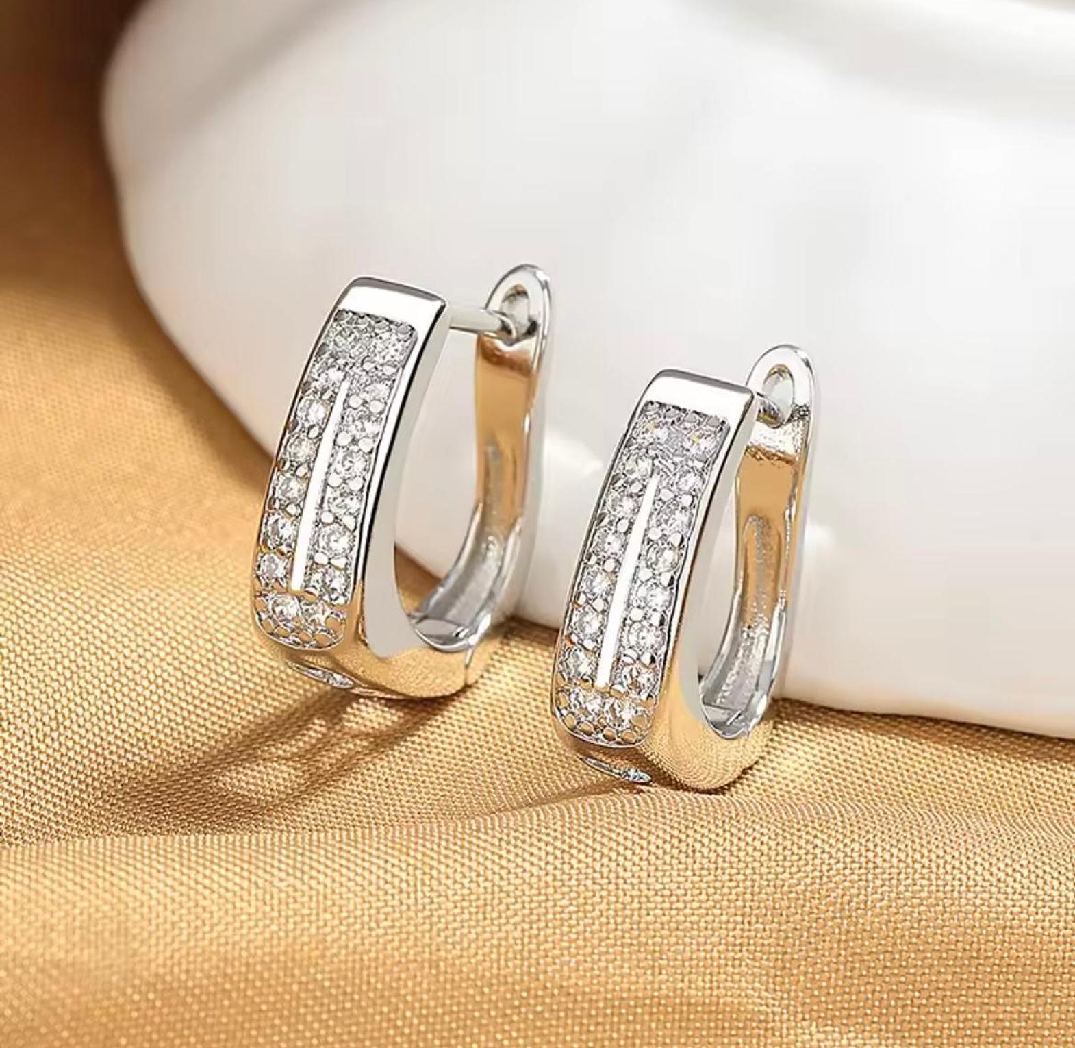 These sleek huggie hoops feature a rectangular front surface detailed with two brilliant, vertical streams of pave-set cubic zirconia. The design offers an elegant, structured sparkle perfect for adding refined texture to any look.