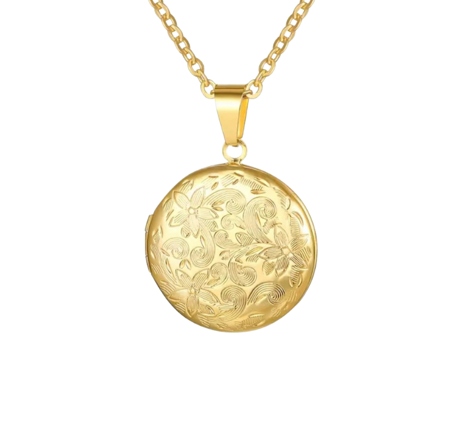 Capture timeless elegance with this beautifully engraved circular locket, featuring an intricate floral scroll pattern. Crafted for durability and sentiment, it’s the perfect heirloom-inspired piece to keep your most precious photographs close to your heart.