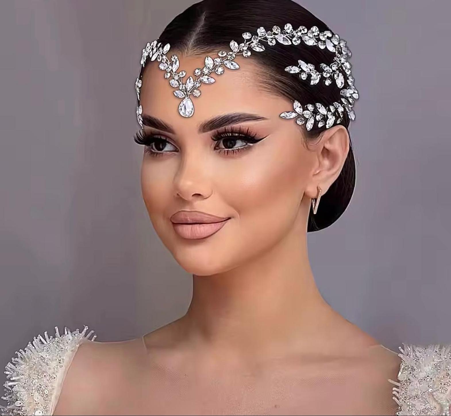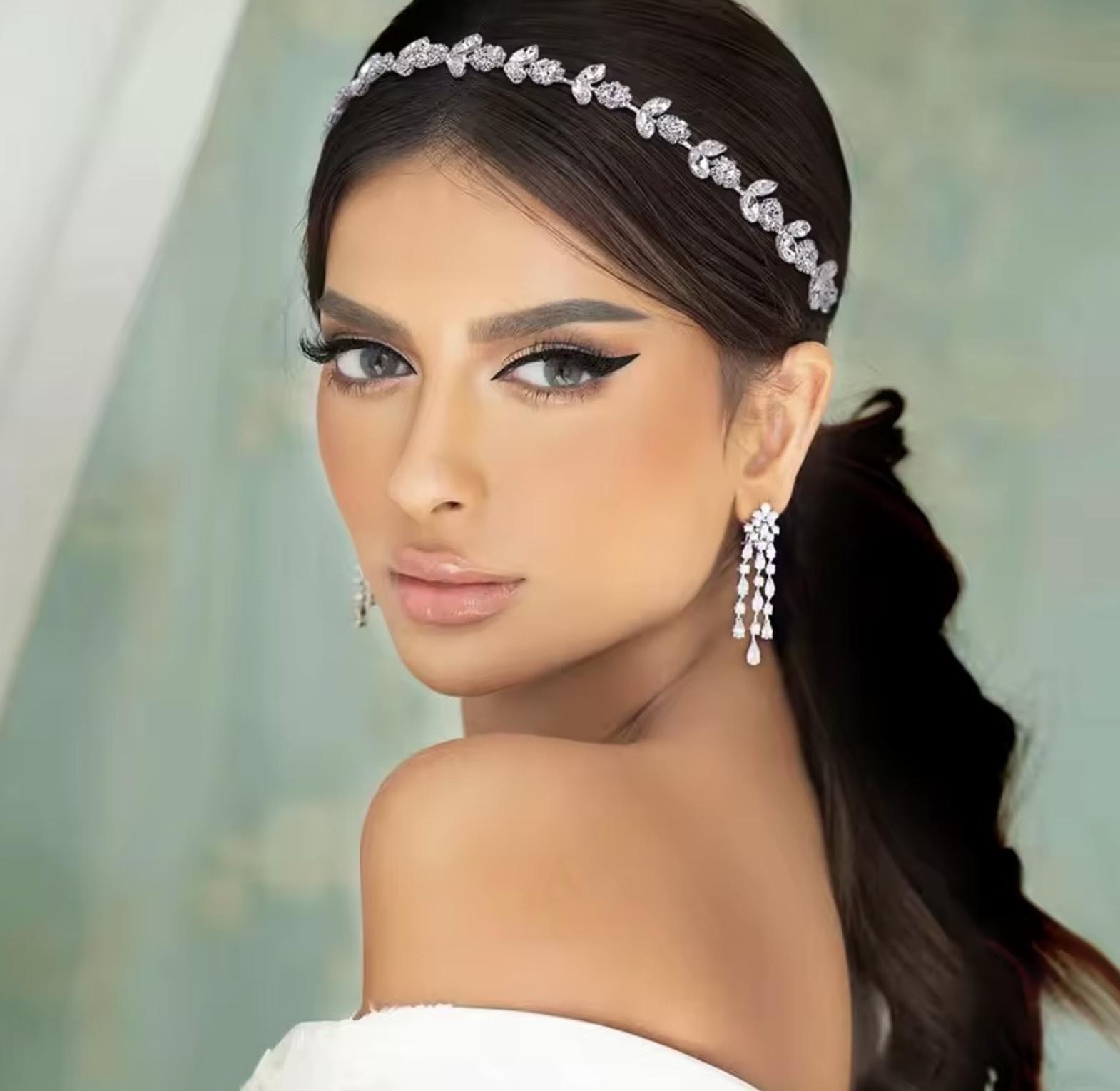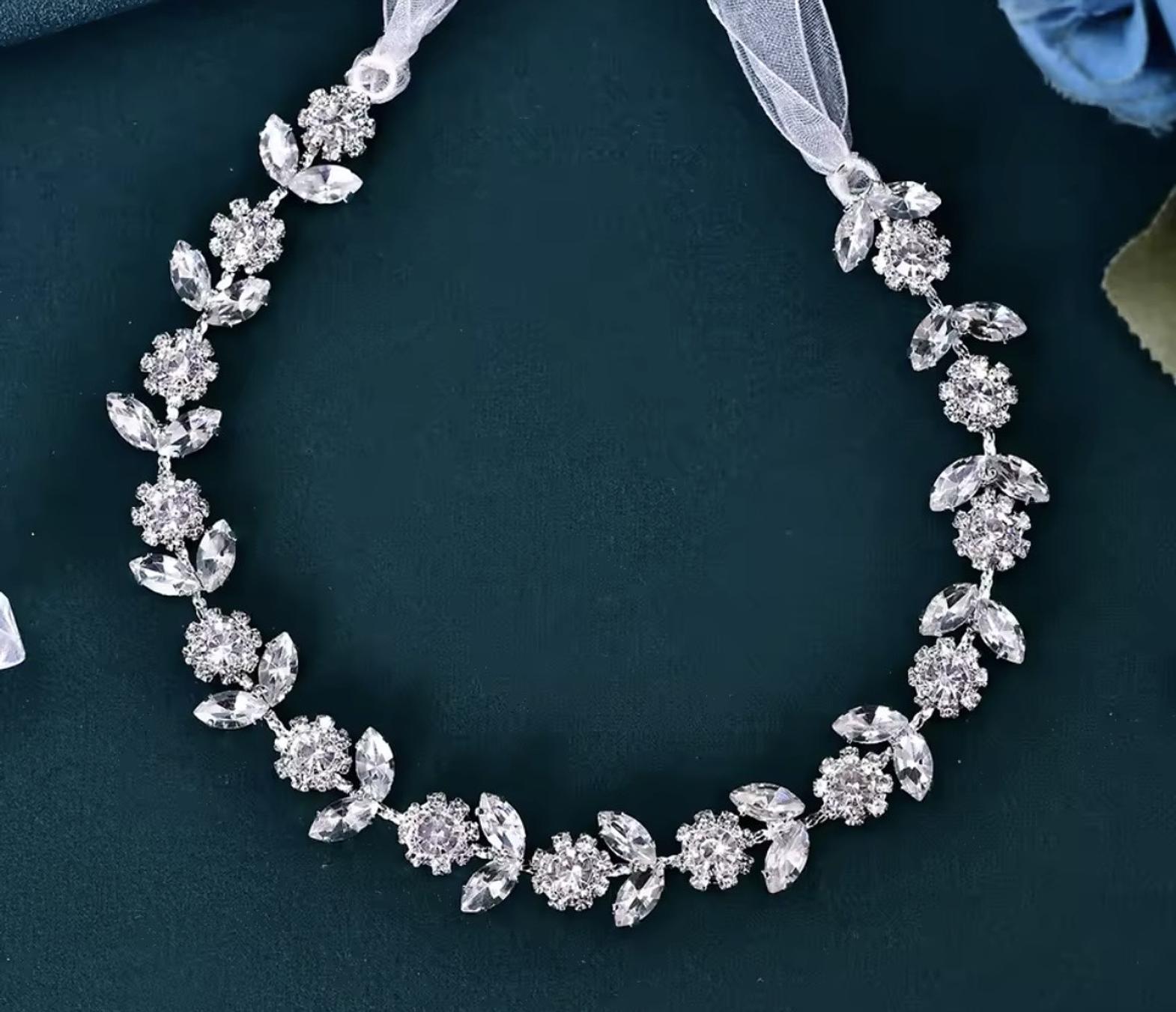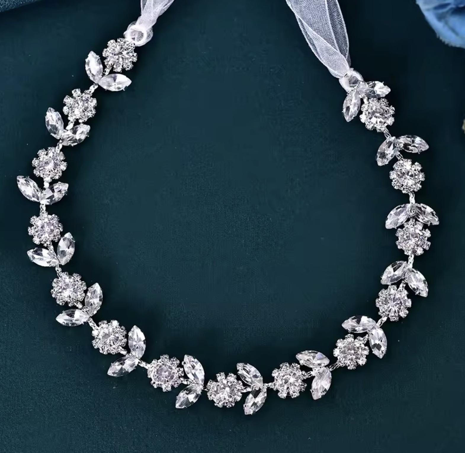 This magnificent, flexible hair vine is intricately detailed with a sweeping leafed pattern, featuring dozens of brilliant, clear crystals. Its versatile design allows it to be worn as an elegant brow band, woven into an updo, or used as a sash.