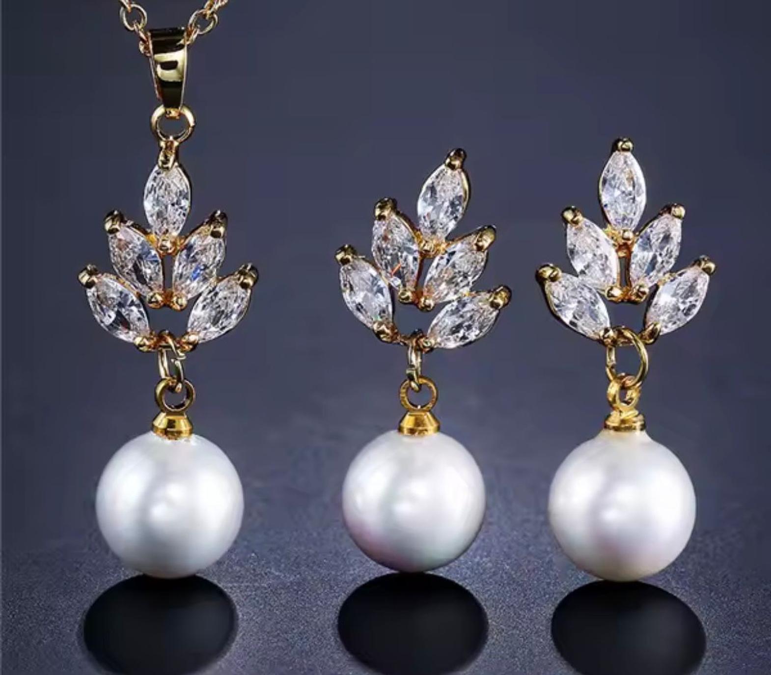 This breathtaking set features a cluster of marquise-cut stones shaped like delicate leaves, gracefully suspending a lustrous simulated pearl. It is a harmonious blend of natural beauty and refined glamour, available in stunning gold or elegant white-colored metal finishes.