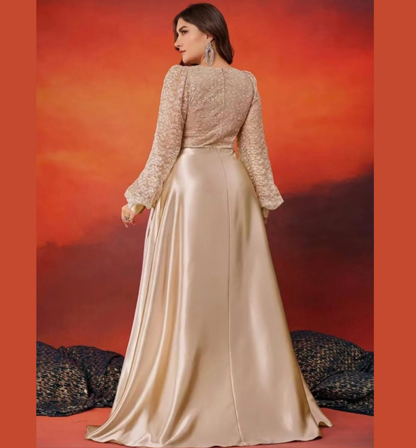 Styling Suggestion: Let the bodice be the star by pairing this gown with simple diamond drop earrings and a metallic gold clutch. Style your hair in soft, side-swept waves to complement the romantic aesthetic of the lace sleeves.