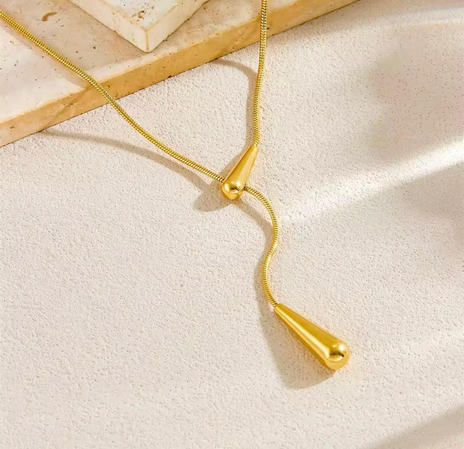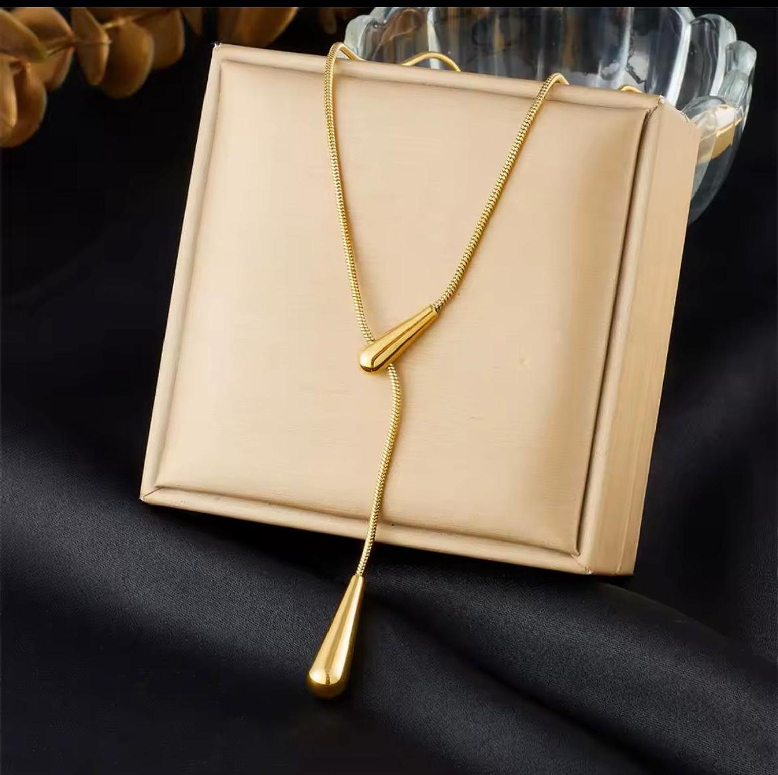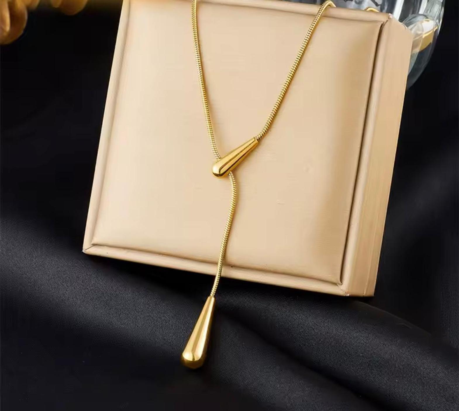 Elevate your silhouette with the fluid elegance of this golden lariat, featuring sculptural droplets that dance with every movement. A captivating statement of modern luxury designed for the woman who appreciates refined, effortless style.