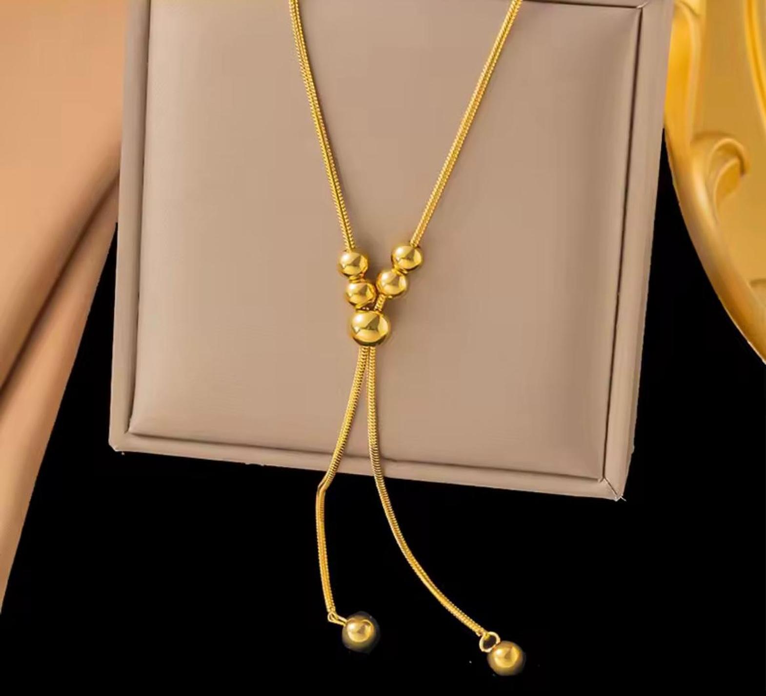 Redefine your silhouette with this stunning golden lariat, where fluid movement meets architectural brilliance. A captivating statement piece designed to trail elegantly and capture every eye in the room.