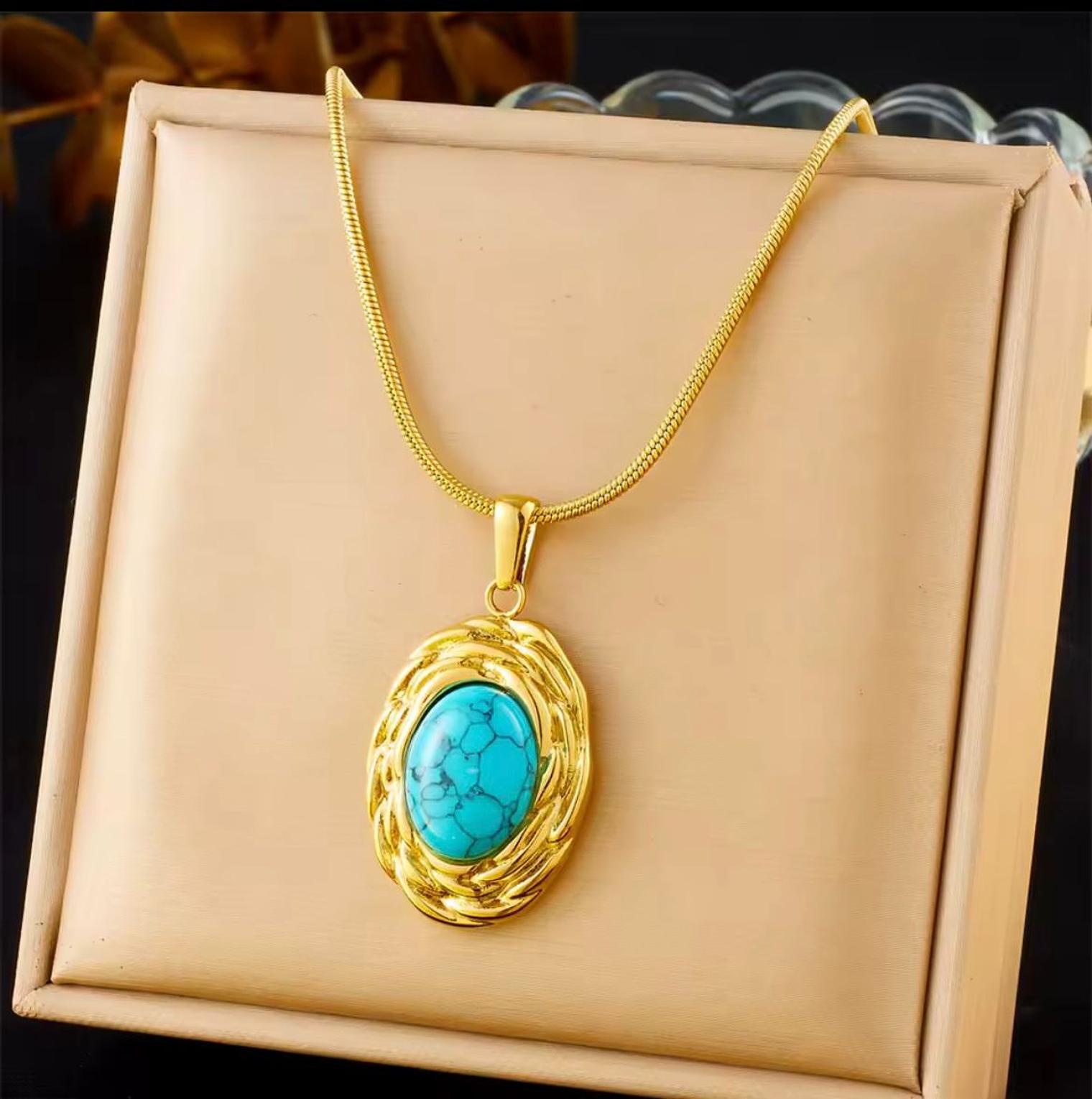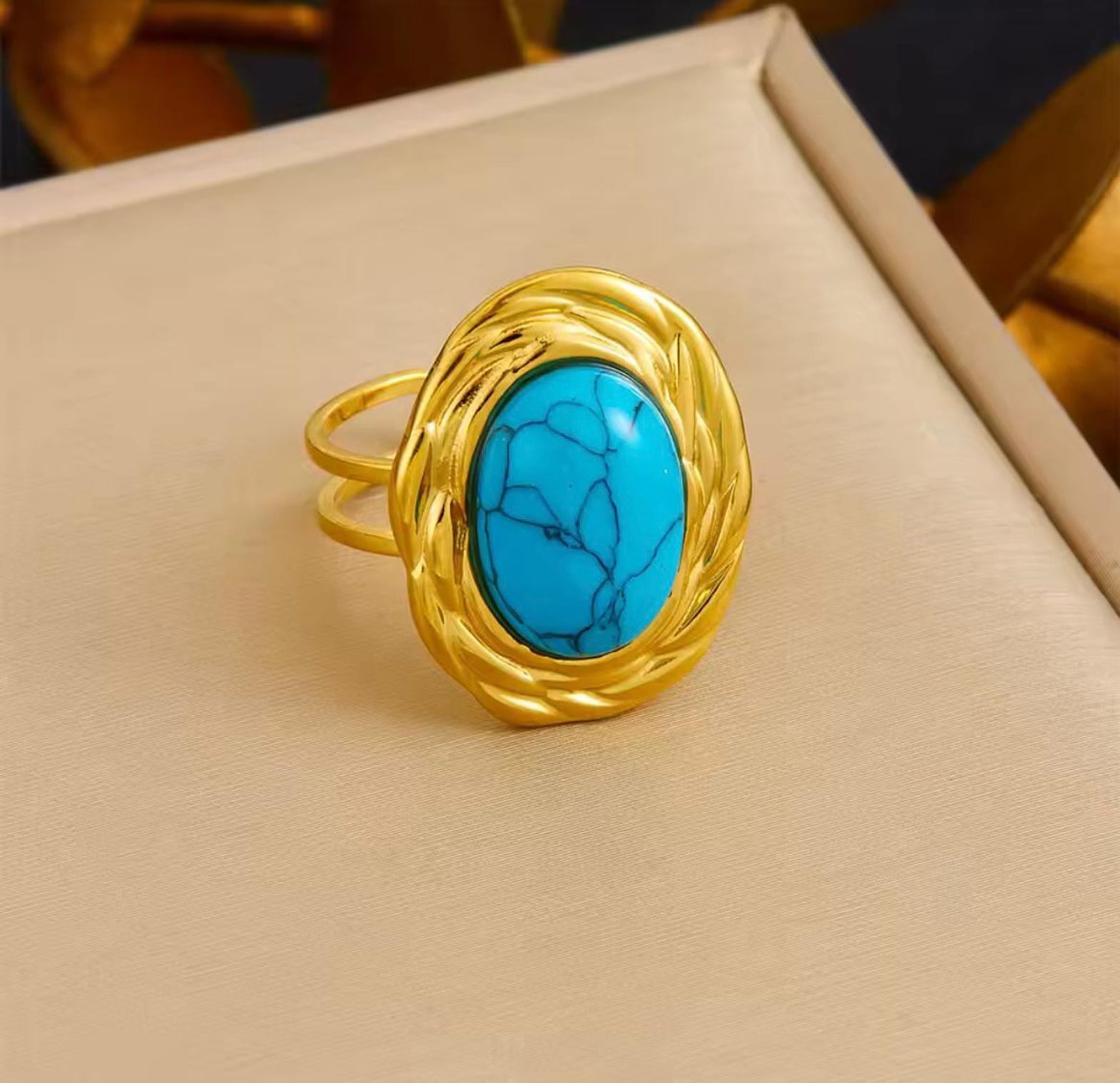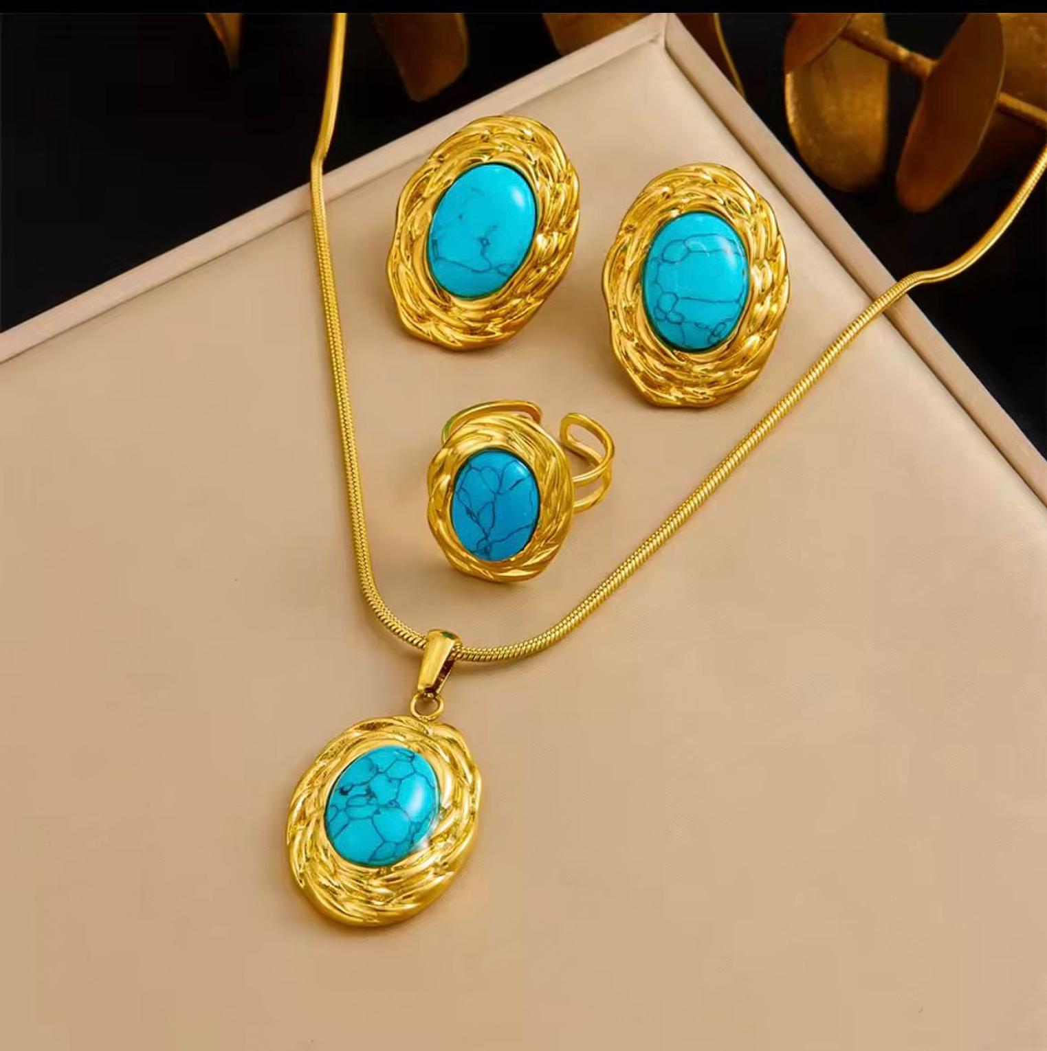 Embrace a look of timeless coastal elegance with this beautifully crafted three-piece set, featuring a matching pendant necklace, stud earrings, and an adjustable statement ring. At the heart of each piece lies a vivid, oval-cut turquoise stone, celebrated for its unique marbled veining and serene blue hue. Each stone is nestled within an intricately textured, swirling gold border that mimics the organic patterns of woven silk, creating a stunning contrast between the earthy gemstone and the radiant metallic finish.