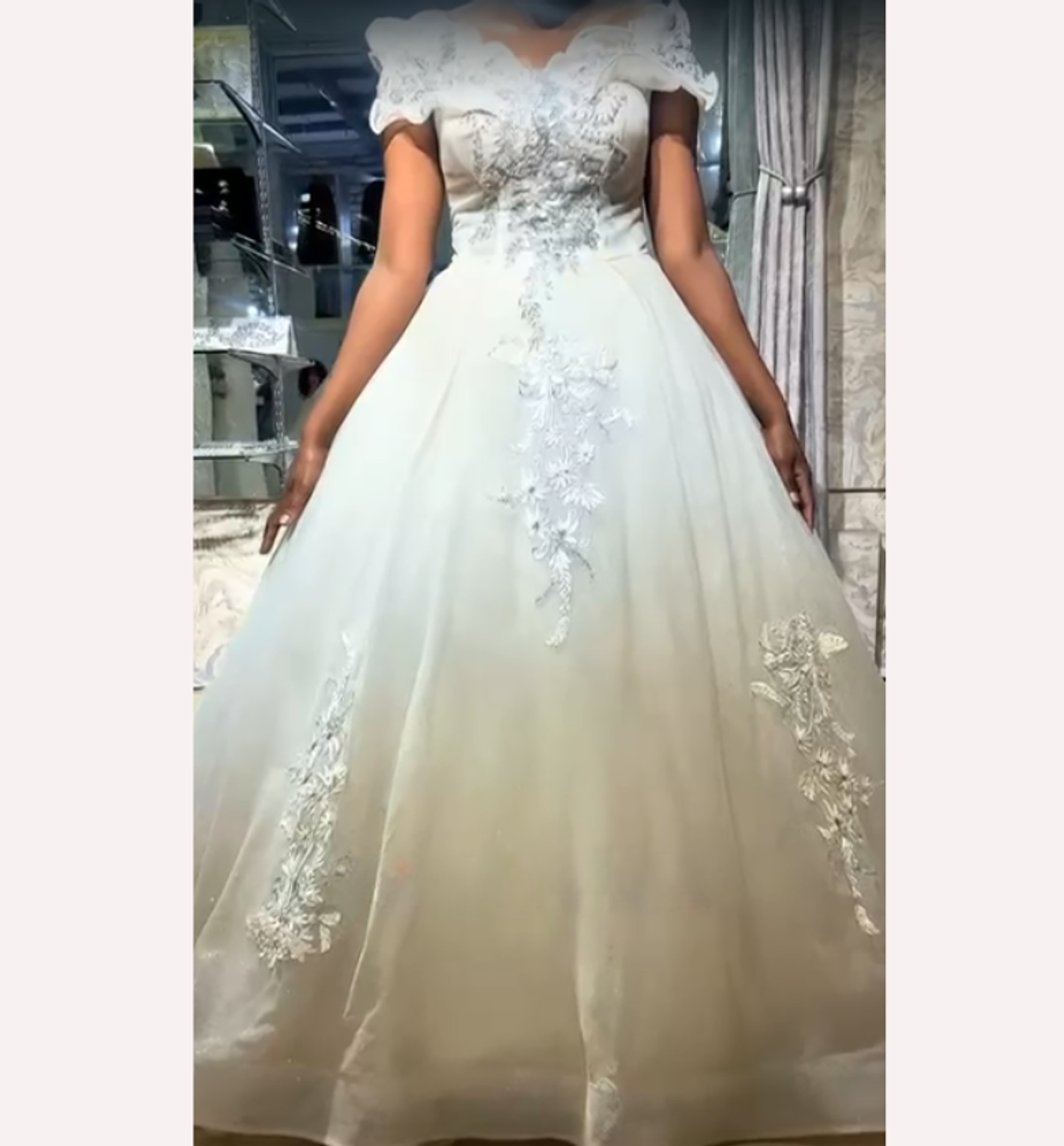 Embrace unparalleled romance in this stunning white gown, featuring a classic off-shoulder neckline and intricate silver-and-white floral embroidery cascading down the bodice and skirt. It's a timeless piece designed for the bride who desires both glamour and delicate artistry.