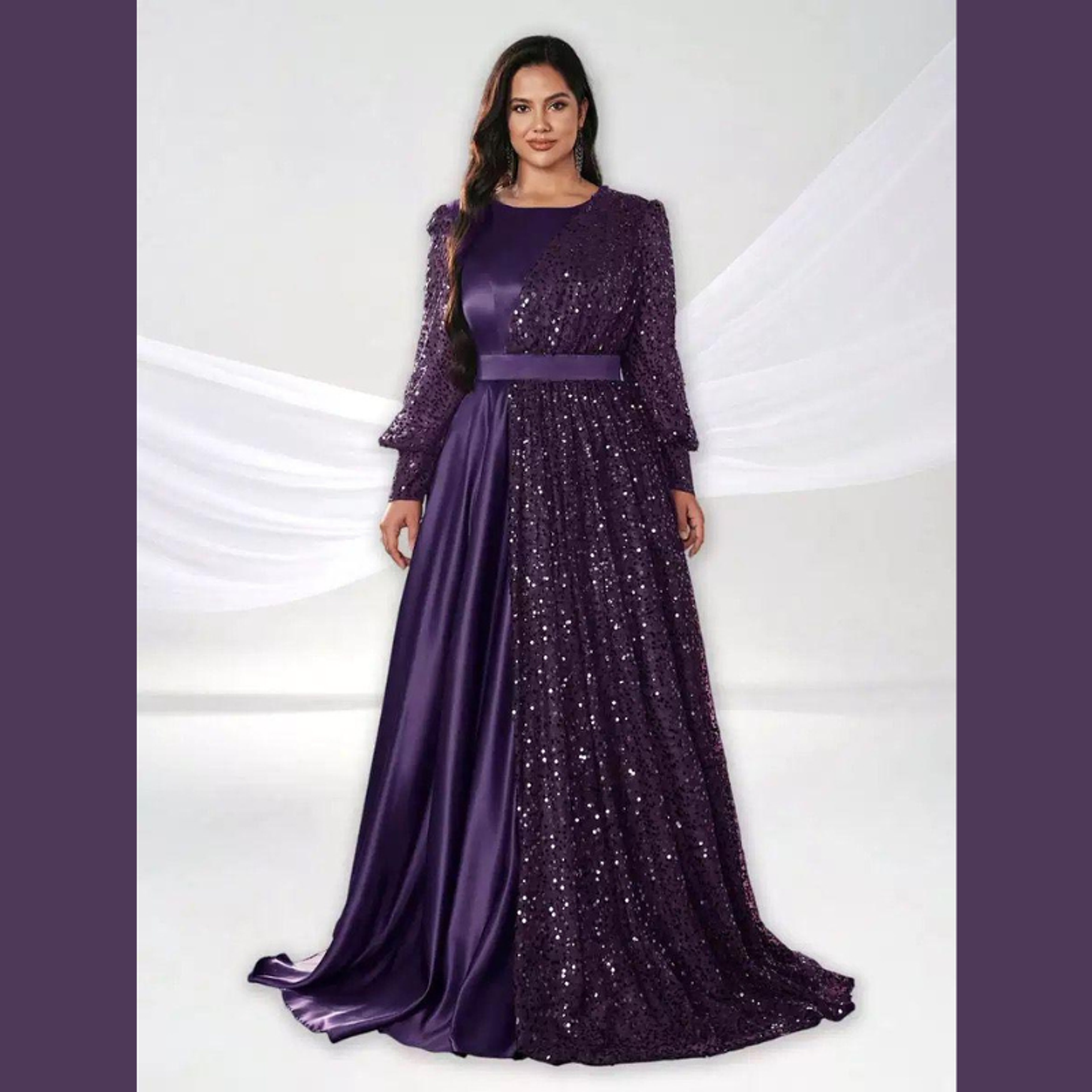 This majestic A-line gown, in a warm champagne hue, features a high neckline, a smooth satin skirt, and dramatic sheer sleeves fully embellished with shimmering baroque-style sequins. It offers a sophisticated, regal silhouette with a touch of glamorous texture.
