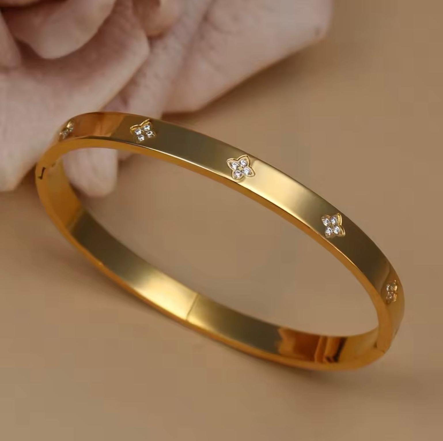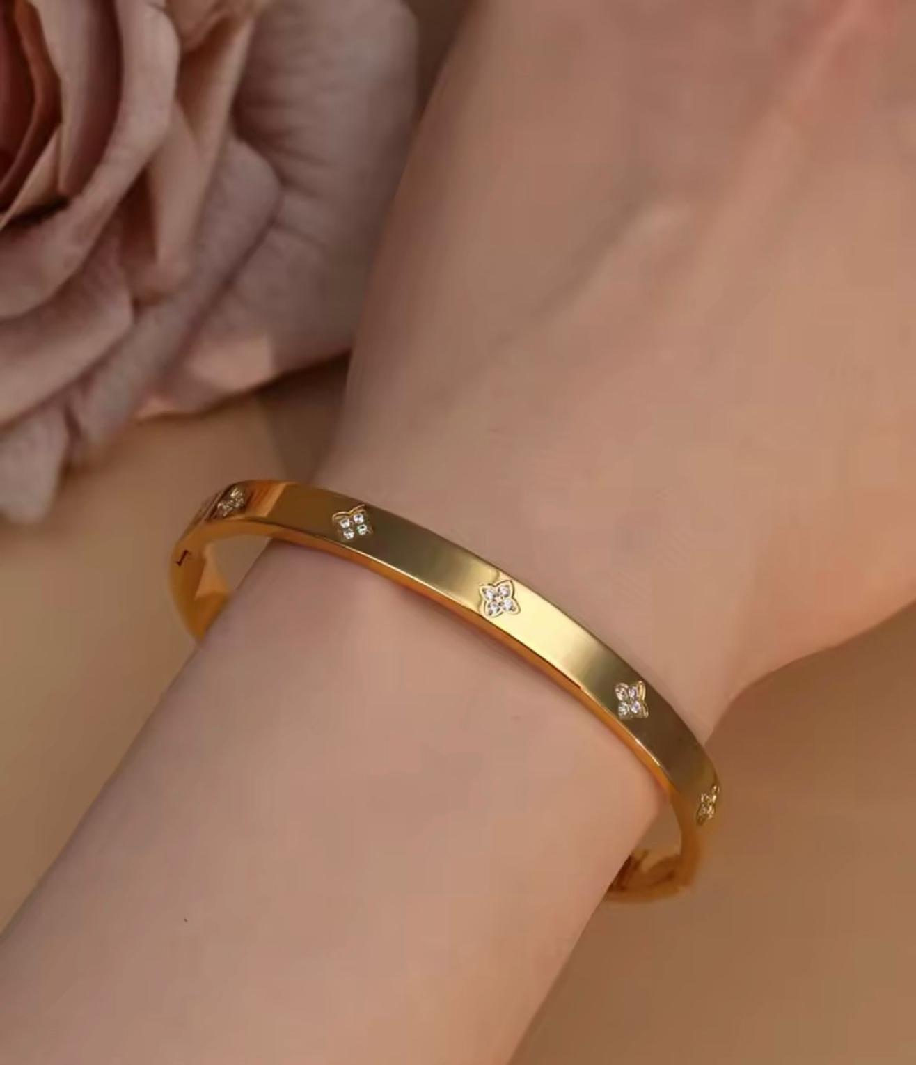 This gorgeous bracelet features a high-quality gold finish and is adorned with delicate, sparkling clover-shaped pave clusters. The sleek band and charming pattern offer a refined elegance perfect for both casual and formal settings.