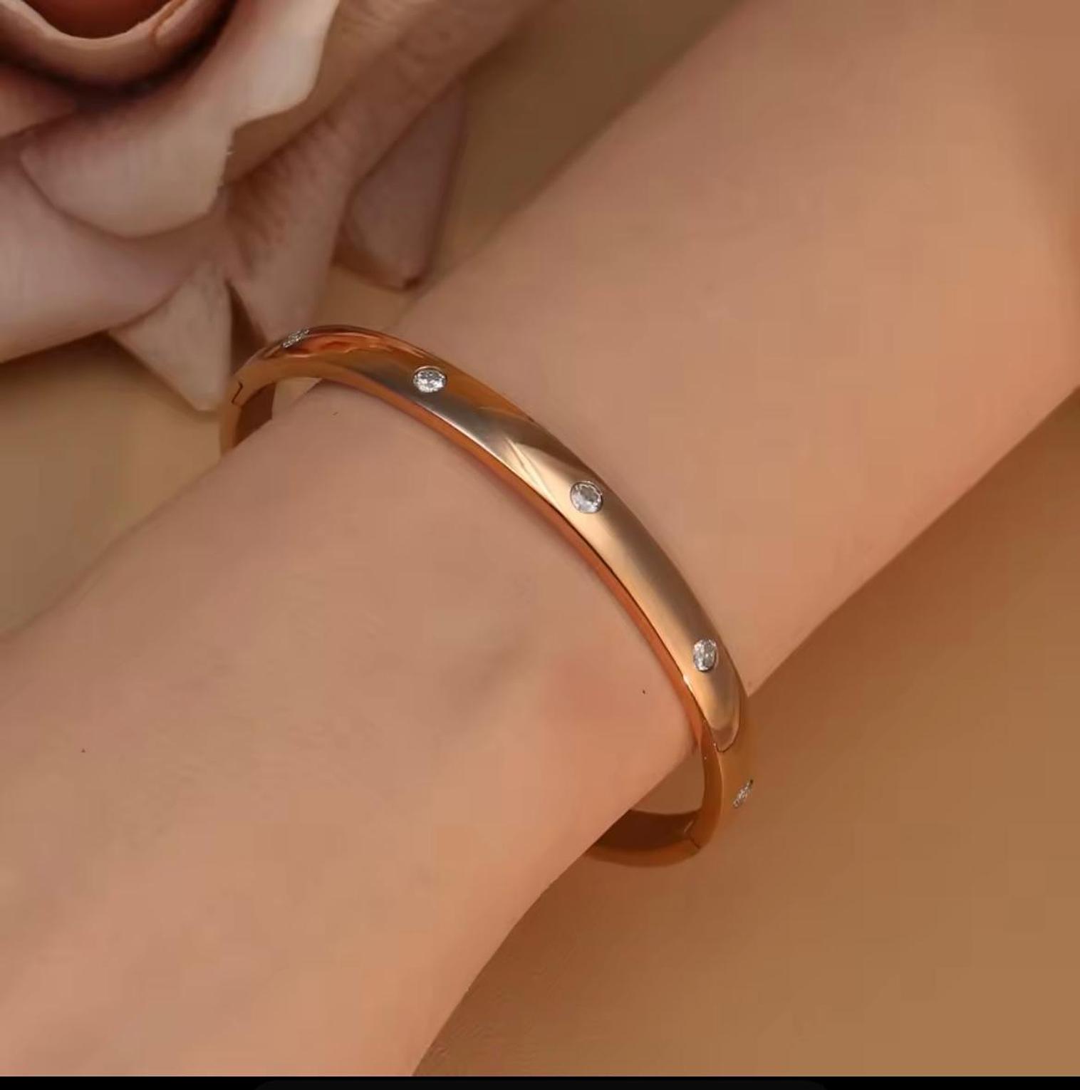 This sleek, rose gold-plated bangle features a delicate scattering of bezel-set cubic zirconia for a subtle, stellar shimmer. Crafted from hypoallergenic materials, this comfortable accessory is perfect for everyday wear, adding a warm, gentle glow to any look.