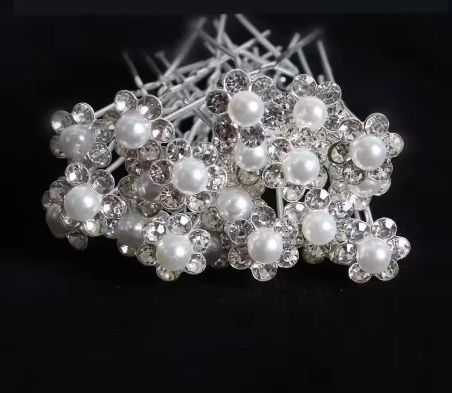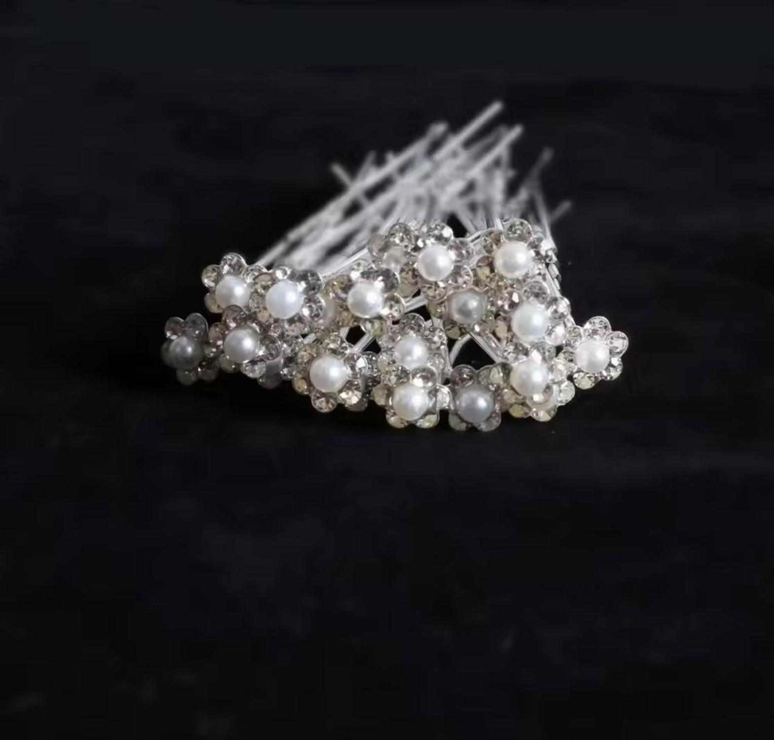 These delicate hair accents feature a luminous central pearl nestled within a sparkling halo of clear-cut crystals, crafted into a charming floral design. They instantly transform any simple hairstyle into an elegant, occasion-ready look. 3 pins for 100