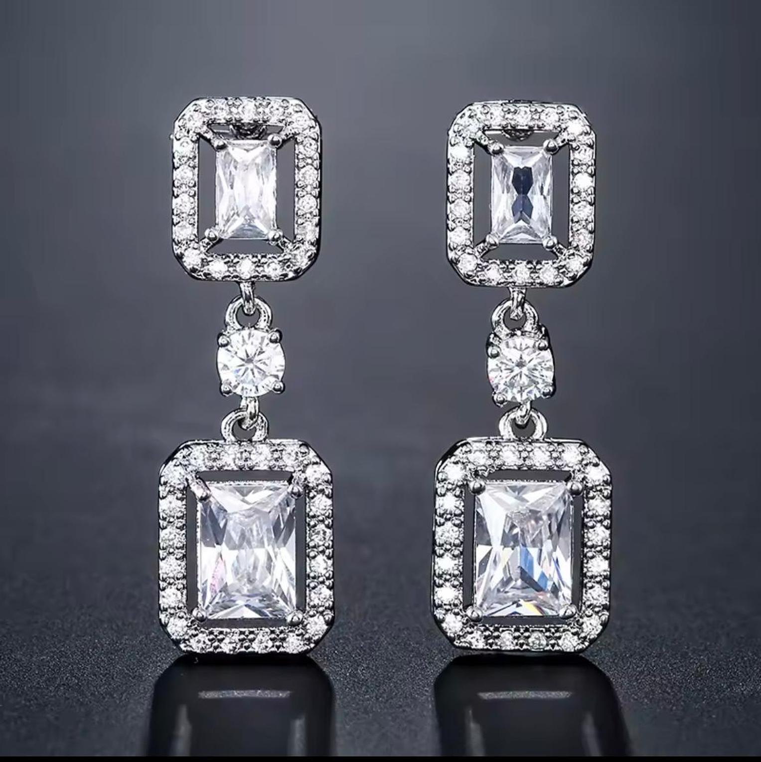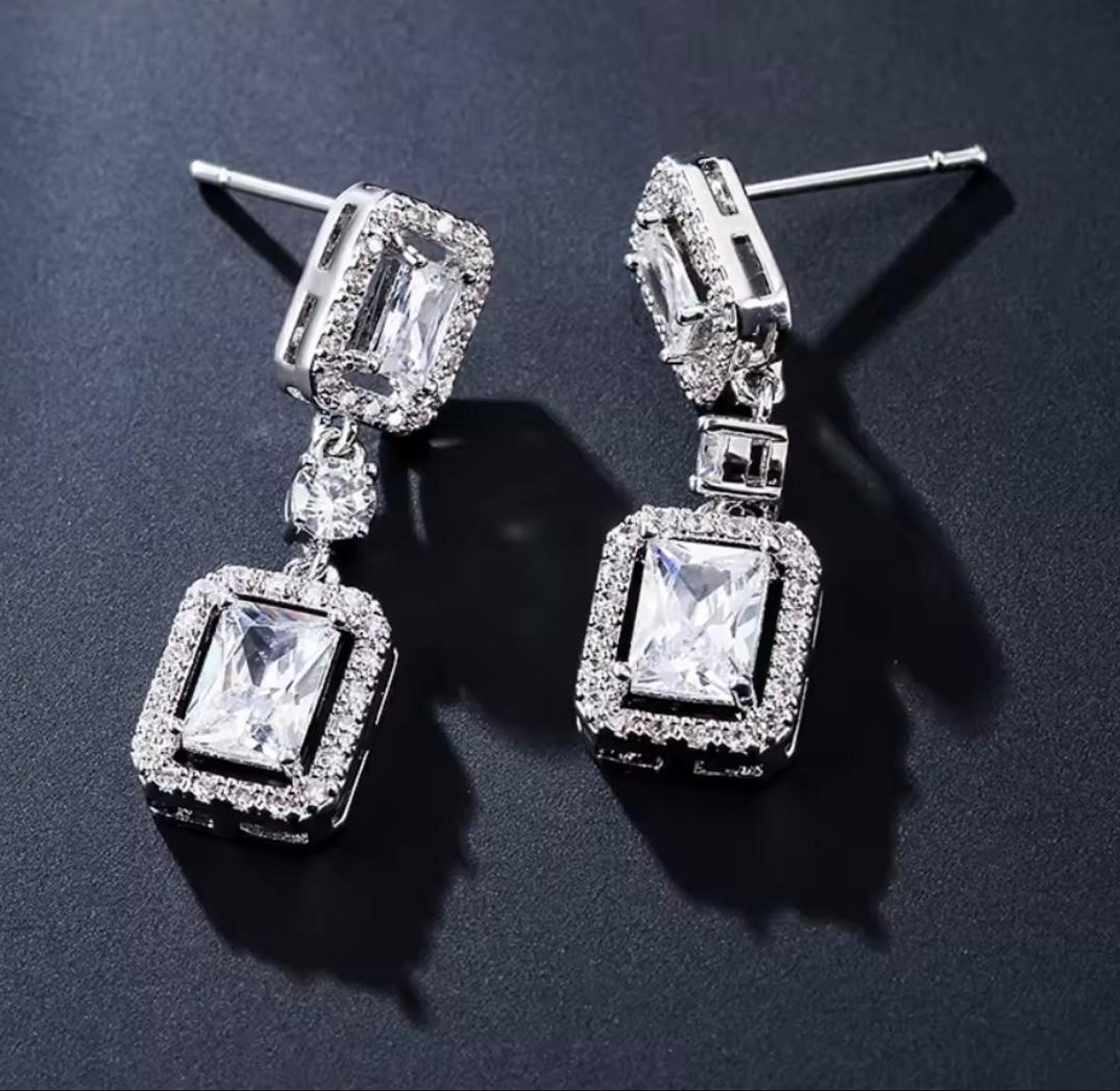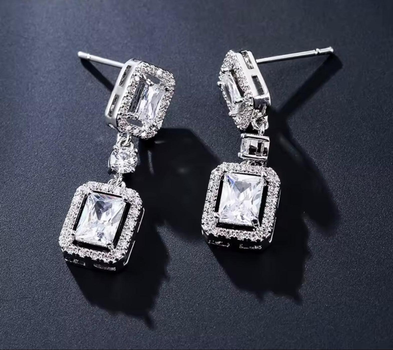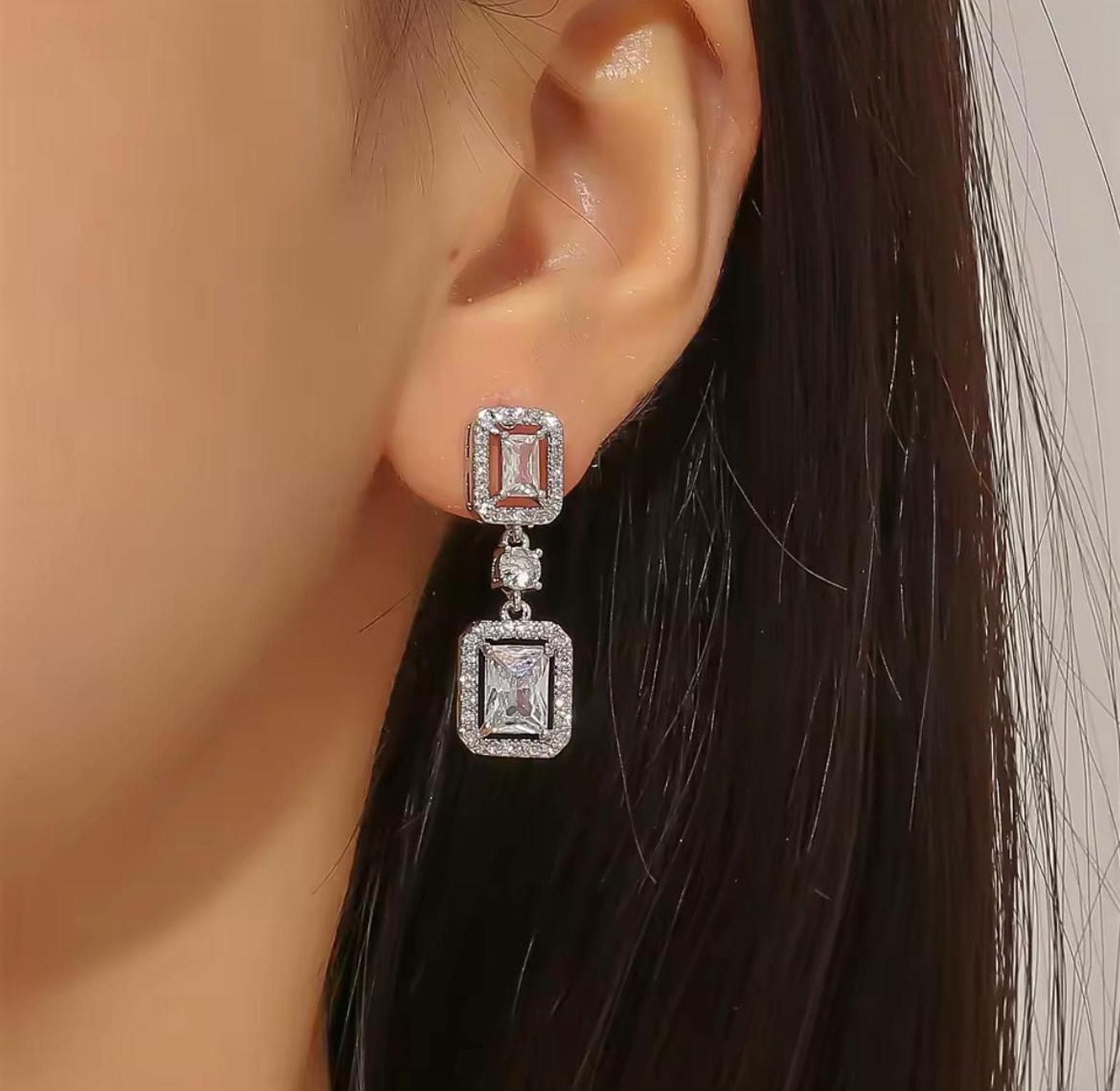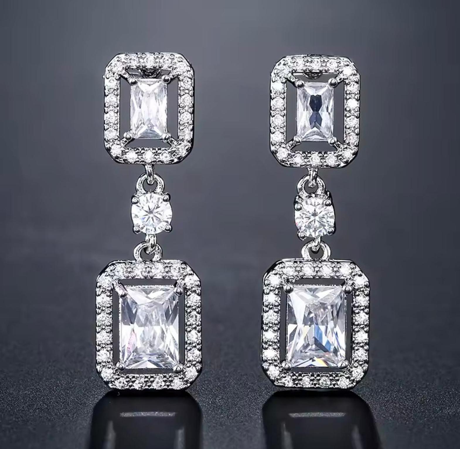 These glamorous drop earrings feature two stunning emerald-cut stones, each framed by a shimmering micro-pave halo for intense sparkle. The art deco-inspired geometric design offers dramatic elegance and structured brilliance.