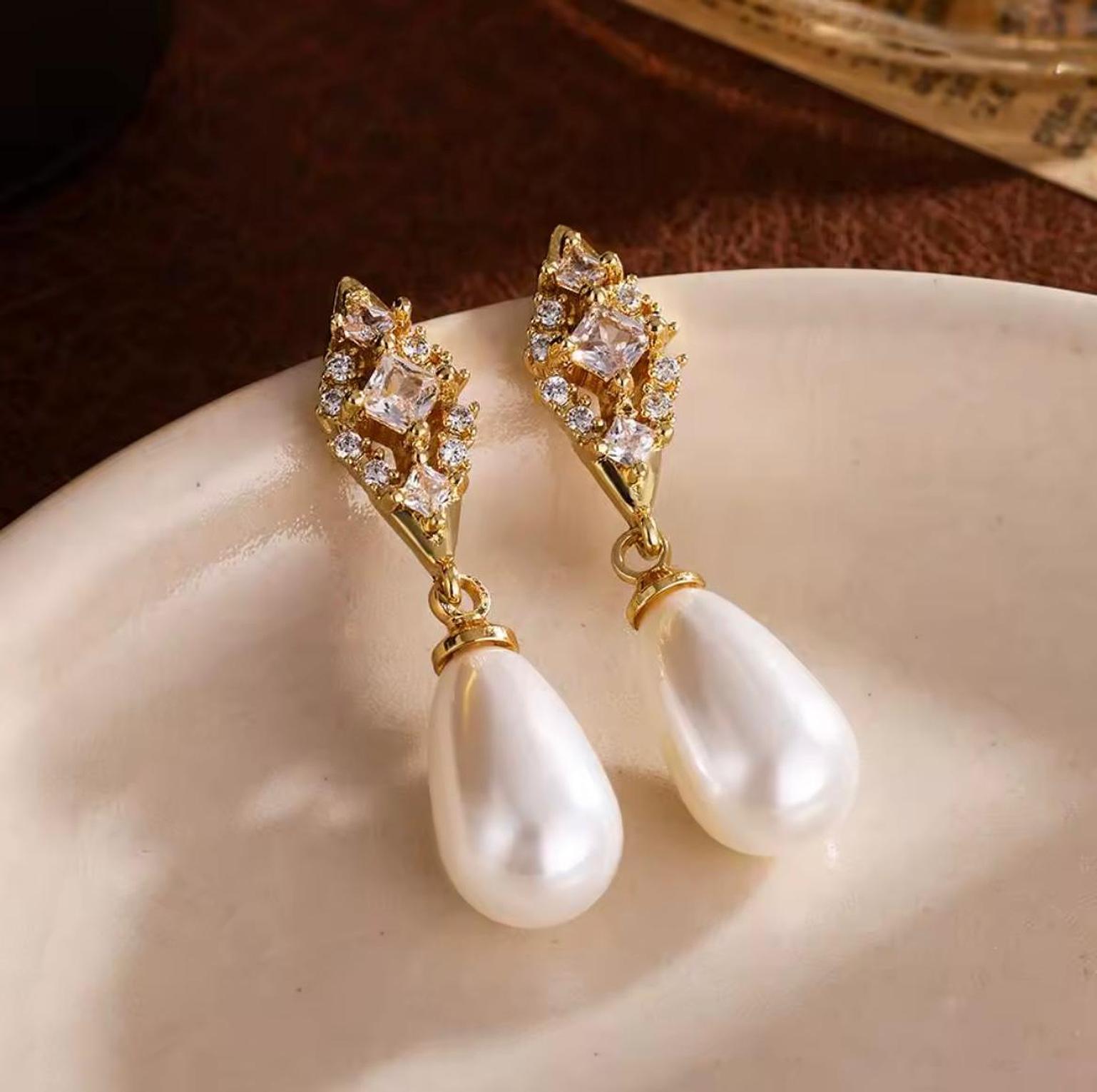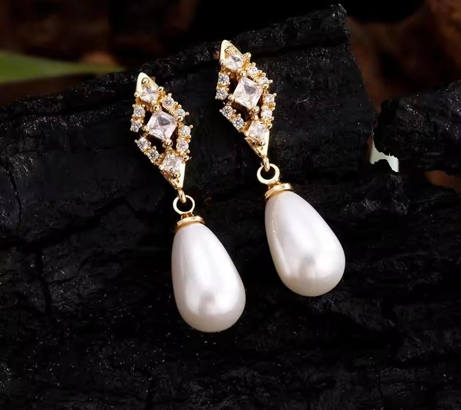 These elegant drop earrings pair a brilliant, angular diamond-shaped stud with a large, smoothly polished teardrop faux pearl dangle. They offer a perfect mix of contemporary geometric sparkle and classic pearl luster.