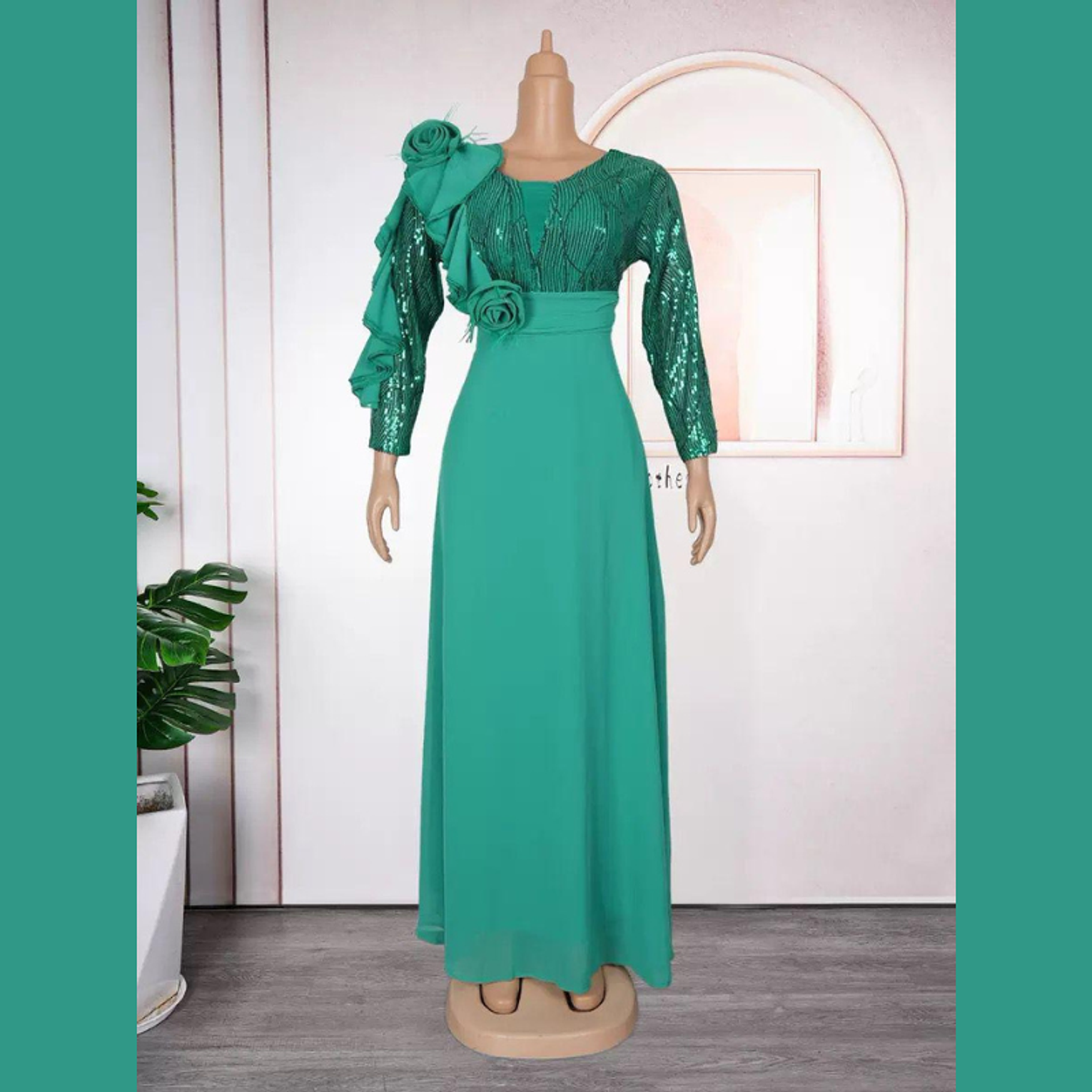 This vibrant emerald gown features a flattering A-line silhouette with a sequined bodice and dramatic three-dimensional floral shoulder accents. It's a striking and unique piece that guarantees an unforgettable, elegant entrance at any sophisticated event.