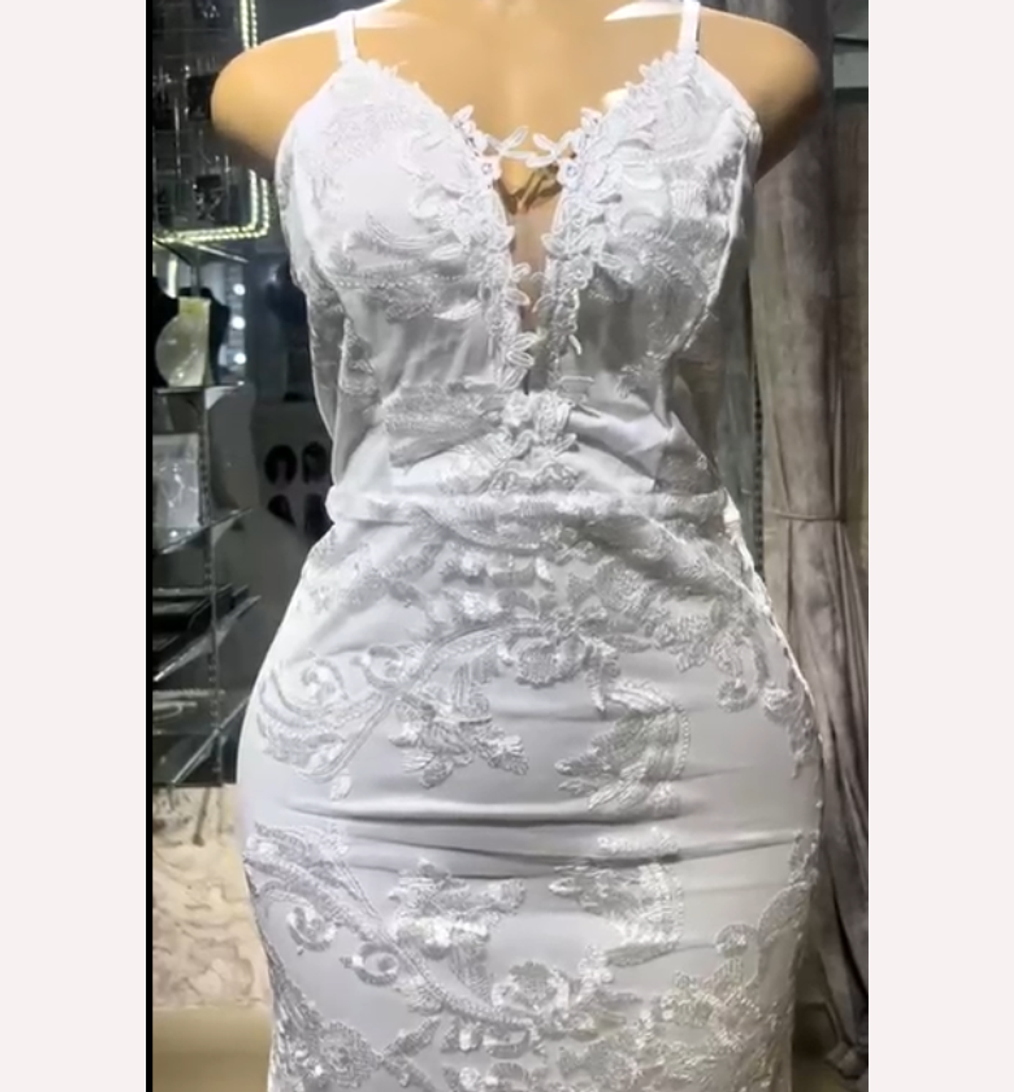 Embrace your figure in this sultry, sleek white gown, featuring delicate spaghetti straps and an intricate lace overlay that accentuates every curve. This dress delivers effortless, high-fashion glamour for the sophisticated, modern bride.