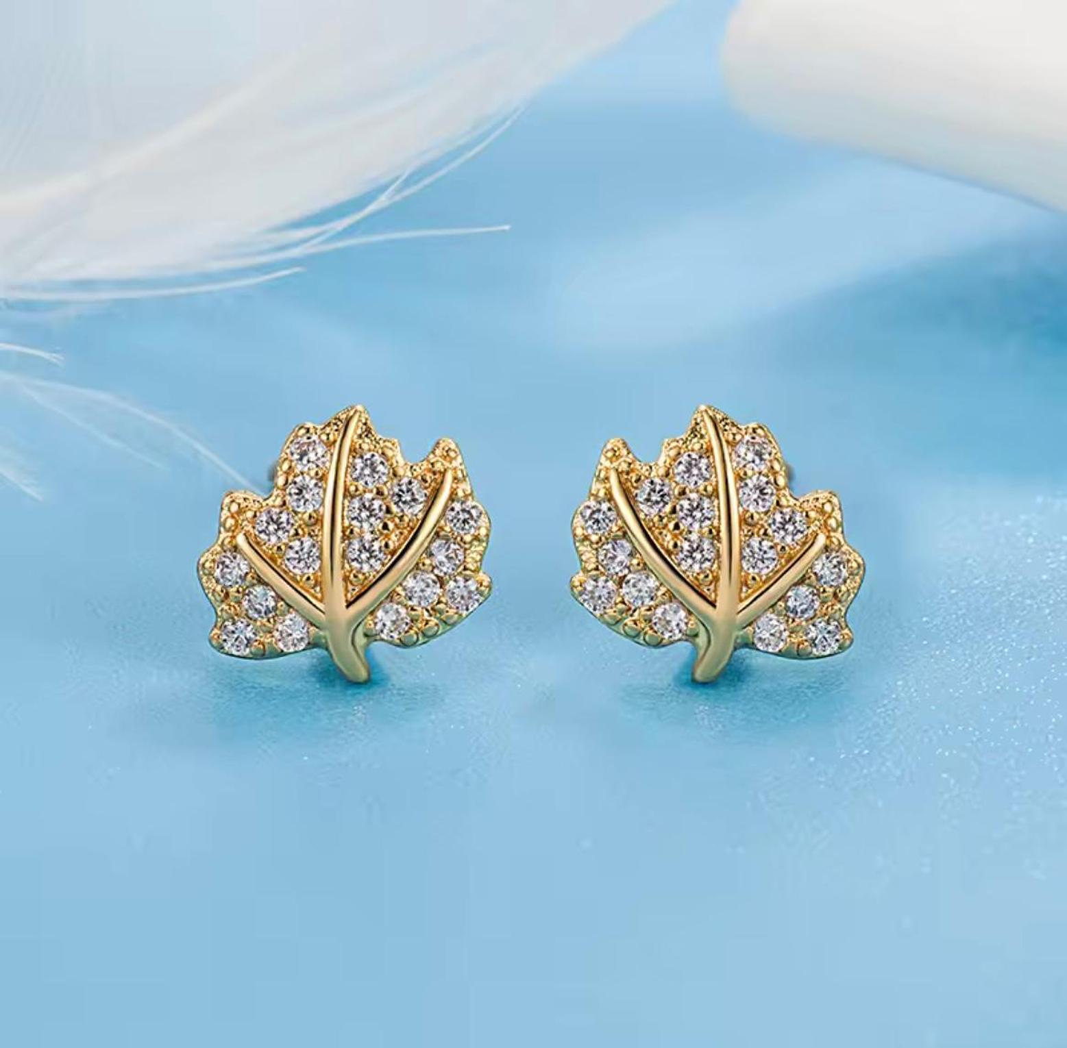 These charming stud earrings are shaped like intricate maple leaves and finished with a rich gold-tone plating for a warm, autumnal glow. The entire surface is covered in brilliant, pavé-set stones that maximize the piece's luxurious sparkle.